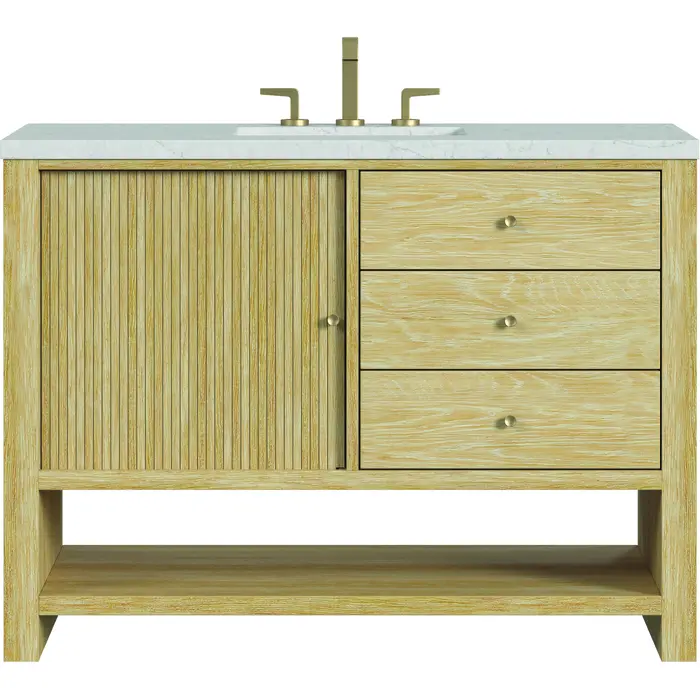 Crafted with precision, the understated waterfall frame of the Marigot 48” Single Vanity is adorned with sliding tambour doors, adding a touch of elegance to its contemporary design. The cerused Sunwashed Oak finish creates a captivating warmth that is accentuated by Champagne Brass hardware. Three full-extension drawers and one tambour door that opens to reveal an interior shelf and drawer provide ample storage while maintaining a sleek profile. The integrated power outlet and a lower shelf makes this vanity incredibly functional. The Eternal Jasmine Pearl Silestone top features an cool white background with subtle marbleized swirls and dark blue-gray veining patterns. Completing the look is the white, rectangular undermount sink. This unit is enabled with FreePower wireless charging; featuring a single-device charger seamlessly embedded into the countertop, indicated by a light-up halo to the left of the sink. Designed for modern living, FreePower offers convenient, integrated, wireless charging when and where you need it.One sliding tambour door, three full-extension exterior drawers, and one internal drawerDrawer boxes feature English Dovetail joinery with premium, soft-close undermount drawer slidesSolid White Oak cabinet features a multi-stage premium finish coat to offer UV and moisture resistanceSunwashed Oak finish with Champagne Brass knobsCountertop is pre-drilled for an 8" widespread faucet; our 3cm eased edge countertops come with white porcelain rectangular sink(s) that ship separately and include mounting brackets for easy installationIntegrated 120V outlet with USB portsDrawers lined with our signature brushed aluminum laminate for easy cleaningRemovable drawer organizer includedFreestanding vanityFreePower Wireless Charging; single-device unit left of sinkFaucet sold separatelyMatching stone backsplash available as add-on purchaseModern minimalism converges with timeless functionality in the Marigot Collection. The understated waterfall frame, embellished with sliding tambour doors, effortlessly blends contemporary design with modern practicality. The captivating warmth of the cerused Sunwashed Oak finish is enhanced by the ribbed detailing of the space-saving tambour doors and the simple Champagne Brass hardware.1 year warranty against manufacturer's defects. We will repair or replace any defective product, if the product is defective in material or workmanship at our discretion. No warranty is expressed or implied regarding damages resulting from consumer misuse.