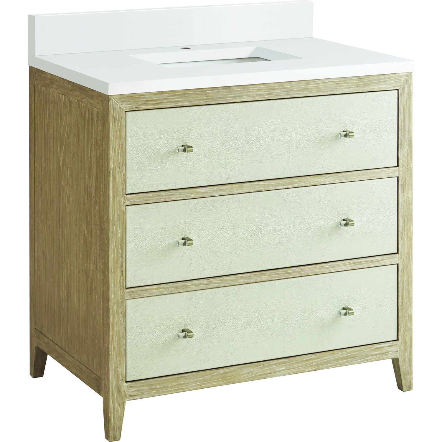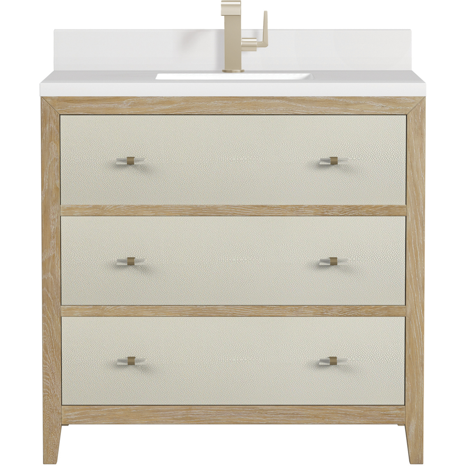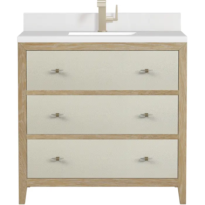 The luxurious Celeste 36" single vanity is a sophisticated statement in style. Featuring embossed shagreen drawer facings complemented by acrylic and brass toggle-style knobs, the vanity boasts a sleek silhouette in a Sunwashed Oak finish. Celeste features three expansive full-extension soft-close drawers to make this vanity as functional as it is beautiful. Vanity set includes a classic White Zeus Silestone top drilled for a single faucet hole, a matching backsplash and undermount sink. Faucet not included.Vanity set includes a 3cm eased edge White Zeus Silestone top with matching backsplash, a white porcelain rectangular sink and mounting brackets for easy installation. Top is pre-drilled for single hole faucet. Faucet not included.Includes one solid Ash removable finish-match drawer organizer lined with our signature aluminum laminateSpacious storage with three large drawersIncludes beautiful acrylic and stainless steel toggle-style knobs in Champagne BrassDrawer boxes feature English Dovetail joinery, premium undermount glides, and brushed aluminum laminate drawer liners for easy cleaningMatching White Zeus 3cm Silestone backsplash included.Faucet sold separatelyThe Celeste Collection is an perfect fusion between modern minimalism and contemporary luxury. The drawers feature embossed shagreen facings with acrylic and brass toggle-style knobs, adding a touch of opulence and texture to the collection. The warm, cerused Sunwashed Oak finish of the French contemporary silhouette frames the expansive drawers, creating an unexpected but elegant blend of beauty and texture.1 year warranty against manufacturer's defects. We will repair or replace any defective product, if the product is defective in material or workmanship at our discretion. No warranty is expressed or implied regarding damages resulting from consumer misuse.