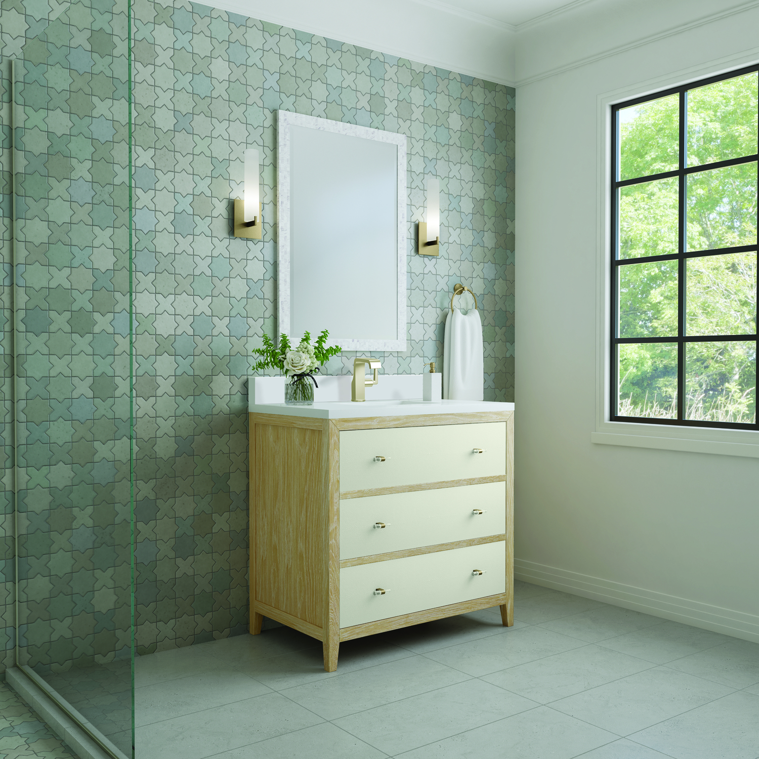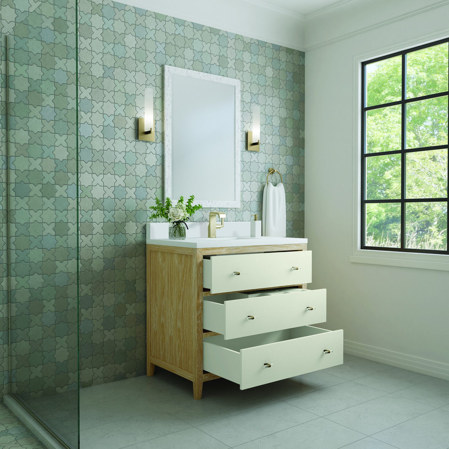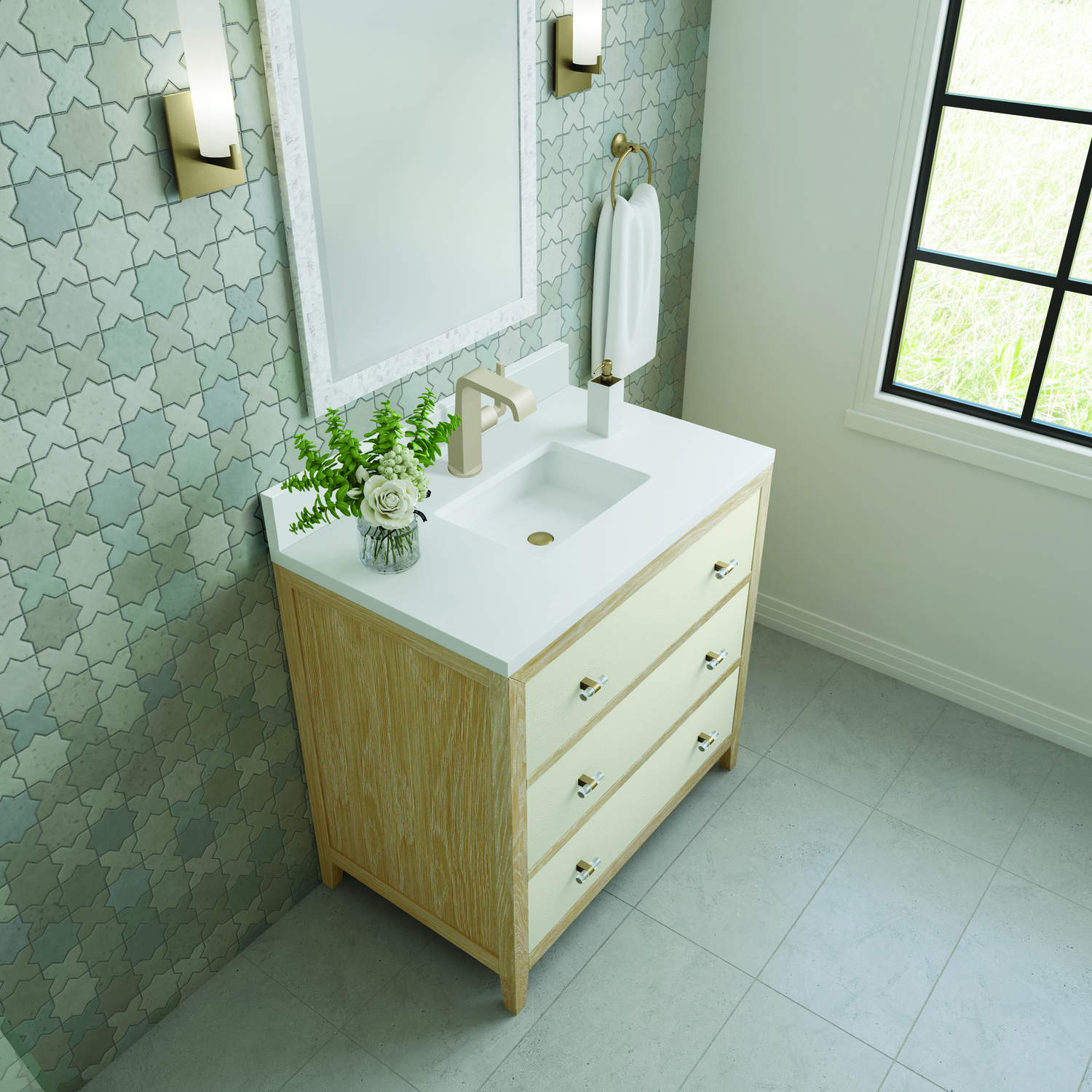 The luxurious Celeste 36" single vanity is a sophisticated statement in style. Featuring embossed shagreen drawer facings complemented by acrylic and brass toggle-style knobs, the vanity boasts a sleek silhouette in a Sunwashed Oak finish. Celeste features three expansive full-extension soft-close drawers to make this vanity as functional as it is beautiful. Vanity set includes a classic White Zeus Silestone top drilled for a single faucet hole, a matching backsplash and undermount sink. Faucet not included.Vanity set includes a 3cm eased edge White Zeus Silestone top with matching backsplash, a white porcelain rectangular sink and mounting brackets for easy installation. Top is pre-drilled for single hole faucet. Faucet not included.Includes one solid Ash removable finish-match drawer organizer lined with our signature aluminum laminateSpacious storage with three large drawersIncludes beautiful acrylic and stainless steel toggle-style knobs in Champagne BrassDrawer boxes feature English Dovetail joinery, premium undermount glides, and brushed aluminum laminate drawer liners for easy cleaningMatching White Zeus 3cm Silestone backsplash included.Faucet sold separatelyThe Celeste Collection is an perfect fusion between modern minimalism and contemporary luxury. The drawers feature embossed shagreen facings with acrylic and brass toggle-style knobs, adding a touch of opulence and texture to the collection. The warm, cerused Sunwashed Oak finish of the French contemporary silhouette frames the expansive drawers, creating an unexpected but elegant blend of beauty and texture.1 year warranty against manufacturer's defects. We will repair or replace any defective product, if the product is defective in material or workmanship at our discretion. No warranty is expressed or implied regarding damages resulting from consumer misuse.