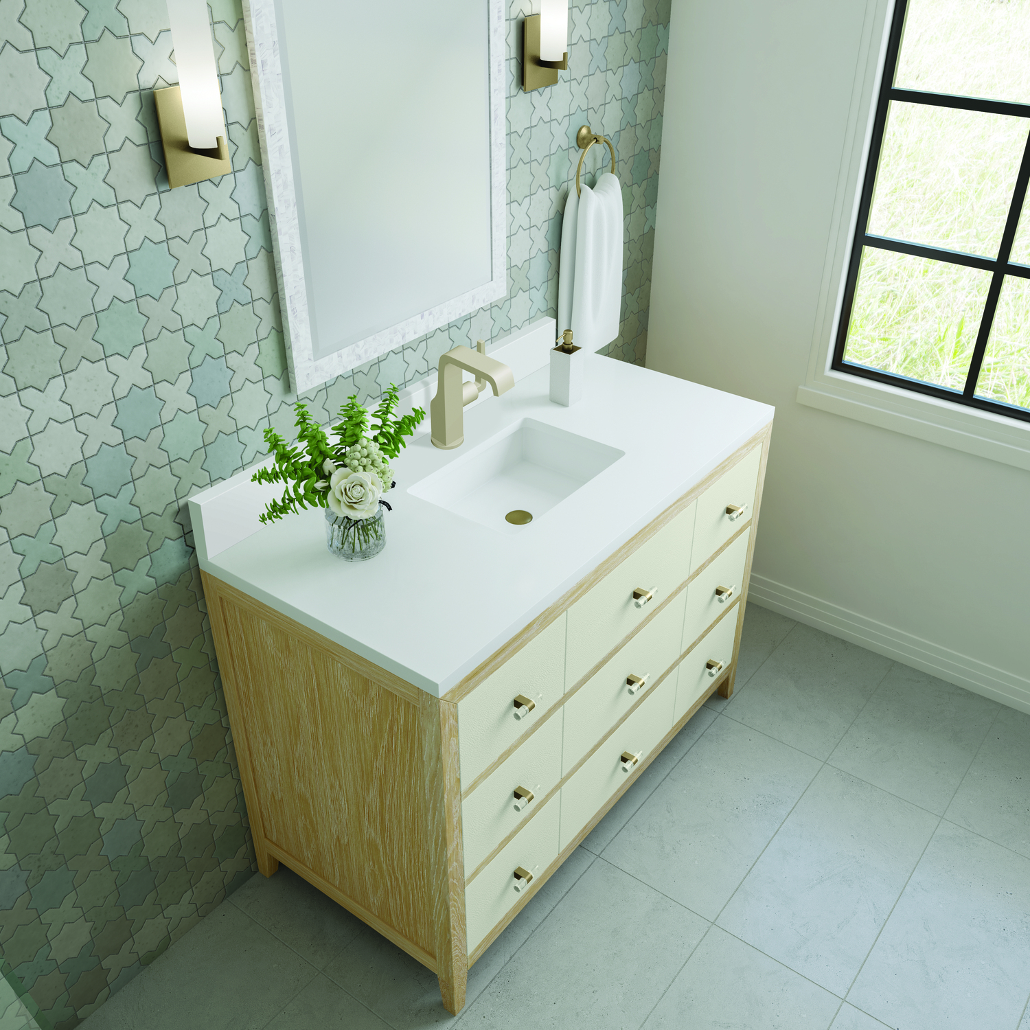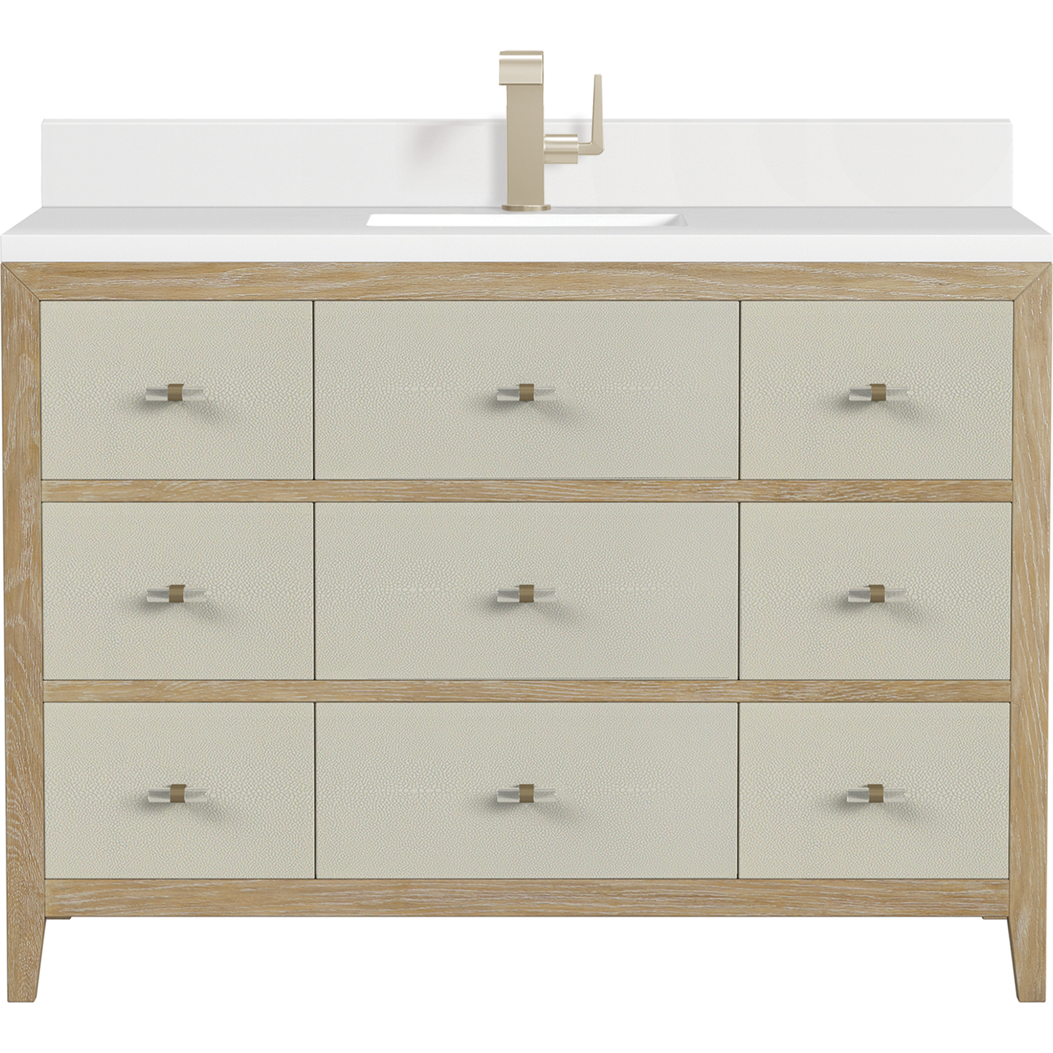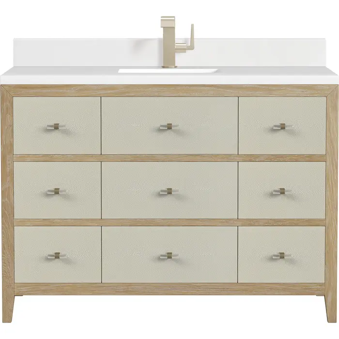 The luxurious Celeste 48" single vanity is a sophisticated statement in style. Featuring embossed shagreen drawer facings complemented by acrylic and brass toggle-style knobs, the vanity boasts a sleek silhouette in a Sunwashed Oak finish. Celeste features a top tip-out drawer and eight full-extension soft-close drawers to make this vanity as functional as it is beautiful. Vanity set includes a classic White Zeus Silestone top drilled for a single faucet hole, a matching backsplash and undermount sink. Faucet not included.Vanity set includes a 3cm eased edge White Zeus Silestone top with matching backsplash, a white porcelain rectangular sink and mounting brackets for easy installation. Top is pre-drilled for single hole faucet. Faucet not included.Includes one solid Ash removable finish-match drawer organizer lined with our signature aluminum laminateSpacious storage with one tip-out and eight drawersIncludes beautiful acrylic and stainless steel toggle-style knobs in Champagne BrassDrawer boxes feature English Dovetail joinery, premium undermount glides, and brushed aluminum laminate drawer liners for easy cleaningMatching White Zeus 3cm Silestone backsplash included.Faucet sold separatelyThe Celeste Collection is an perfect fusion between modern minimalism and contemporary luxury. The drawers feature embossed shagreen facings with acrylic and brass toggle-style knobs, adding a touch of opulence and texture to the collection. The warm, cerused Sunwashed Oak finish of the French contemporary silhouette frames the expansive drawers, creating an unexpected but elegant blend of beauty and texture.1 year warranty against manufacturer's defects. We will repair or replace any defective product, if the product is defective in material or workmanship at our discretion. No warranty is expressed or implied regarding damages resulting from consumer misuse.