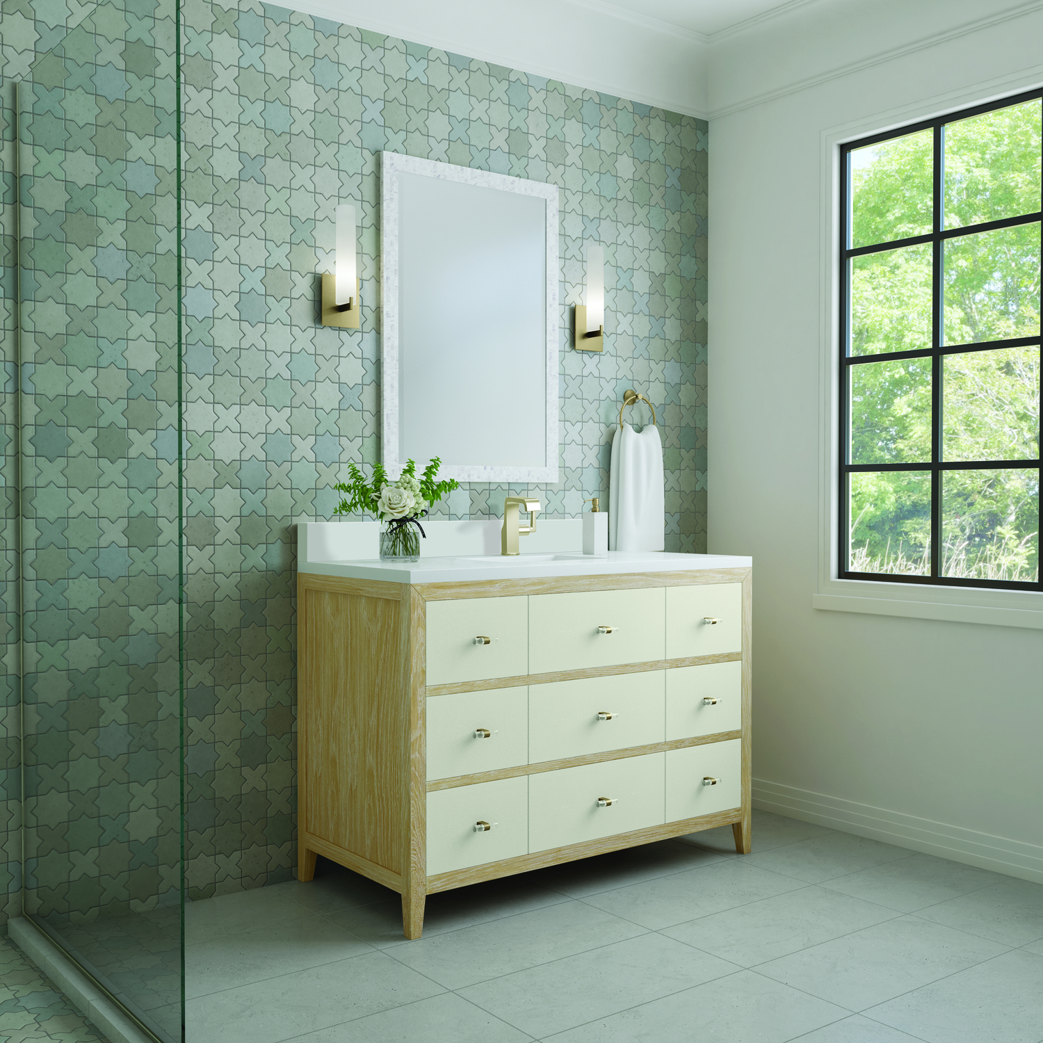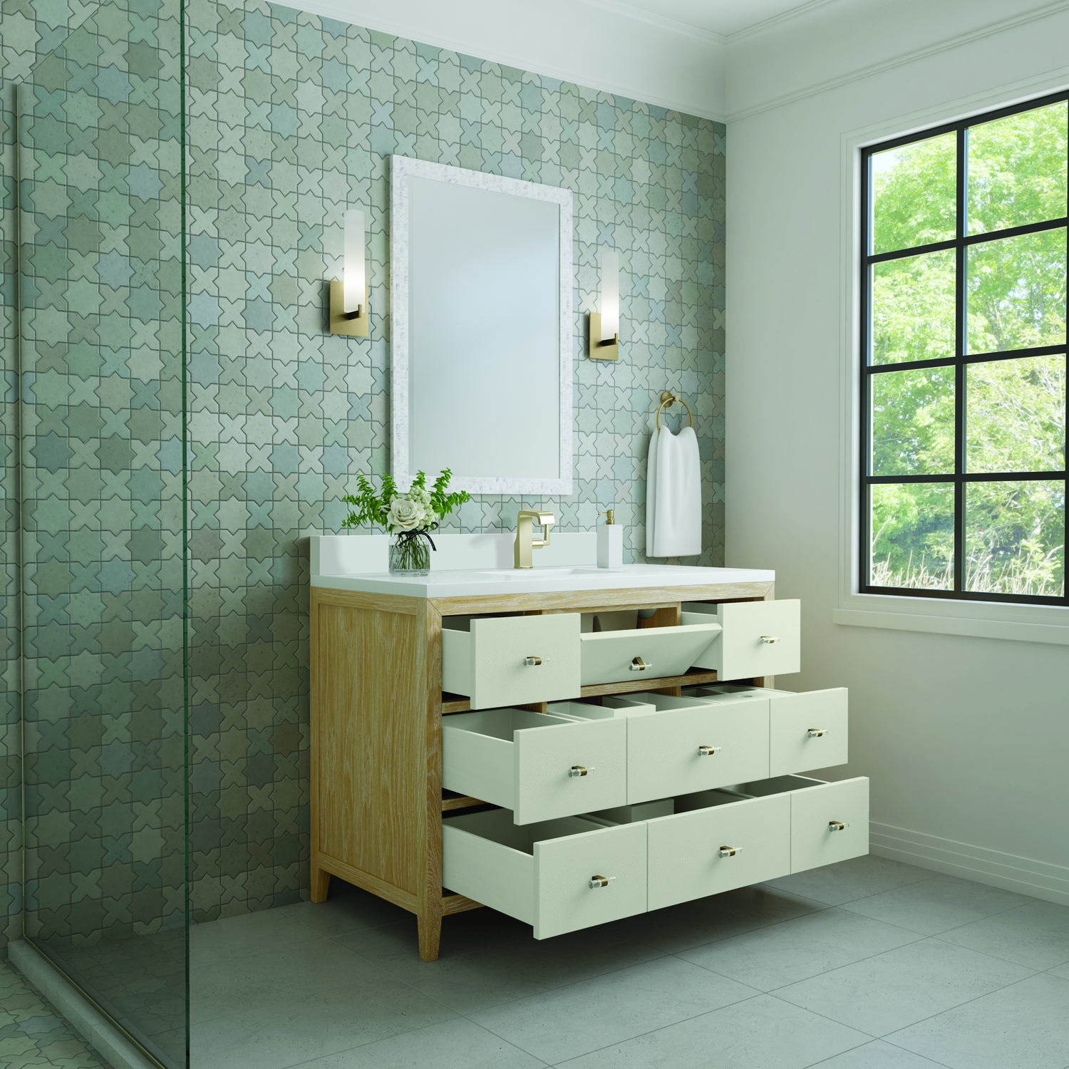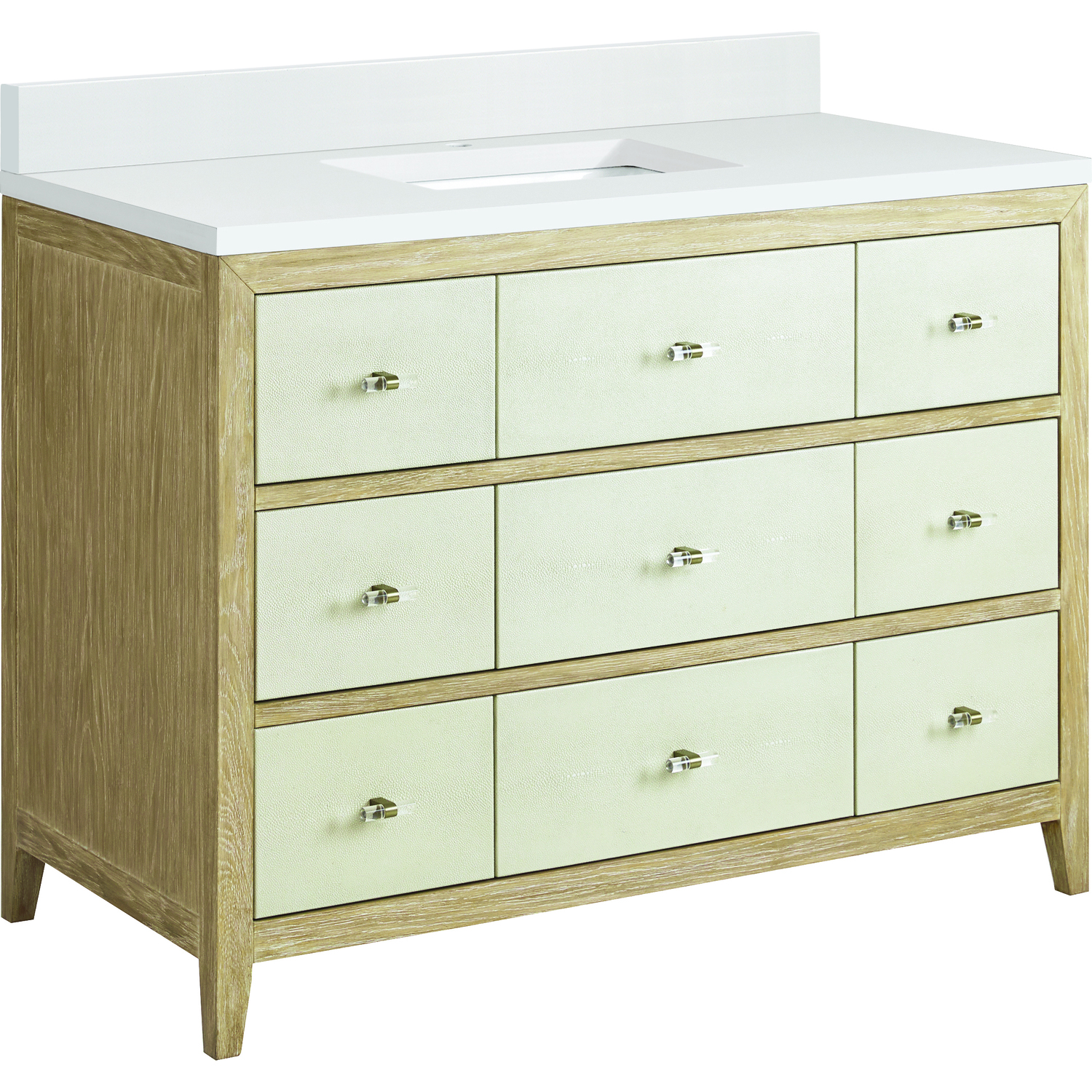 The luxurious Celeste 48" single vanity is a sophisticated statement in style. Featuring embossed shagreen drawer facings complemented by acrylic and brass toggle-style knobs, the vanity boasts a sleek silhouette in a Sunwashed Oak finish. Celeste features a top tip-out drawer and eight full-extension soft-close drawers to make this vanity as functional as it is beautiful. Vanity set includes a classic White Zeus Silestone top drilled for a single faucet hole, a matching backsplash and undermount sink. Faucet not included.Vanity set includes a 3cm eased edge White Zeus Silestone top with matching backsplash, a white porcelain rectangular sink and mounting brackets for easy installation. Top is pre-drilled for single hole faucet. Faucet not included.Includes one solid Ash removable finish-match drawer organizer lined with our signature aluminum laminateSpacious storage with one tip-out and eight drawersIncludes beautiful acrylic and stainless steel toggle-style knobs in Champagne BrassDrawer boxes feature English Dovetail joinery, premium undermount glides, and brushed aluminum laminate drawer liners for easy cleaningMatching White Zeus 3cm Silestone backsplash included.Faucet sold separatelyThe Celeste Collection is an perfect fusion between modern minimalism and contemporary luxury. The drawers feature embossed shagreen facings with acrylic and brass toggle-style knobs, adding a touch of opulence and texture to the collection. The warm, cerused Sunwashed Oak finish of the French contemporary silhouette frames the expansive drawers, creating an unexpected but elegant blend of beauty and texture.1 year warranty against manufacturer's defects. We will repair or replace any defective product, if the product is defective in material or workmanship at our discretion. No warranty is expressed or implied regarding damages resulting from consumer misuse.