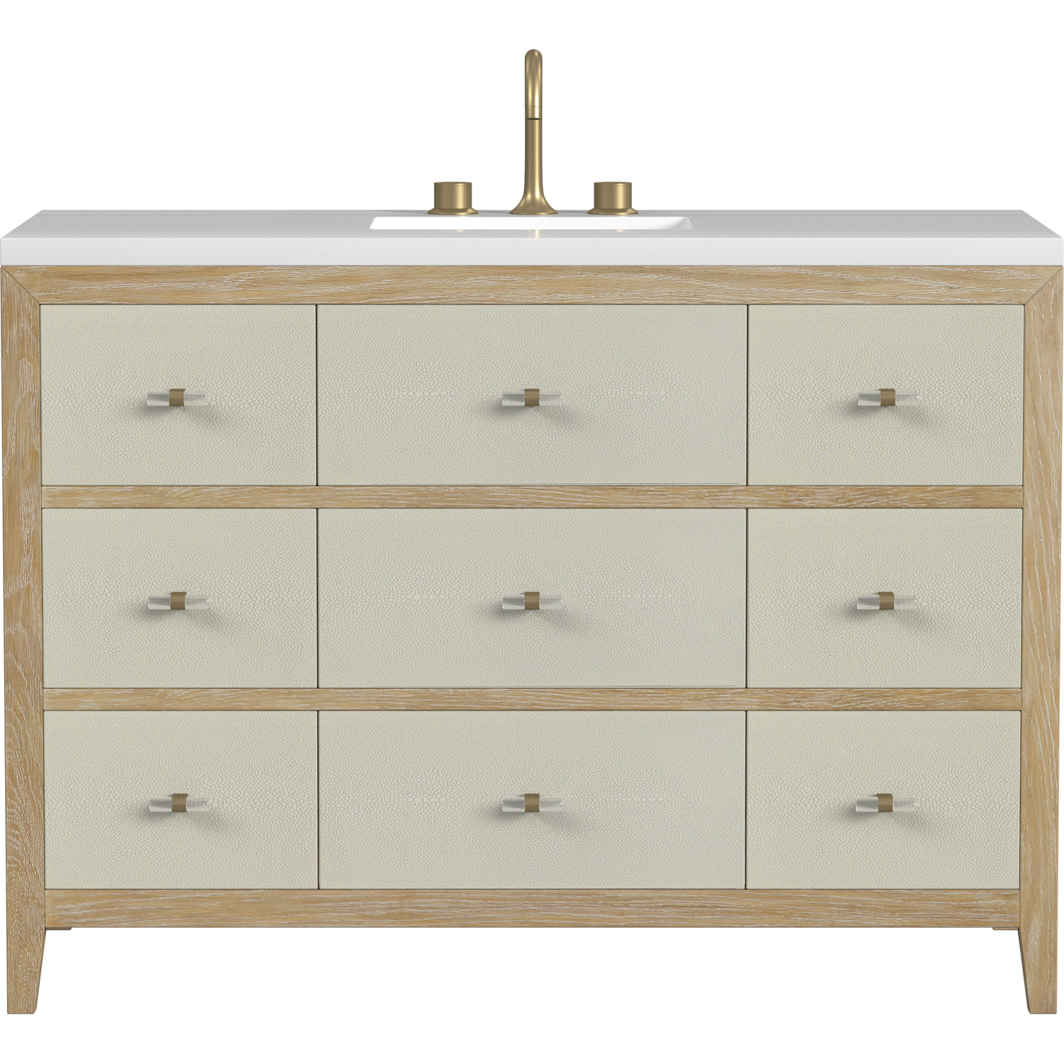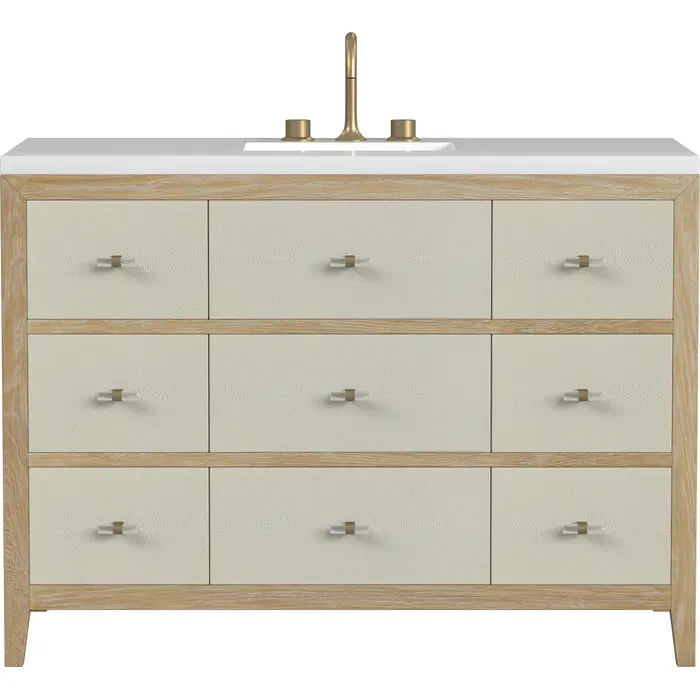 The luxurious Celeste 48" single vanity is a sophisticated statement in style. Featuring embossed shagreen drawer facings complemented by acrylic and brass toggle-style knobs, the vanity boasts a sleek silhouette in a Sunwashed Oak finish. Celeste features a top tip-out drawer and eight full-extension soft-close drawers to make this vanity as functional as it is beautiful. With the addition of a classic White Zeus Silestone top, this vanity is a seamless integration of design and functionality. Vanity set includes a top that is pre-drilled for an 8" widespread faucet and rectangular undermount sink. Faucet not included.Vanity set includes a 3cm eased edge White Zeus Silestone top, a white porcelain rectangular sink and mounting brackets for easy installation. Top is pre-drilled for an 8" widespread faucet. Faucet not included.Includes one solid Ash removable finish-match drawer organizer lined with our signature aluminum laminateSpacious storage with one tip-out and eight drawersIncludes beautiful acrylic and stainless steel toggle-style knobs in Champagne BrassDrawer boxes feature English Dovetail joinery, premium undermount glides, and brushed aluminum laminate drawer liners for easy cleaningThe Celeste Collection is an perfect fusion between modern minimalism and contemporary luxury. The drawers feature embossed shagreen facings with acrylic and brass toggle-style knobs, adding a touch of opulence and texture to the collection. The warm, cerused Sunwashed Oak finish of the French contemporary silhouette frames the expansive drawers, creating an unexpected but elegant blend of beauty and texture.1 year warranty against manufacturer's defects. We will repair or replace any defective product, if the product is defective in material or workmanship at our discretion. No warranty is expressed or implied regarding damages resulting from consumer misuse.