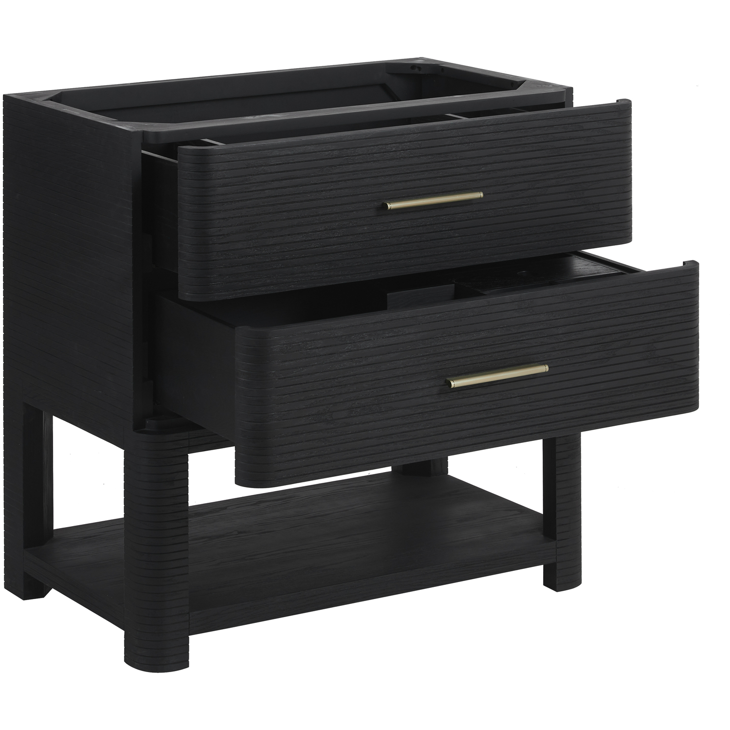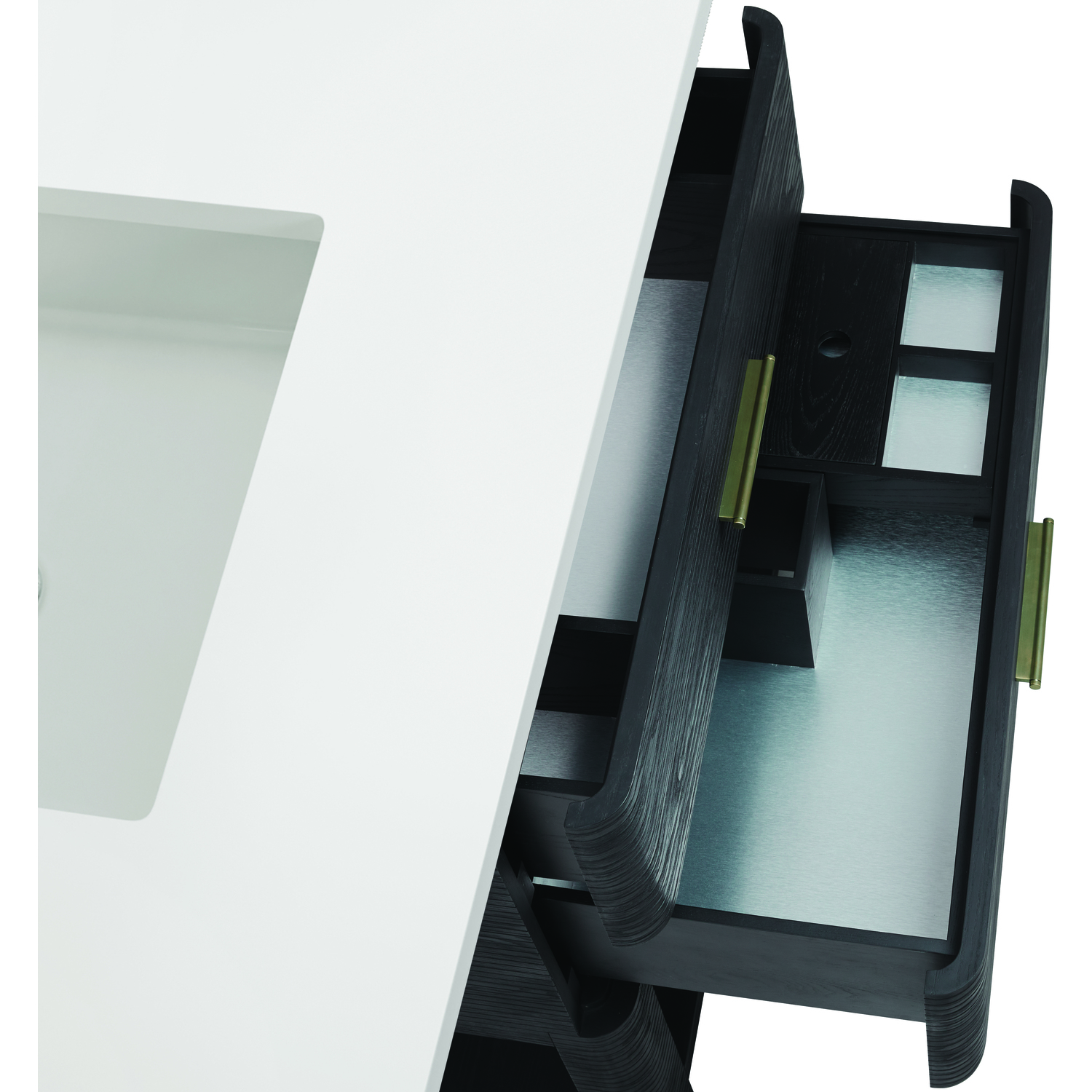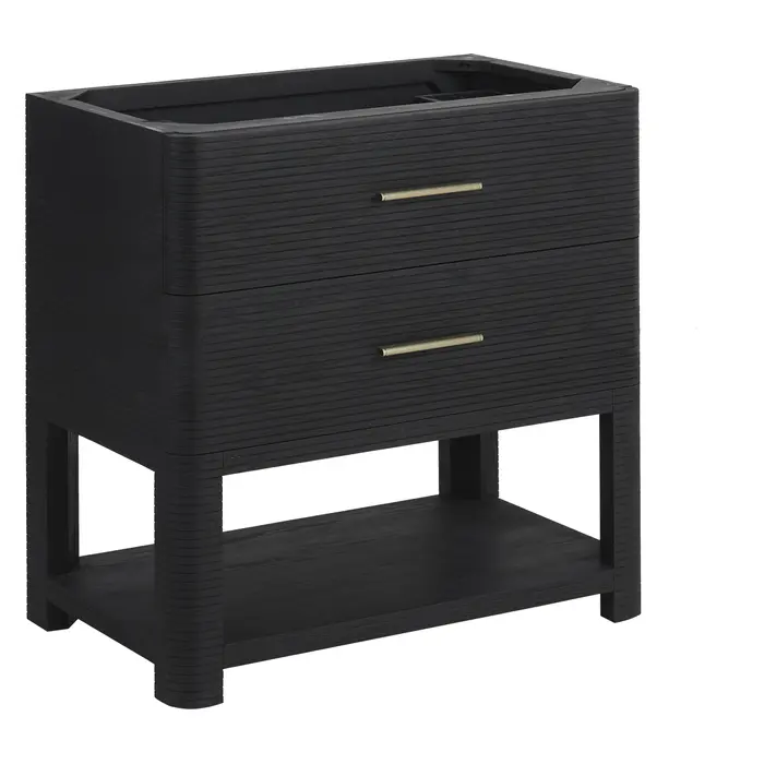 The Lucian 36” single vanity is a visual delight, boasting a rich Carbon Oak finish that adds warmth and character to your space. Complemented by Champagne Brass hardware, the ribbed detailing is meticulously crafted. Enjoy ample storage with two drawers and a lower exposed shelf that provides versatility to your storage solutions. Complete the look with one of our Silestone tops with undermount porcelain sink for a seamless integration of modern design and functionality.Includes two drawers and a lower console-style shelfDrawer boxes feature English Dovetail joinery with premium undermount drawer glidesCabinet features a multi-stage premium finish coat to offer UV and moisture resistanceCarbon Oak finish with Champagne Brass hardwareSelect one of our 3cm eased-edge counter tops, pre-drilled for a single hole faucet. Come with white porcelain rectangular sink(s) that ship separately and include mounting brackets for easy installation.Drawers lined with our signature brushed aluminum laminate for easy cleaningIncludes one removable drawer organizer in solid Ash, matched to finish, and lined with our signature brushed aluminum laminateTransform your space with the Lucian Collection, a masterpiece inspired by the French Art Deco movement. This collection reinvents the console-style vanity, seamlessly blending clean lines and gentle curves with radius corners and ribbed details. Featuring two sophisticated finish options accentuated by dramatic Ash veneers and storage solutions tailored for modern living, the Lucian will bring a sense of 20th-century glamour to your home.1 year warranty against manufacturer's defects. We will repair or replace any defective product, if the product is defective in material or workmanship at our discretion. No warranty is expressed or implied regarding damages resulting from consumer misuse.