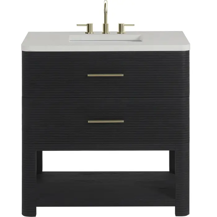 The Lucian 36” single vanity by James Martin Vanities is a visual delight, boasting a rich Carbon Oak finish that adds warmth and character to your space. Complemented by Champagne Brass hardware, the ribbed detailing is meticulously crafted. Enjoy ample storage with two drawers and a lower exposed shelf that provides versatility to your storage solutions. With the addition of a classic White Zeus Silestone® top and undermount sink, this vanity is a seamless integration of modern design and functionality.Includes two drawers and a lower console-style shelfDrawer boxes feature English Dovetail joinery with premium, soft-close undermount drawer slidesCabinet features a multi-stage premium finish coat to offer UV and moisture resistanceCarbon Oak finish with Champagne Brass hardwareCountertop is pre-drilled for an 8" widespread faucet; our 3cm eased edge countertops come with white porcelain rectangular sinks that ship separately and include mounting brackets for easy installationFaucet sold separatelyDrawers lined with our signature brushed aluminum laminate for easy cleaningIncludes one removable drawer organizer in solid Ash, matched to finish, and lined with our signature brushed aluminum laminateFreestanding vanityMatching stone backsplash available as add-on purchaseTransform your space with the Lucian Collection, a masterpiece inspired by the French Art Deco movement. This collection reinvents the console-style vanity, seamlessly blending clean lines and gentle curves with radius corners and ribbed details. Featuring sophisticated finish options accentuated by dramatic Ash veneers and storage solutions tailored for modern living, the Lucian will bring a sense of 20th-century glamour to your home.1 year warranty against manufacturer's defects. We will repair or replace any defective product, if the product is defective in material or workmanship at our discretion. No warranty is expressed or implied regarding damages resulting from consumer misuse.