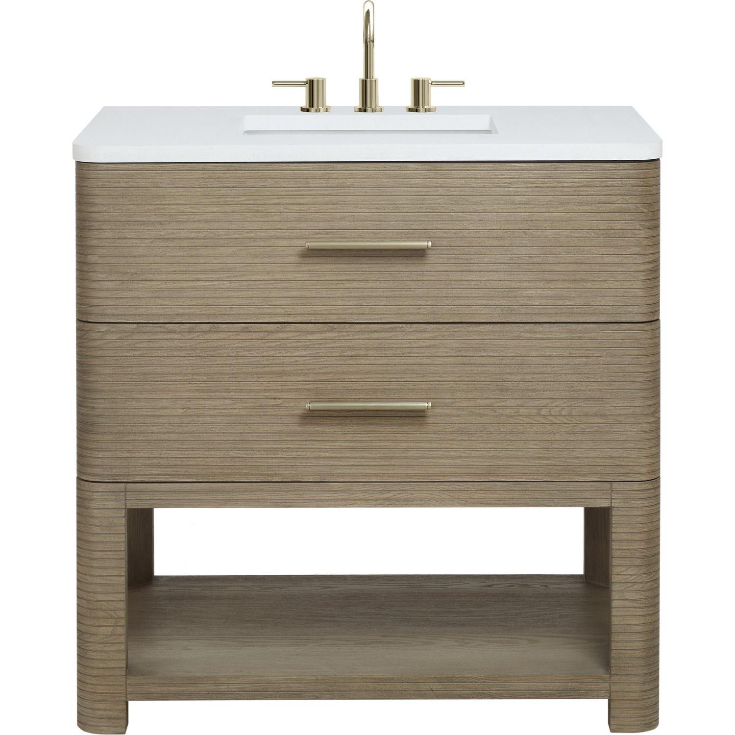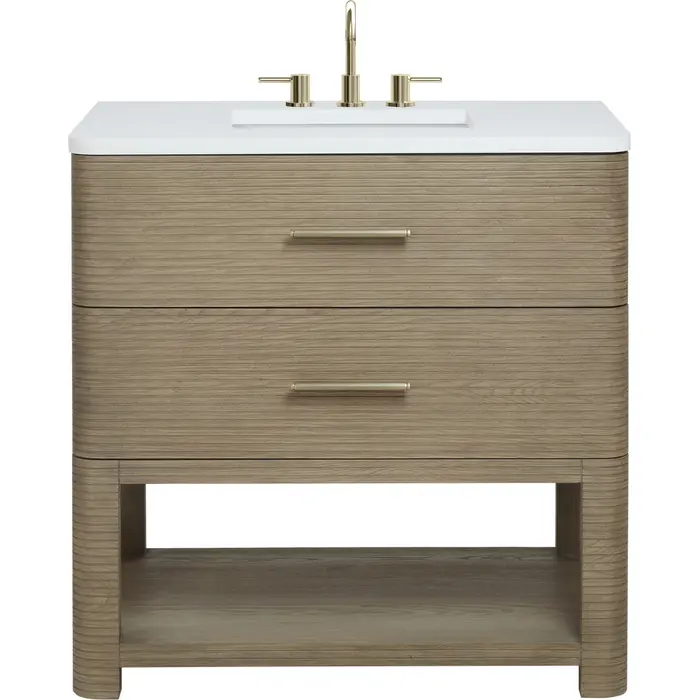 The Lucian 36” Single Vanity by James Martin Vanities is a visual delight, boasting a rich Pebble Oak finish that adds warmth and character to your space. Complemented by Champagne Brass hardware, the ribbed detailing is meticulously crafted. Enjoy ample storage with two drawers and a lower exposed shelf that provides versatility to your storage solutions. With the addition of a classic White Zeus Silestone® top and undermount porcelain sink, this vanity is a seamless integration of modern design and functionality.Includes two drawers and a lower console-style shelfDrawer boxes feature English Dovetail joinery with premium, soft-close undermount drawer slidesCabinet features a multi-stage premium finish coat to offer UV and moisture resistancePebble Oak finish with Champagne Brass hardwareCountertop is pre-drilled for an 8" widespread faucet; our 3cm eased edge countertops come with white porcelain rectangular sinks that ship separately and include mounting brackets for easy installationFaucet sold separatelyDrawers lined with our signature brushed aluminum laminate for easy cleaningIncludes one removable drawer organizer in solid Ash, matched to finish, and lined with our signature brushed aluminum laminateFreestanding vanityMatching stone backsplash available as add-on purchaseTransform your space with the Lucian Collection, a masterpiece inspired by the French Art Deco movement. This collection reinvents the console-style vanity, seamlessly blending clean lines and gentle curves with radius corners and ribbed details. Featuring sophisticated finish options accentuated by dramatic Ash veneers and storage solutions tailored for modern living, the Lucian will bring a sense of 20th-century glamour to your home.1 year warranty against manufacturer's defects. We will repair or replace any defective product, if the product is defective in material or workmanship at our discretion. No warranty is expressed or implied regarding damages resulting from consumer misuse.