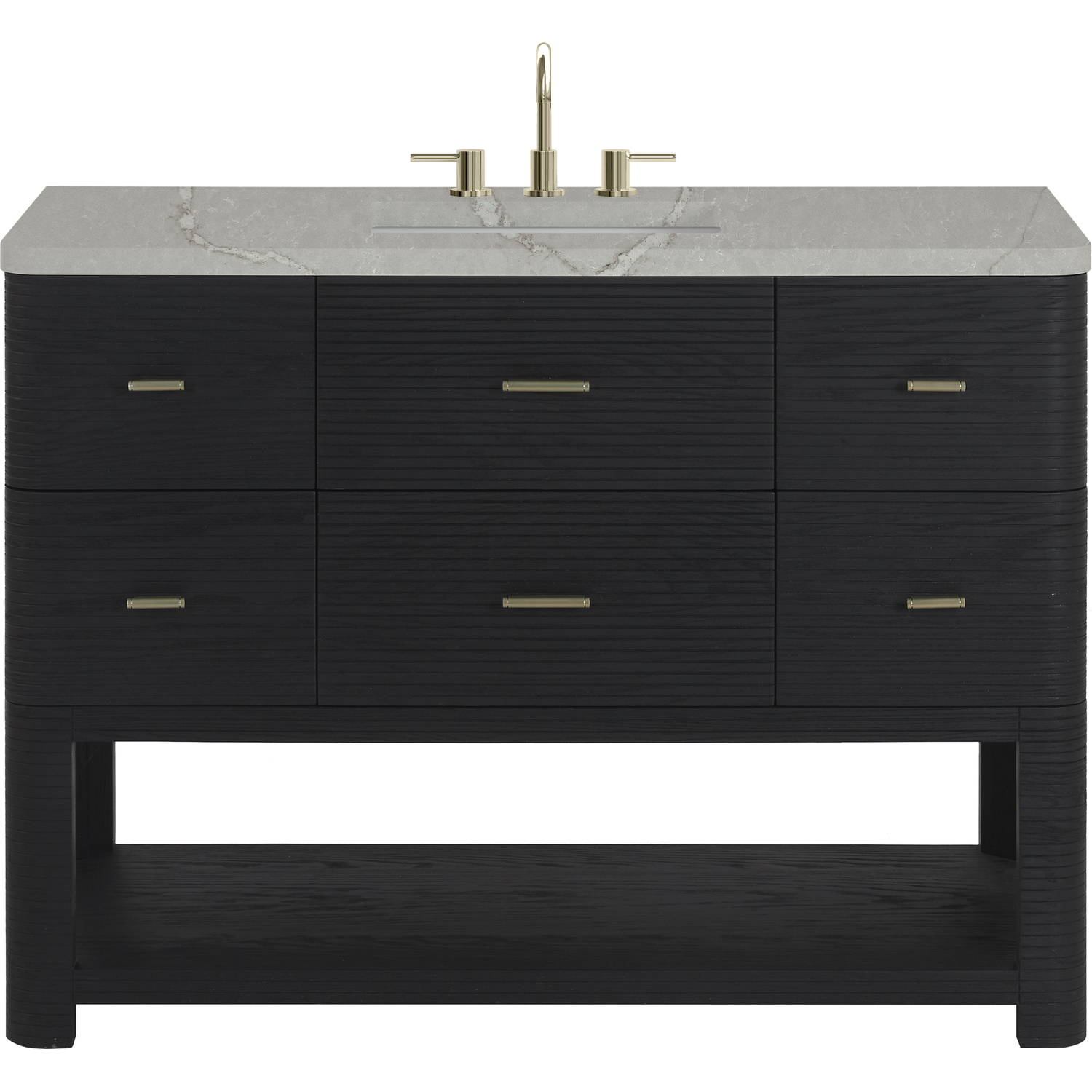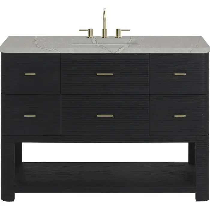 The Lucian 48” Single Vanity by James Martin Vanities is a visual delight, boasting a rich Carbon Oak finish that adds warmth and character to your space. Complemented by Champagne Brass hardware, the ribbed detailing is meticulously crafted. Enjoy ample storage with one tip-out drawer and five traditional drawers, while a lower exposed shelf adds versatility to your storage solutions. With the addition of an elegant Victorian Silver Silestone® top and undermount sink, this vanity is a seamless integration of modern design and functionality. This unit is enabled with FreePower wireless charging; featuring a single-device charger seamlessly embedded into the countertop, indicated by a light-up halo to the left of the sink. Designed for modern living, FreePower offers convenient, integrated, wireless charging when and where you need it.Includes one tip-out drawer, five traditional drawers, and a lower console-style shelfDrawer boxes feature English Dovetail joinery with premium, soft-close undermount drawer slidesCabinet features a multi-stage premium finish coat to offer UV and moisture resistanceCarbon Oak finish with Champagne Brass hardwareCountertop is pre-drilled for an 8" widespread faucet; our 3cm eased edge countertops come with white porcelain rectangular sinks that ship separately and include mounting brackets for easy installationFaucet sold separatelyDrawers lined with our signature brushed aluminum laminate for easy cleaningIncludes one removable drawer organizer in solid Ash, matched to finish, and lined with our signature brushed aluminum laminateFreestanding vanityMatching stone backsplash available as add-on purchaseFreePower Wireless Charging; single-device unit left of sinkTransform your space with the Lucian Collection, a masterpiece inspired by the French Art Deco movement. This collection reinvents the console-style vanity, seamlessly blending clean lines and gentle curves with radius corners and ribbed details. Featuring sophisticated finish options accentuated by dramatic Ash veneers and storage solutions tailored for modern living, the Lucian will bring a sense of 20th-century glamour to your home.1 year warranty against manufacturer's defects. We will repair or replace any defective product, if the product is defective in material or workmanship at our discretion. No warranty is expressed or implied regarding damages resulting from consumer misuse.
