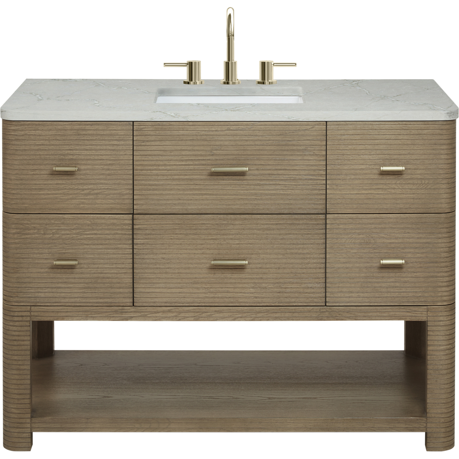 The Lucian 48” single vanity by James Martin Vanities is a visual delight, boasting a rich Pebble Oak finish that adds warmth and character to your space. Complemented by Champagne Brass hardware, the ribbed detailing is meticulously crafted. Enjoy ample storage with one tip-out drawer and five traditional drawers, while a lower exposed shelf adds versatility to your storage solutions. With the addition of an elegant Victorian Silver Silestone® top and undermount porcelain sink, this vanity is a seamless integration of modern design and functionality.Includes one tip-out drawer, five traditional drawers, and a lower console-style shelfDrawer boxes feature English Dovetail joinery with premium, soft-close undermount drawer slidesCabinet features a multi-stage premium finish coat to offer UV and moisture resistancePebble Oak finish with Champagne Brass hardwareCountertop is pre-drilled for an 8" widespread faucet; our 3cm eased edge countertops come with white porcelain rectangular sinks that ship separately and include mounting brackets for easy installationFaucet sold separatelyDrawers lined with our signature brushed aluminum laminate for easy cleaningIncludes one removable drawer organizer in solid Ash, matched to finish, and lined with our signature brushed aluminum laminateFreestanding vanityMatching stone backsplash available as add-on purchaseTransform your space with the Lucian Collection, a masterpiece inspired by the French Art Deco movement. This collection reinvents the console-style vanity, seamlessly blending clean lines and gentle curves with radius corners and ribbed details. Featuring sophisticated finish options accentuated by dramatic Ash veneers and storage solutions tailored for modern living, the Lucian will bring a sense of 20th-century glamour to your home.1 year warranty against manufacturer's defects. We will repair or replace any defective product, if the product is defective in material or workmanship at our discretion. No warranty is expressed or implied regarding damages resulting from consumer misuse.