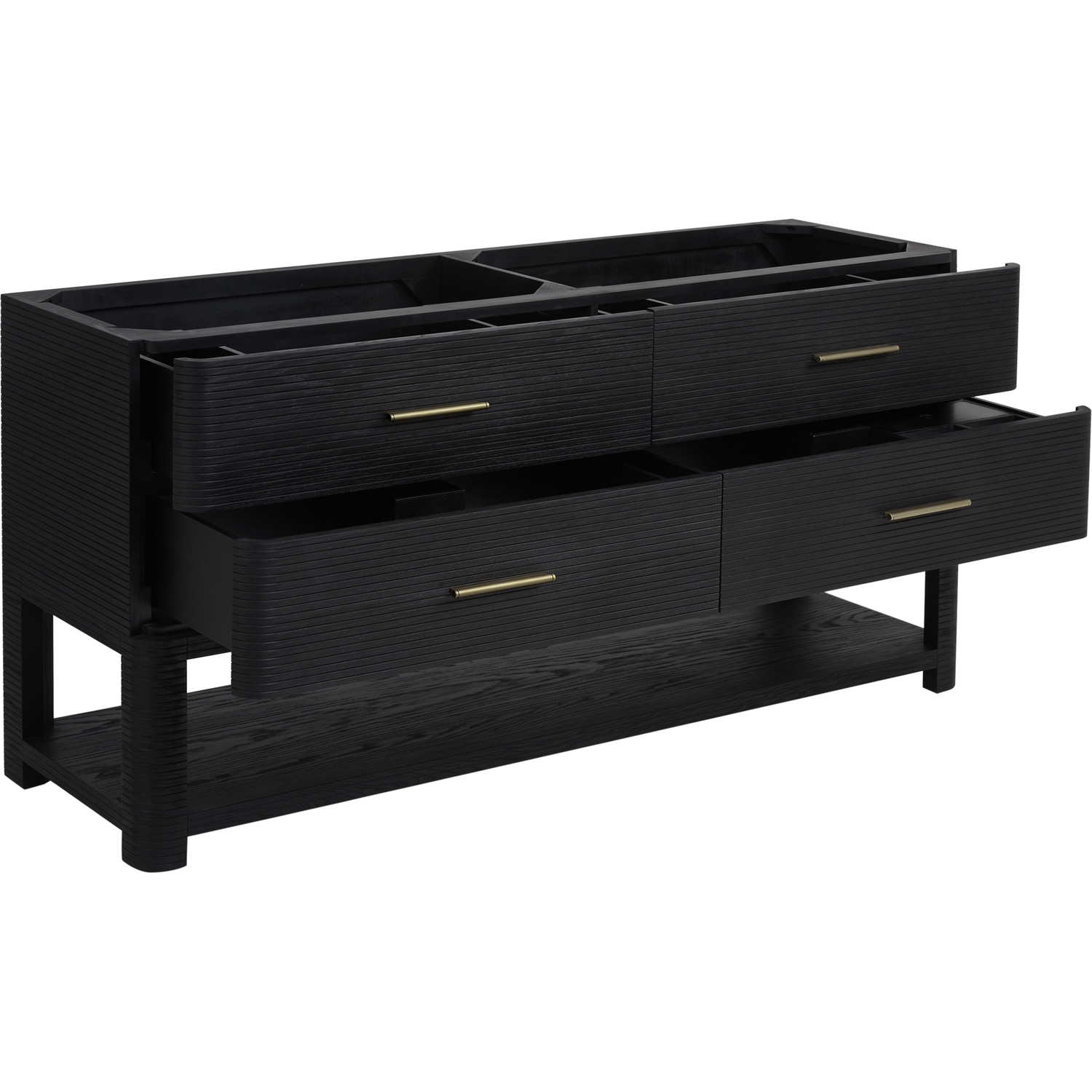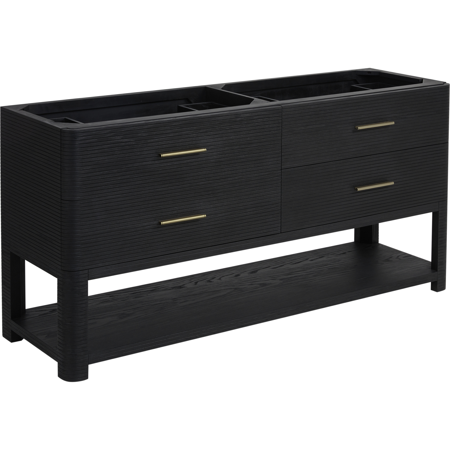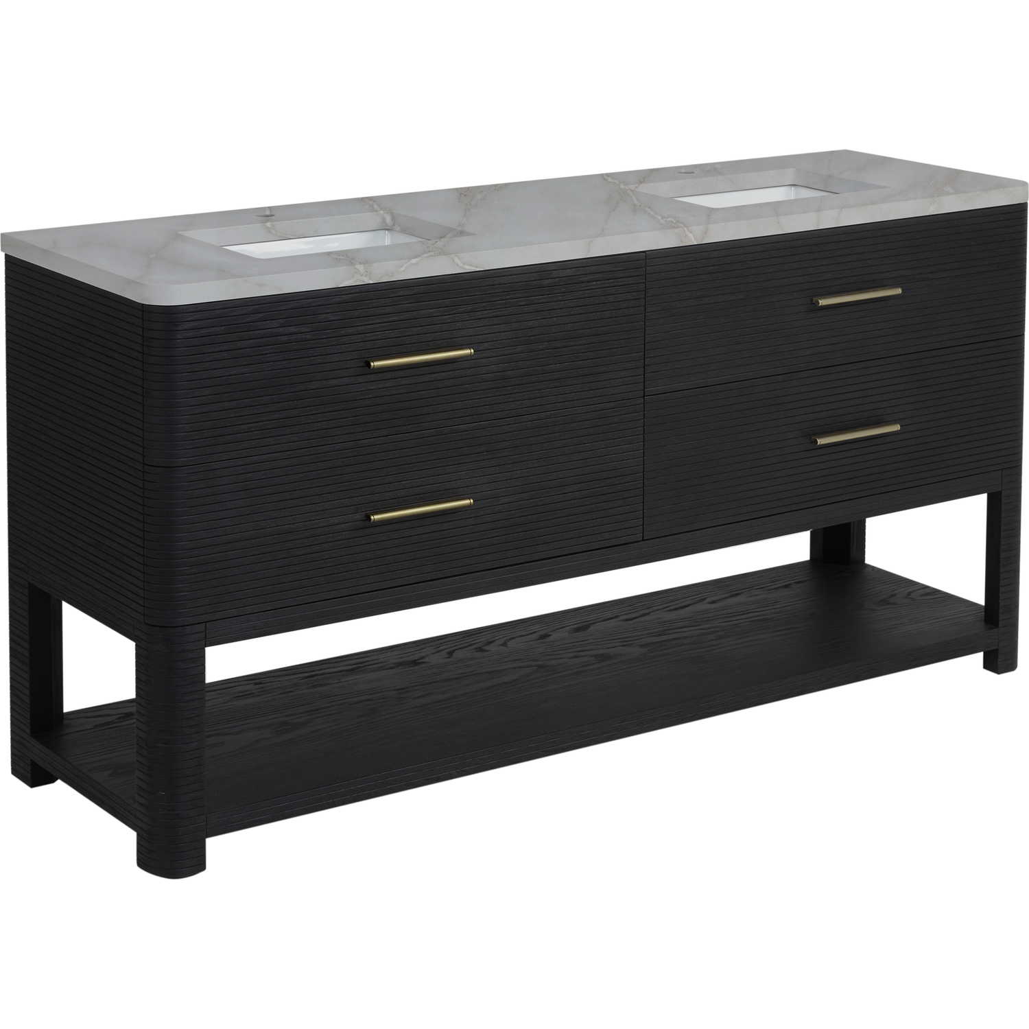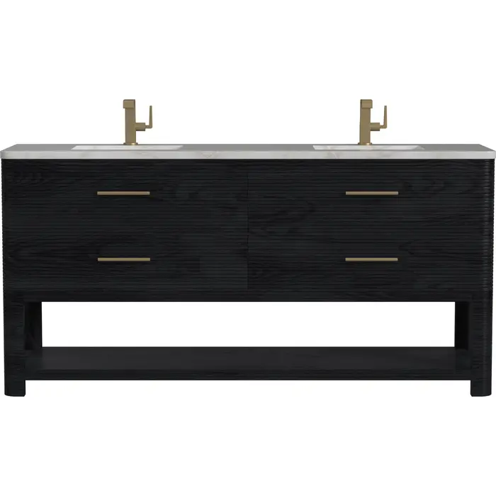 The Lucian 72” double vanity is a visual delight, boasting a rich Carbon Oak finish that adds warmth and character to your space. Complemented by Champagne Brass hardware, the ribbed detailing is meticulously crafted. Enjoy ample storage with four deep drawers and a lower shelf for added versatility. With the addition of an elegant Victorian Silver Silestone top and undermount porcelain sinks, this vanity is a seamless integration of modern design and functionality.Includes four drawers and a lower console-style shelfDrawer boxes feature English Dovetail joinery with premium, soft-close undermount drawer slidesCabinet features a multi-stage premium finish coat to offer UV and moisture resistanceCarbon Oak finish with Champagne Brass hardwareCountertop is pre-drilled for two single hole faucets; our 3cm eased edge countertops come with white porcelain rectangular sinks that ships separately and includes mounting brackets for easy installationFaucets sold separatelyDrawers lined with our signature brushed aluminum laminate for easy cleaningIncludes one removable drawer organizer in solid Ash, matched to finish, and lined with our signature brushed aluminum laminateFreestanding vanityMatching stone backsplash available as add-on purchaseTransform your space with the Lucian Collection, a masterpiece inspired by the French Art Deco movement. This collection reinvents the console-style vanity, seamlessly blending clean lines and gentle curves with radius corners and ribbed details. Featuring sophisticated finish options accentuated by dramatic Ash veneers and storage solutions tailored for modern living, the Lucian will bring a sense of 20th-century glamour to your home.1 year warranty against manufacturer's defects. We will repair or replace any defective product, if the product is defective in material or workmanship at our discretion. No warranty is expressed or implied regarding damages resulting from consumer misuse.