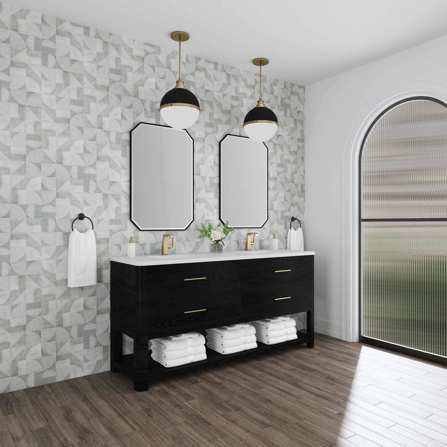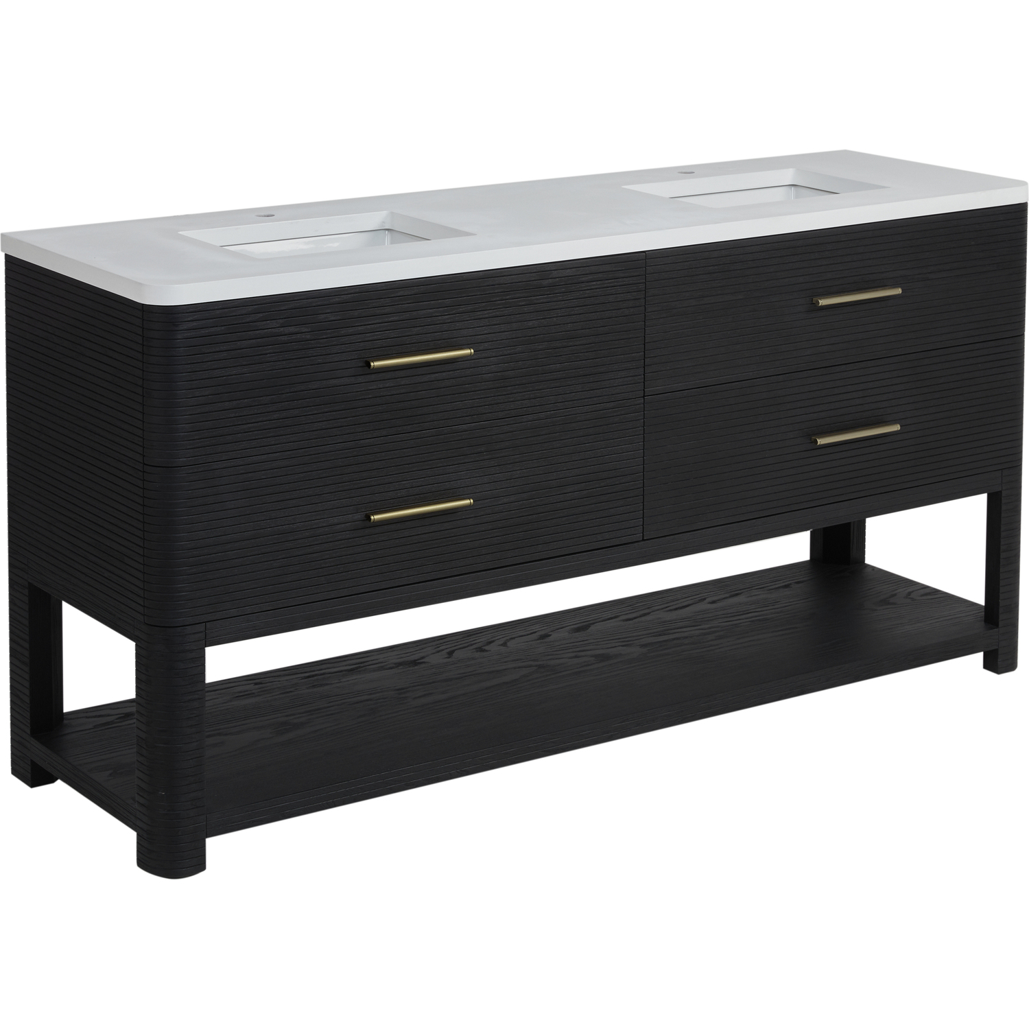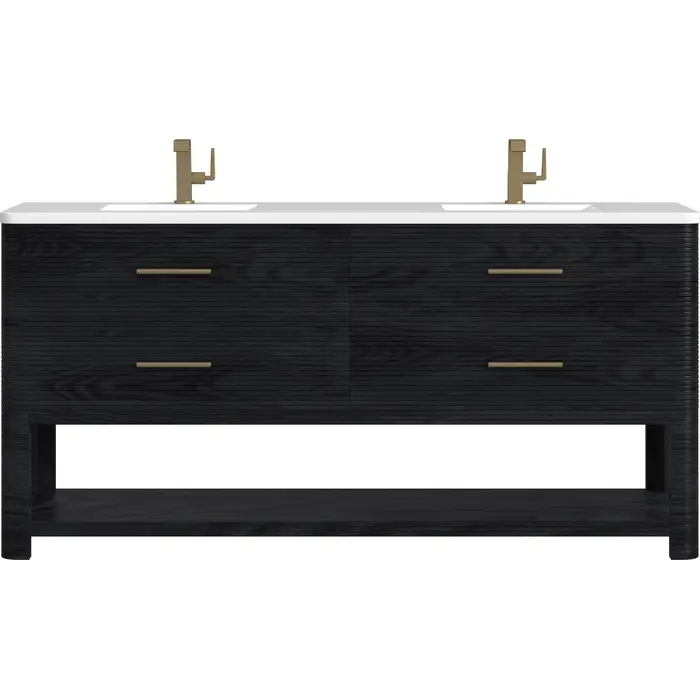 The Lucian 72” double vanity is a visual delight, boasting a rich Carbon Oak finish that adds warmth and character to your space. Complemented by Champagne Brass hardware, the ribbed detailing is meticulously crafted. Enjoy ample storage with four deep drawers and a lower shelf for added versatility. With the addition of a classic White Zeus Silestone top and undermount porcelain sinks, this vanity is a seamless integration of modern design and functionality.Includes four drawers and a lower console-style shelfDrawer boxes feature English Dovetail joinery with premium, soft-close undermount drawer slidesCabinet features a multi-stage premium finish coat to offer UV and moisture resistanceCarbon Oak finish with Champagne Brass hardwareCountertop is pre-drilled for two single hole faucets; our 3cm eased edge countertops come with white porcelain rectangular sinks that ships separately and includes mounting brackets for easy installationFaucets sold separatelyDrawers lined with our signature brushed aluminum laminate for easy cleaningIncludes one removable drawer organizer in solid Ash, matched to finish, and lined with our signature brushed aluminum laminateFreestanding vanityMatching stone backsplash available as add-on purchaseTransform your space with the Lucian Collection, a masterpiece inspired by the French Art Deco movement. This collection reinvents the console-style vanity, seamlessly blending clean lines and gentle curves with radius corners and ribbed details. Featuring sophisticated finish options accentuated by dramatic Ash veneers and storage solutions tailored for modern living, the Lucian will bring a sense of 20th-century glamour to your home.1 year warranty against manufacturer's defects. We will repair or replace any defective product, if the product is defective in material or workmanship at our discretion. No warranty is expressed or implied regarding damages resulting from consumer misuse.