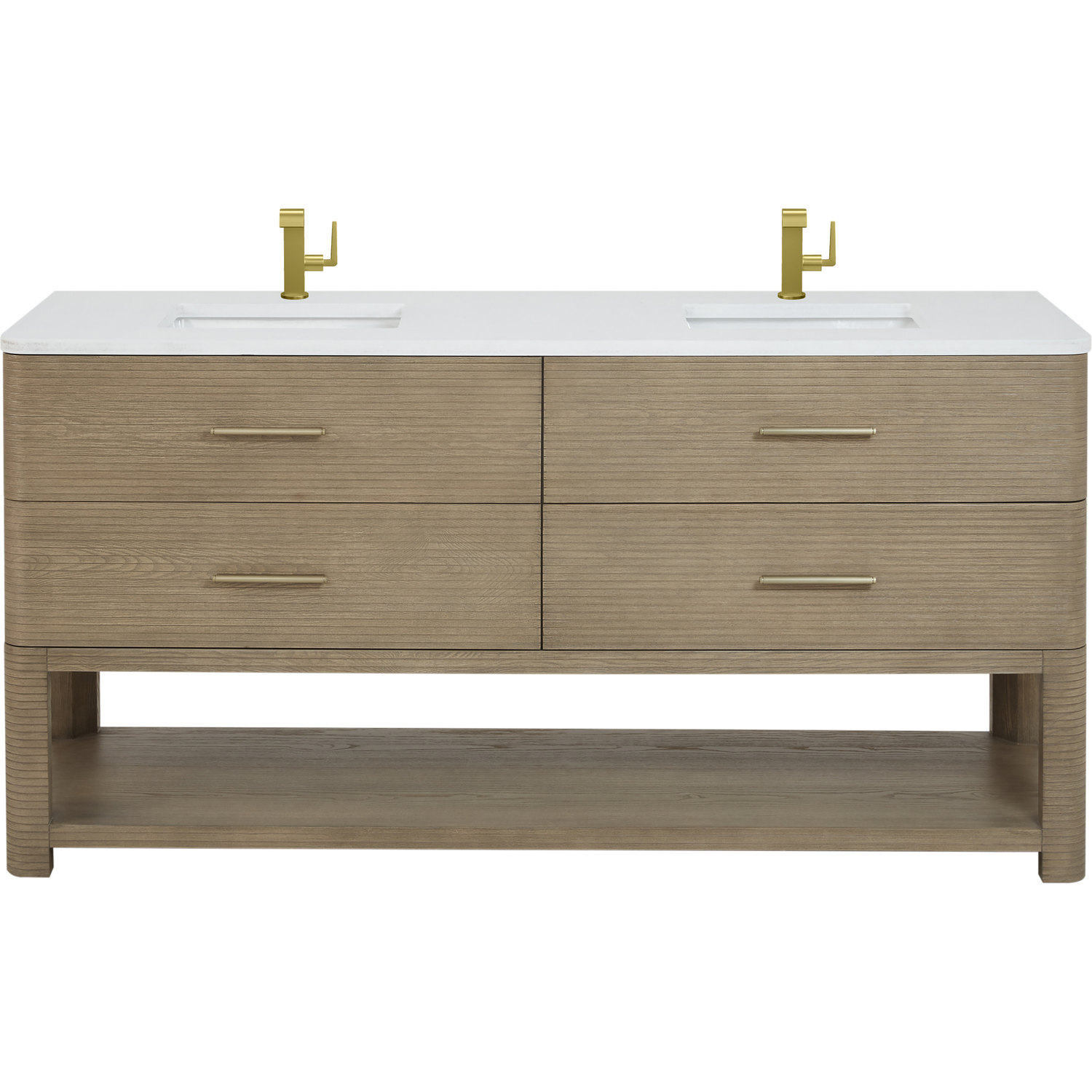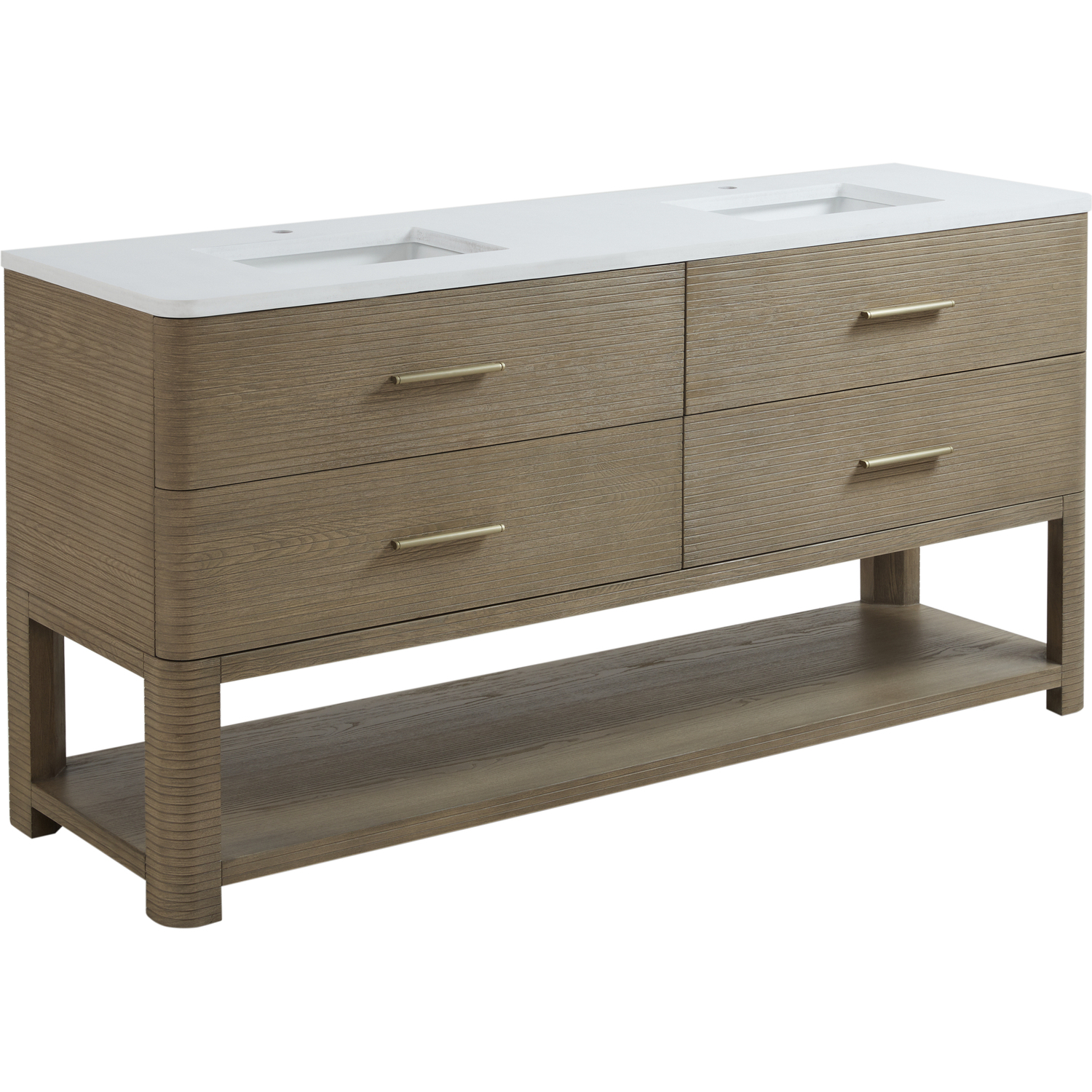 The Lucian 72” double vanity is a visual delight, boasting a rich Pebble Oak finish that adds warmth and character to your space. Complemented by Champagne Brass hardware, the ribbed detailing is meticulously crafted. Enjoy ample storage with four deep drawers and a lower shelf for added versatility. With the addition of a classic White Zeus Silestone top and undermount porcelain sink, this vanity is a seamless integration of modern design and functionality.Includes four drawers and a lower console-style shelfDrawer boxes feature English Dovetail joinery with premium, soft-close undermount drawer slidesCabinet features a multi-stage premium finish coat to offer UV and moisture resistancePebble Oak finish with Champagne Brass hardwareCountertop is pre-drilled for two single hole faucets; our 3cm eased edge countertops come with white porcelain rectangular sinks that ships separately and includes mounting brackets for easy installationFaucets sold separatelyDrawers lined with our signature brushed aluminum laminate for easy cleaningIncludes one removable drawer organizer in solid Ash, matched to finish, and lined with our signature brushed aluminum laminateFreestanding vanityMatching stone backsplash available as add-on purchaseTransform your space with the Lucian Collection, a masterpiece inspired by the French Art Deco movement. This collection reinvents the console-style vanity, seamlessly blending clean lines and gentle curves with radius corners and ribbed details. Featuring sophisticated finish options accentuated by dramatic Ash veneers and storage solutions tailored for modern living, the Lucian will bring a sense of 20th-century glamour to your home.1 year warranty against manufacturer's defects. We will repair or replace any defective product, if the product is defective in material or workmanship at our discretion. No warranty is expressed or implied regarding damages resulting from consumer misuse.