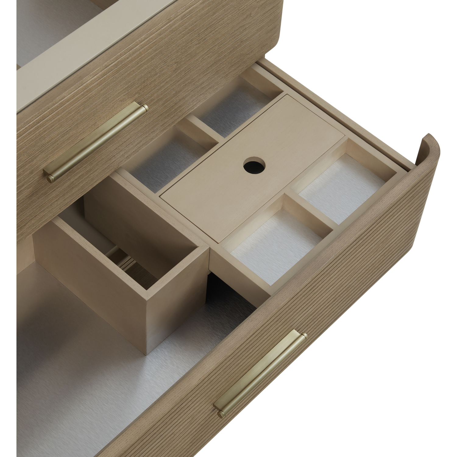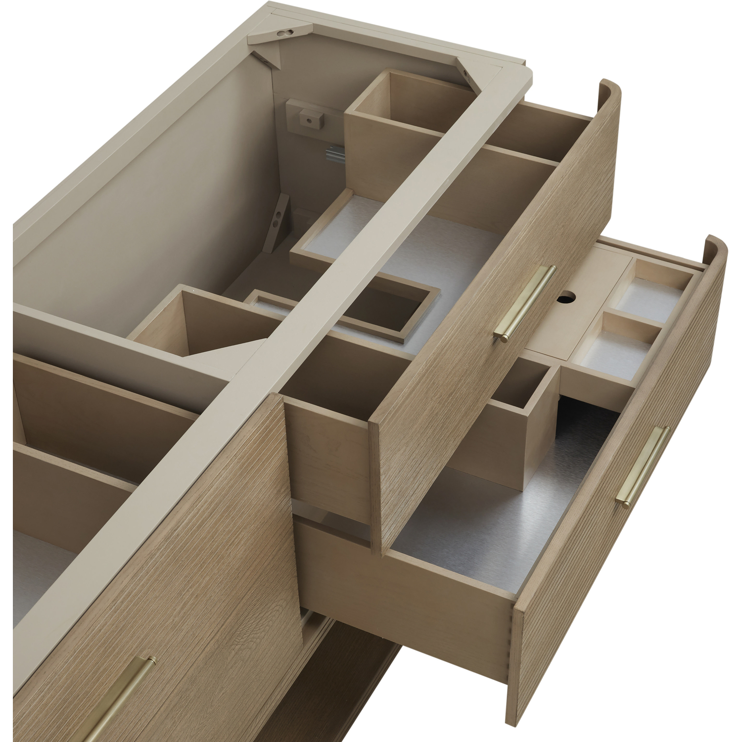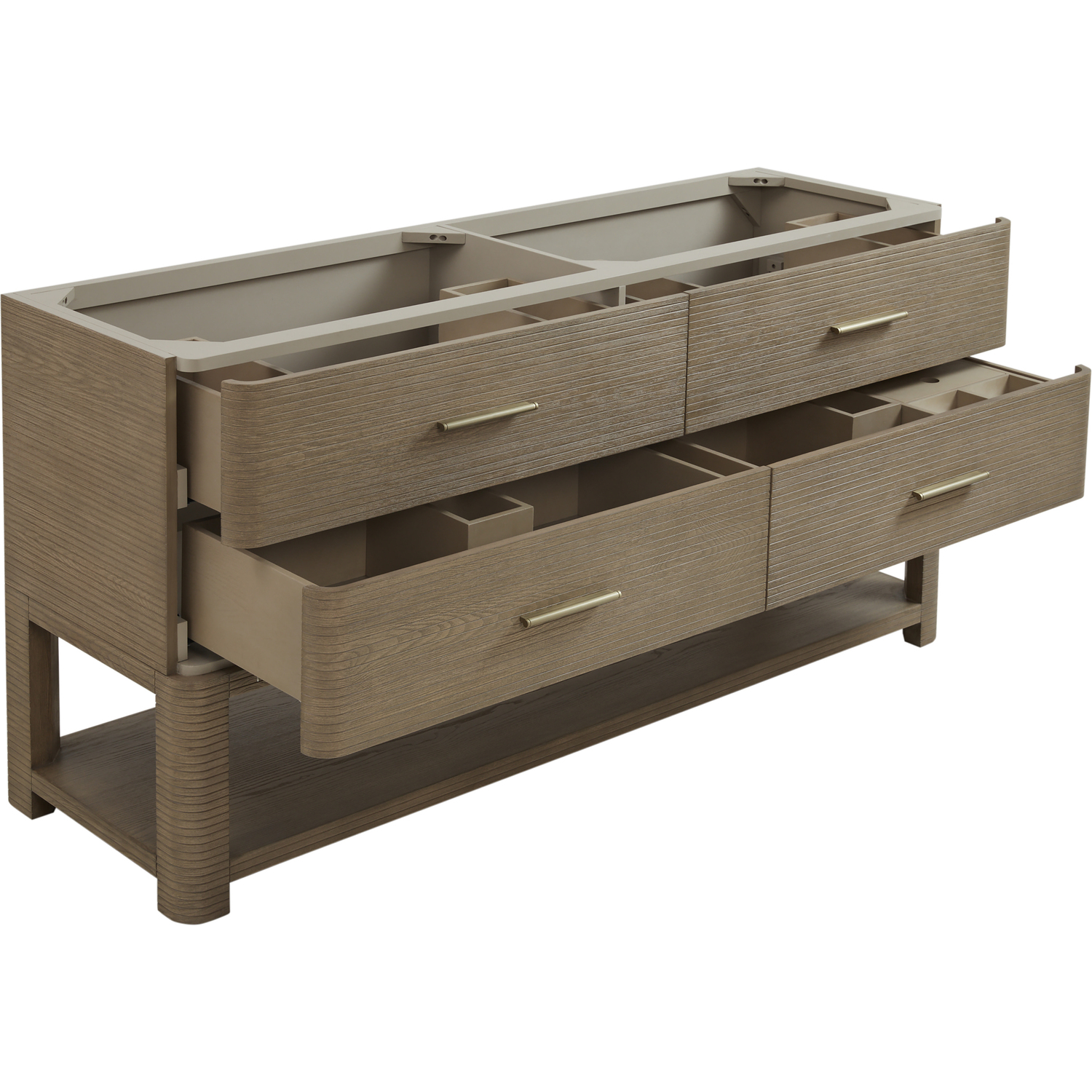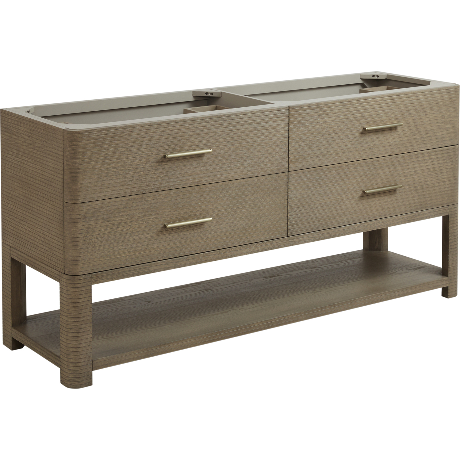 The Lucian 72” double vanity is a visual delight, boasting a rich Pebble Oak finish that adds warmth and character to your space. Complemented by Champagne Brass hardware, the ribbed detailing is meticulously crafted. Enjoy ample storage with four deep drawers and a lower shelf for added versatility. Complete the look with one of our Silestone tops with undermount porcelain sink for a seamless integration of modern design and functionality.Includes four drawers and a lower console-style shelfDrawer boxes feature English Dovetail joinery with premium undermount drawer glidesCabinet features a multi-stage premium finish coat to offer UV and moisture resistancePebble Oak finish with Champagne Brass hardwareSelect one of our 3cm eased-edge counter tops, pre-drilled for single hole faucets. Come with white porcelain rectangular sink(s) that ship separately and include mounting brackets for easy installation.Drawers lined with our signature brushed aluminum laminate for easy cleaningIncludes one removable drawer organizer in solid Ash, matched to finish, and lined with our signature brushed aluminum laminateTransform your space with the Lucian Collection, a masterpiece inspired by the French Art Deco movement. This collection reinvents the console-style vanity, seamlessly blending clean lines and gentle curves with radius corners and ribbed details. Featuring two sophisticated finish options accentuated by dramatic Ash veneers and storage solutions tailored for modern living, the Lucian will bring a sense of 20th-century glamour to your home.1 year warranty against manufacturer's defects. We will repair or replace any defective product, if the product is defective in material or workmanship at our discretion. No warranty is expressed or implied regarding damages resulting from consumer misuse.