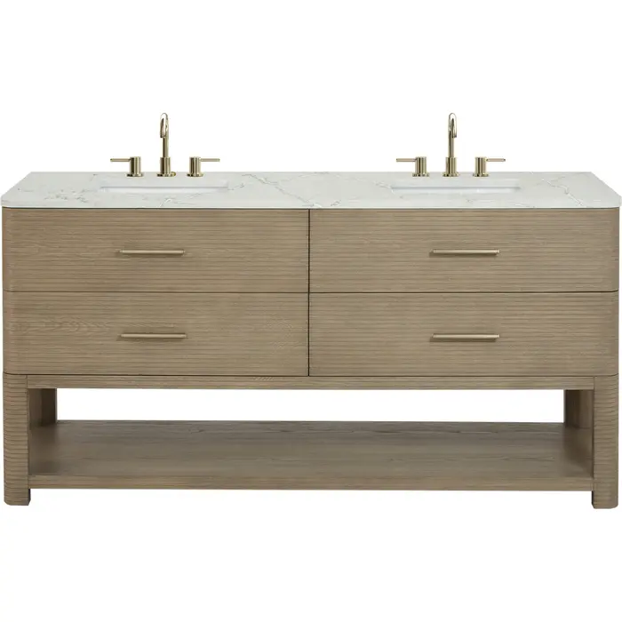 The Lucian 72” double vanity by James Martin Vanities is a visual delight, boasting a rich Pebble Oak finish that adds warmth and character to your space. Complemented by Champagne Brass hardware, the ribbed detailing is meticulously crafted. Enjoy ample storage, four deep drawers, and a lower shelf for added versatility. With the addition of an elegant Victorian Silver Silestone® top and undermount porcelain sink, this vanity is a seamless integration of modern design and functionality.Includes four drawers and a lower console-style shelfDrawer boxes feature English Dovetail joinery with premium, soft-close undermount drawer slidesCabinet features a multi-stage premium finish coat to offer UV and moisture resistancePebble Oak finish with Champagne Brass hardwareCountertop is pre-drilled for two 8" widespread faucets; our 3cm eased edge countertops come with white porcelain rectangular sinks that ships separately and includes mounting brackets for easy installationFaucets sold separatelyDrawers lined with our signature brushed aluminum laminate for easy cleaningIncludes one removable drawer organizer in solid Ash, matched to finish, and lined with our signature brushed aluminum laminateFreestanding vanityMatching stone backsplash available as add-on purchaseTransform your space with the Lucian Collection, a masterpiece inspired by the French Art Deco movement. This collection reinvents the console-style vanity, seamlessly blending clean lines and gentle curves with radius corners and ribbed details. Featuring sophisticated finish options accentuated by dramatic Ash veneers and storage solutions tailored for modern living, the Lucian will bring a sense of 20th-century glamour to your home.1 year warranty against manufacturer's defects. We will repair or replace any defective product, if the product is defective in material or workmanship at our discretion. No warranty is expressed or implied regarding damages resulting from consumer misuse.