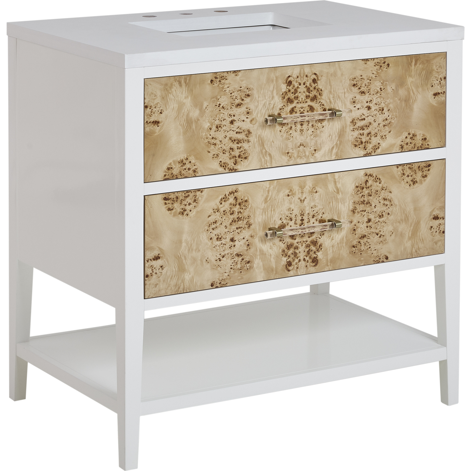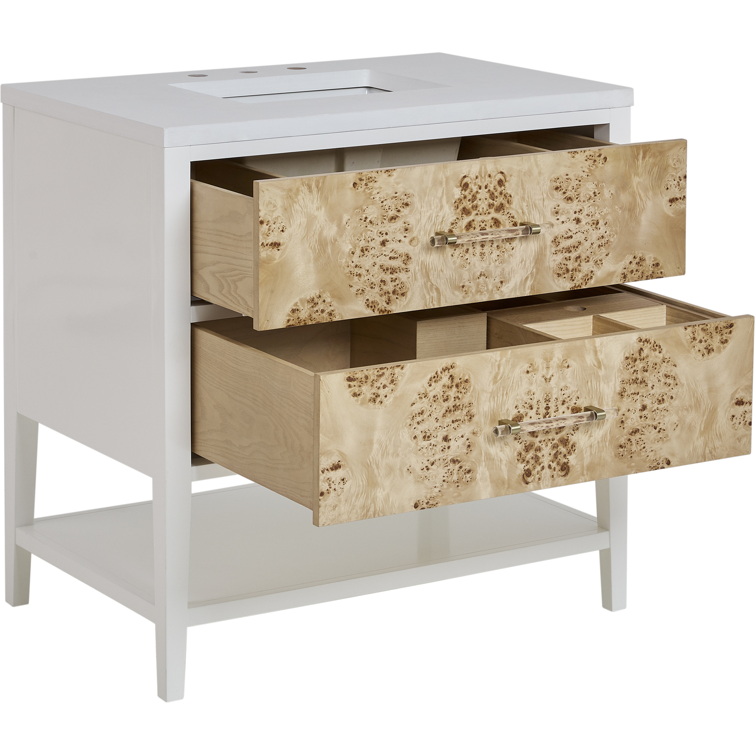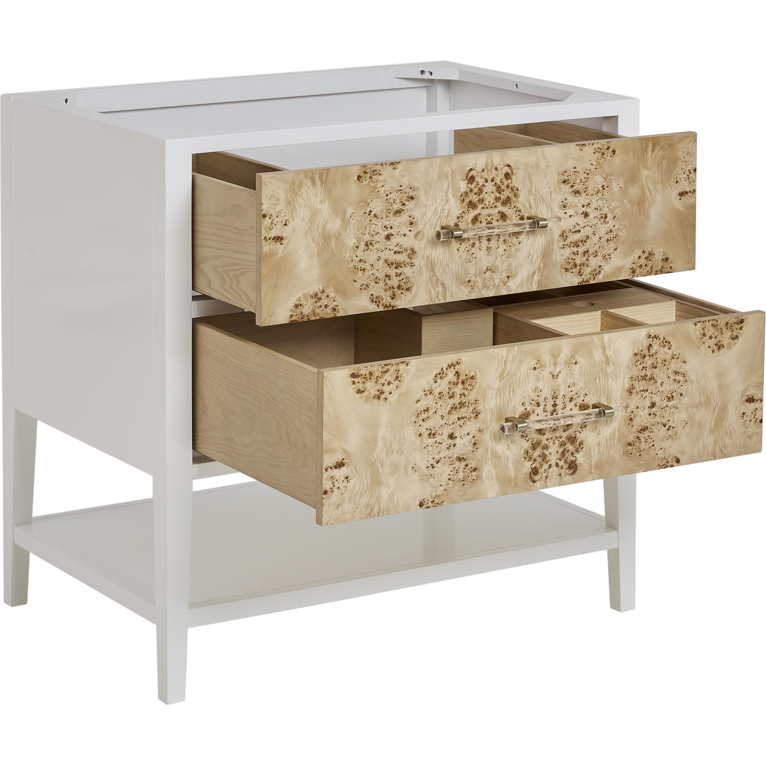 Indulge in the artistry of the Olena 36” single vanity — where craftsmanship meets the natural beauty of Mappa Burl. Each detail has been thoughtfully curated for style and functionality. This vanity boasts ample storage with two drawers and an integrated lower shelf. The acrylic and brass pulls accentuate the beauty of the Burl drawers. Complete this timeless bathroom centerpiece with the addition of our White Zeus top, or add your own.Complete this timeless bathroom centerpiece with the addition of our White Zeus top, or add your own.Includes one solid Ash removable finish-match drawer organizer lined with our signature aluminum laminateFeaturing two drawers with soft-close undermount glides and an integrated lower shelf for additional storageIncludes acrylic pulls with Champagne Brass accentsDrawer boxes feature English Dovetail joinery, premium undermount glides, and brushed aluminum laminate drawer liners for easy cleaningMoisture-resistant MDF panels with natural book-matched Mappa Burl and Beech Veneers. Mappa Burl veneers are particularly contrasting from a range of light browns with dark burl pockets, making each piece a unique color pattern. Expect minor variations inDiscover the captivating allure of the exquisitely crafted Mappa Burl drawer fronts in the Olena Collection — an ode to the revival of craftsmanship and the beauty of natural materials in contemporary furnishings. The sleek Polished White tapered frame of this console vanity, adorned with spacious drawers and accented by acrylic and brass hardware, stands as the focal point for creating a striking presence in modern bath spaces.1 year warranty against manufacturer's defects. We will repair or replace any defective product, if the product is defective in material or workmanship at our discretion. No warranty is expressed or implied regarding damages resulting from consumer misuse.