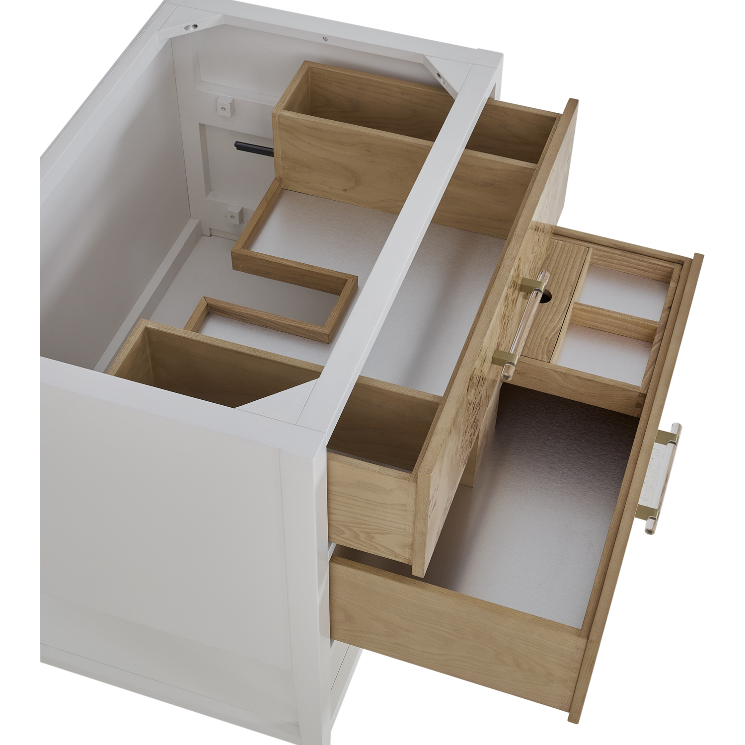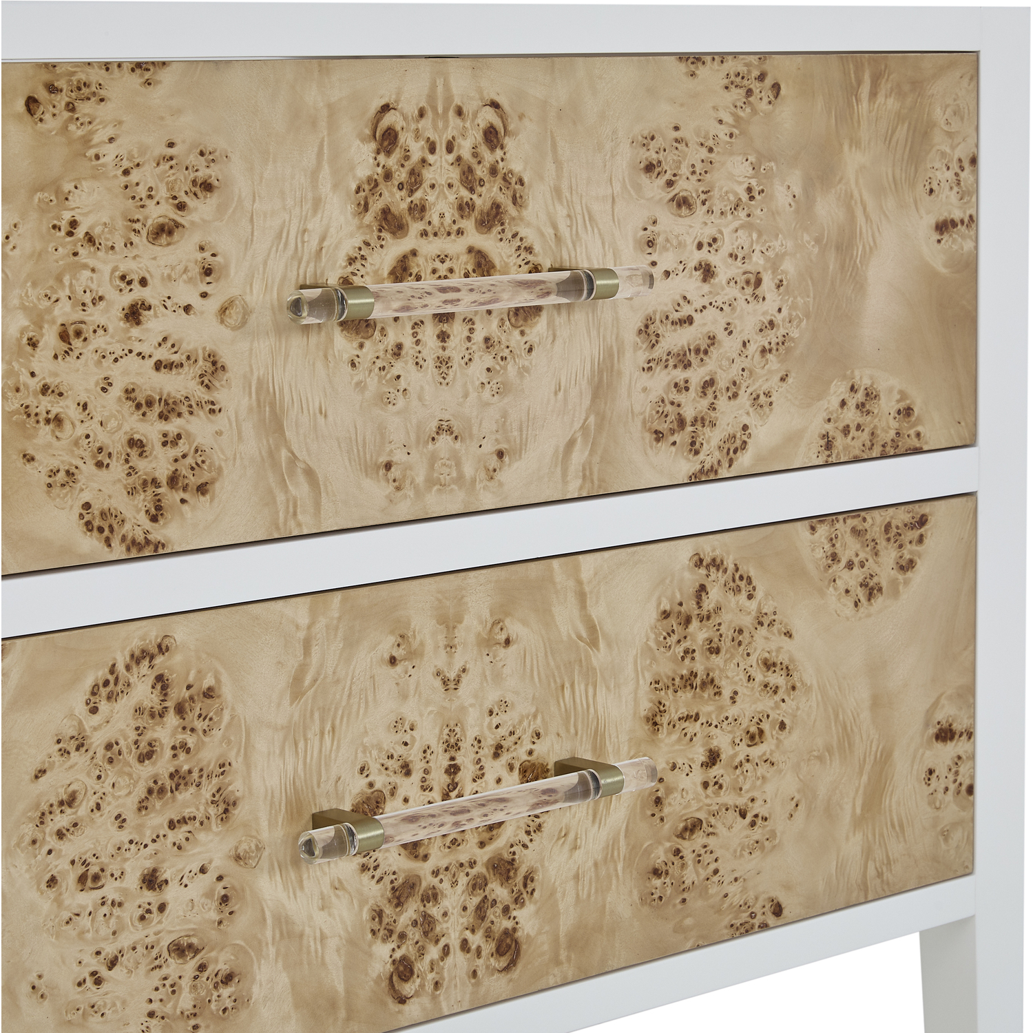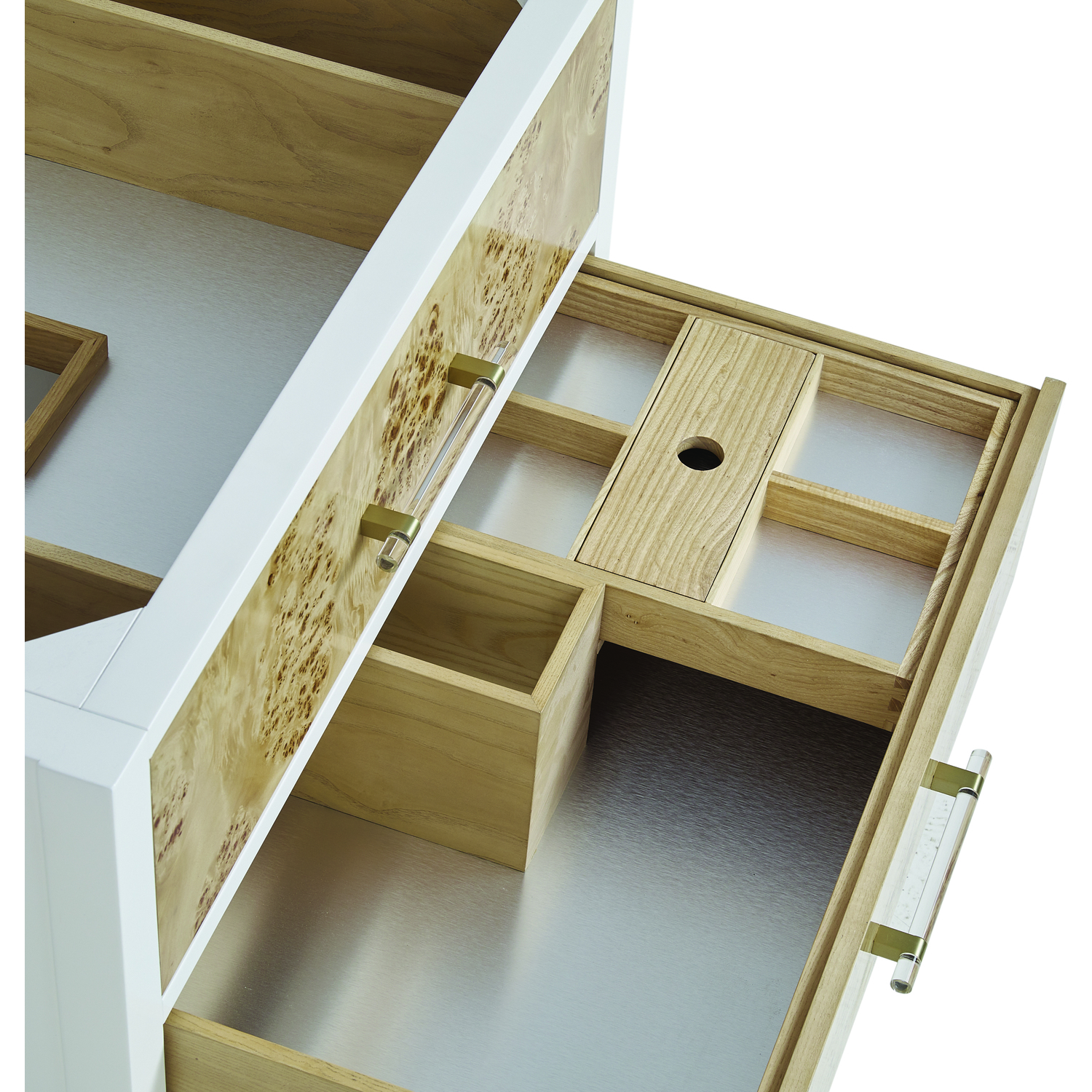 Indulge in the artistry of the Olena 36” single vanity — where craftsmanship meets the natural beauty of Mappa Burl. Each detail has been thoughtfully curated for style and functionality. This vanity boasts ample storage with two drawers and an integrated lower shelf. The acrylic and brass pulls accentuate the beauty of the Burl drawers. Complete this timeless bathroom centerpiece with the addition of our White Zeus top, or add your own.Complete this timeless bathroom centerpiece with the addition of our White Zeus top, or add your own.Includes one solid Ash removable finish-match drawer organizer lined with our signature aluminum laminateFeaturing two drawers with soft-close undermount glides and an integrated lower shelf for additional storageIncludes acrylic pulls with Champagne Brass accentsDrawer boxes feature English Dovetail joinery, premium undermount glides, and brushed aluminum laminate drawer liners for easy cleaningMoisture-resistant MDF panels with natural book-matched Mappa Burl and Beech Veneers. Mappa Burl veneers are particularly contrasting from a range of light browns with dark burl pockets, making each piece a unique color pattern. Expect minor variations inDiscover the captivating allure of the exquisitely crafted Mappa Burl drawer fronts in the Olena Collection — an ode to the revival of craftsmanship and the beauty of natural materials in contemporary furnishings. The sleek Polished White tapered frame of this console vanity, adorned with spacious drawers and accented by acrylic and brass hardware, stands as the focal point for creating a striking presence in modern bath spaces.1 year warranty against manufacturer's defects. We will repair or replace any defective product, if the product is defective in material or workmanship at our discretion. No warranty is expressed or implied regarding damages resulting from consumer misuse.