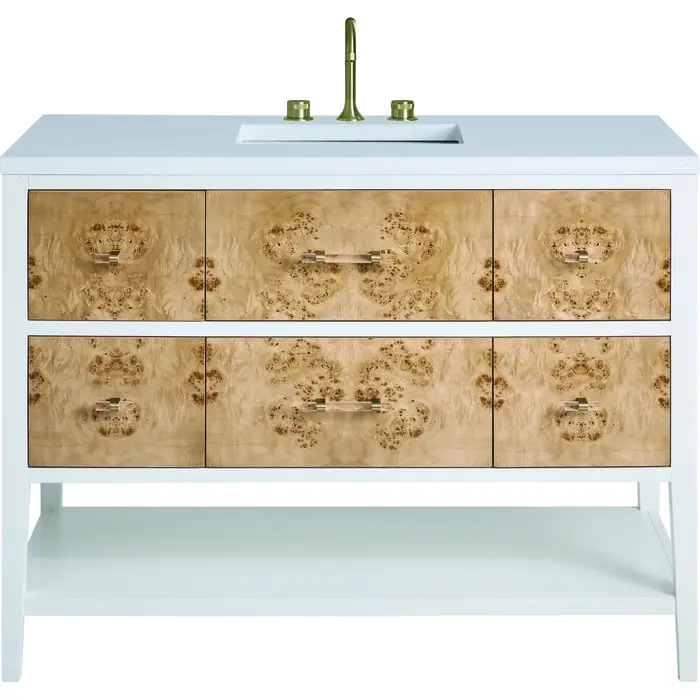 Indulge in the artistry of the Olena 48” single vanity — where craftsmanship meets the natural beauty of Mappa Burl. Each detail has been thoughtfully curated for style and functionality. This vanity boasts ample storage with one tip-out, five drawers, and an integrated lower shelf. The acrylic and brass pulls accentuate the beauty of the Burl drawers. The addition of a classic, White Zeus Silestone by Cosentino top with undermount rectangular sink completes this timeless bathroom centerpiece. Vanity top is pre-drilled for an 8" widespread faucet. Faucet not included.Vanity set includes a 3cm eased edge White Zeus Silestone top, a white porcelain rectangular sink and mounting brackets for easy installation. Top is pre-drilled for an 8" widespread faucet. Faucet not included.Includes one solid Ash removable finish-match drawer organizer lined with our signature aluminum laminateFeaturing one soft-close tip-out, five drawers with soft-close undermount glides, and an integrated lower shelf for additional storageIncludes acrylic pulls and knobs with Champagne Brass accentsDrawer boxes feature English Dovetail joinery, premium undermount glides, and brushed aluminum laminate drawer liners for easy cleaningMoisture-resistant MDF panels with natural book-matched Mappa Burl and Beech Veneers. Mappa Burl veneers are particularly contrasting from a range of light browns with dark burl pockets, making each piece a unique color pattern. Expect minor variations inDiscover the captivating allure of the exquisitely crafted Mappa Burl drawer fronts in the Olena Collection — an ode to the revival of craftsmanship and the beauty of natural materials in contemporary furnishings. The sleek Polished White tapered frame of this console vanity, adorned with spacious drawers and accented by acrylic and brass hardware, stands as the focal point for creating a striking presence in modern bath spaces.1 year warranty against manufacturer's defects. We will repair or replace any defective product, if the product is defective in material or workmanship at our discretion. No warranty is expressed or implied regarding damages resulting from consumer misuse.