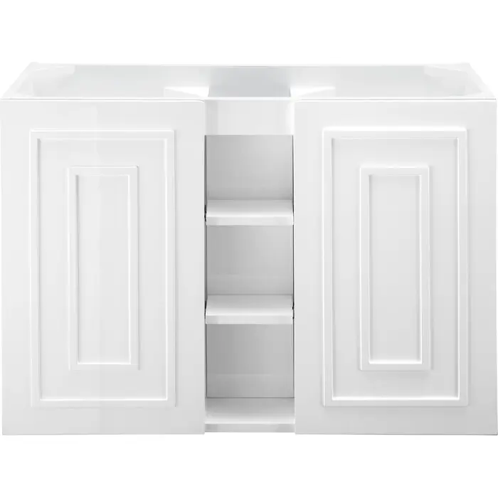 - Two door Glossy White single vanity cabinet with interior and exterior shelf space