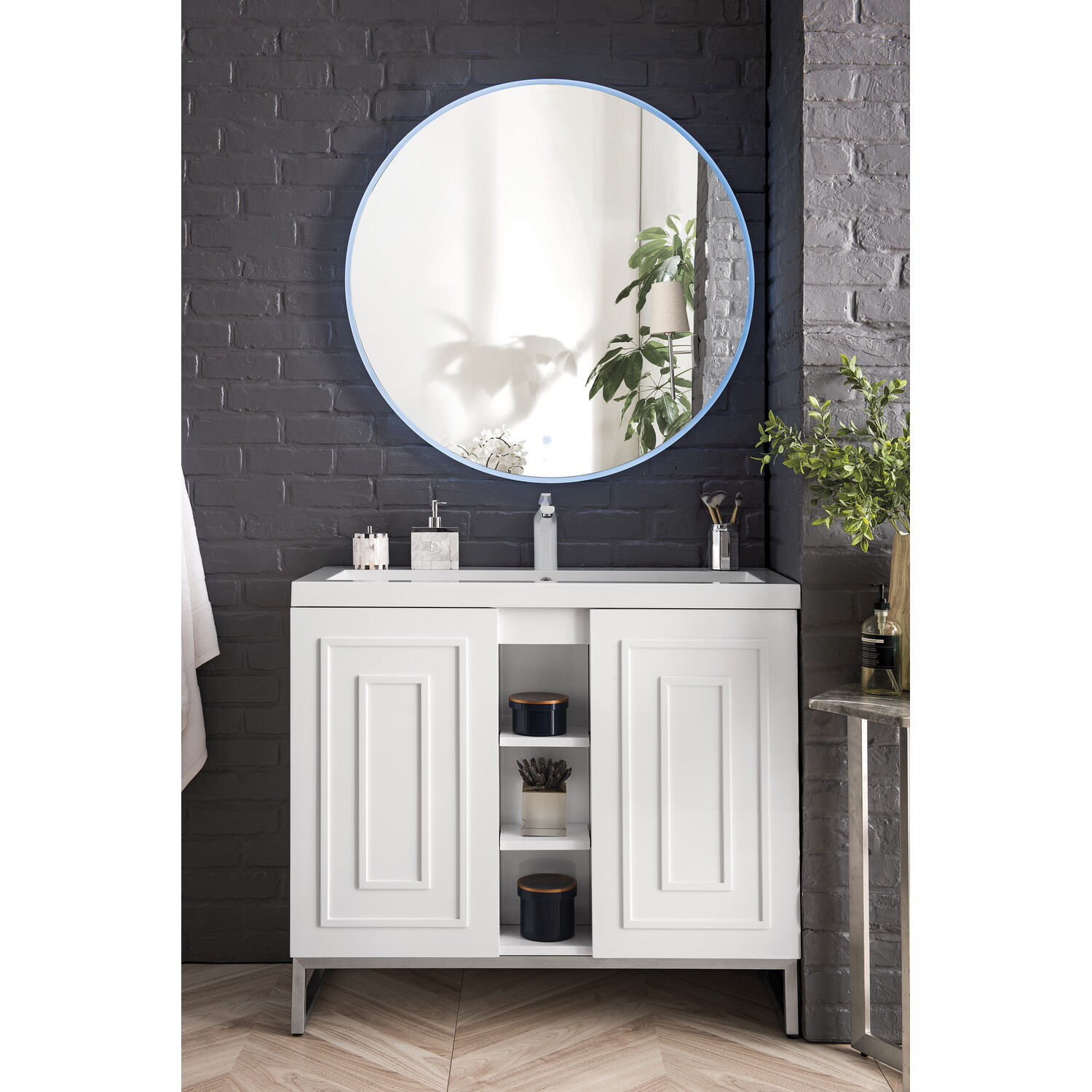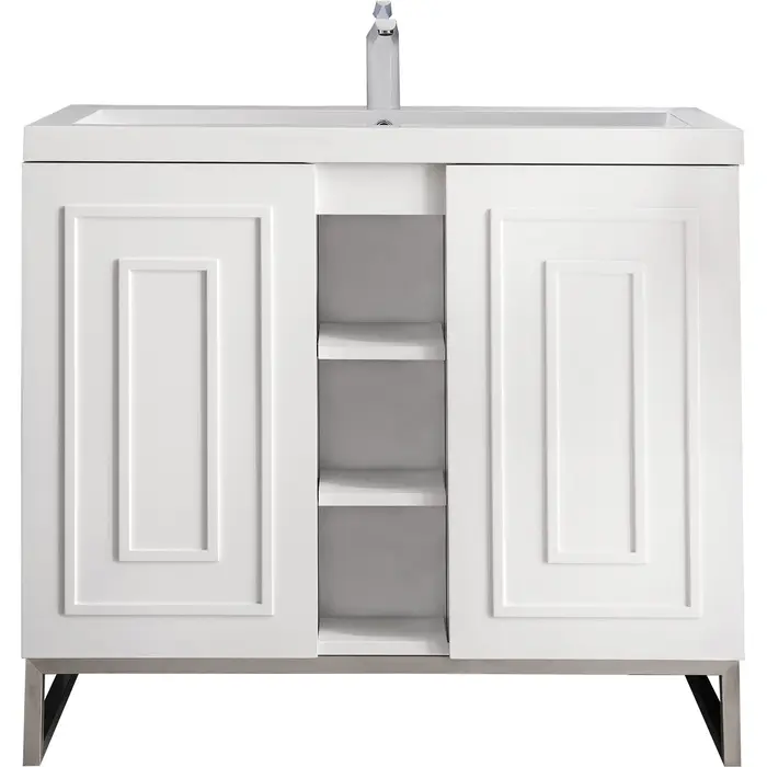 The Alicante 39.5” Glossy White Single Vanity by James Martin Vanities is the perfect choice for any bathroom upgrade. Fine detailing on the frame accents its streamlined appearance, while its Brushed Nickel metal base gives it an updated modern appeal. Each door front has framed detailing, adding depth and visual interest to the piece. Keep all your toiletries, makeup and more in this elegant vanity. The look is completed with a Glossy White Composite Stone top and integrated sink.Two door Glossy White single vanity with interior and exterior shelf spaceHardware/Stand Finish: Satin NickelSolid kiln-dried Grade A hardwoodCabinet is finished inside and out with a premium undercoat finish for superior moisture and UV resistanceSoft-close door hingesWhite Glossy Composite Stone integrated top and sink includedCountertop is pre-drilled for one single hole faucetFaucet sold separatelyThe Alicante collection by James Martin Vanities offers big style in a subtle design. Its sleek metal base and raised panel doors create the perfect modern bathroom vanity. Constructed from fine quality solid hardwoods and comes with our top-rated composite countertop making this piece the epitome of luxury bathroom furniture. It’s timeless and versatile design is accentuated by its beautiful metal base and the vanity was built with external cubbies creating added storage for washroom essentials. This piece also gives you the option to float the look by removing the base. This vanity is sure to illuminate any bathroom with it’s opulent looks.1 year warranty against manufacturer's defects. We will repair or replace any defective product, if the product is defective in material or workmanship at our discretion. No warranty is expressed or implied regarding damages resulting from consumer misuse.