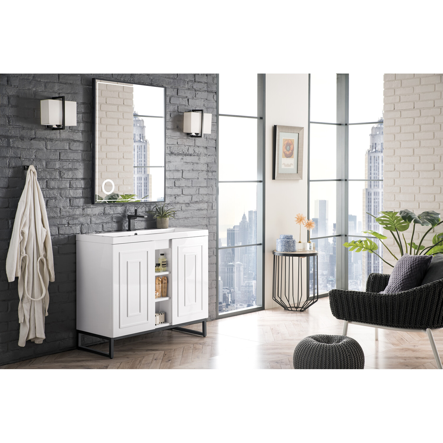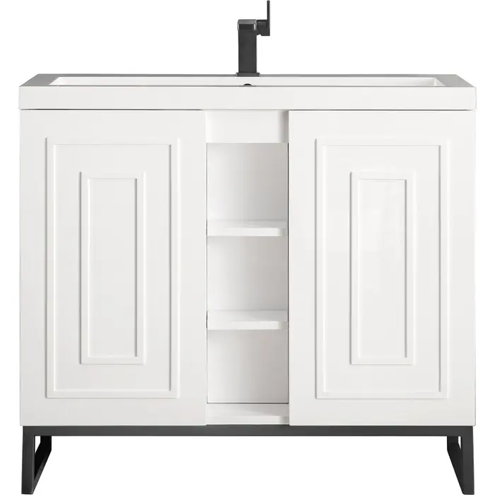 The Alicante 39.5” Glossy White Single Vanity by James Martin Vanities is the perfect choice for any bathroom upgrade. Fine detailing on the frame accents its streamlined appearance, while its Matte Black metal base gives it an updated modern appeal. Each door front has framed detailing, adding depth and visual interest to the piece. Keep all your toiletries, makeup and more in this elegant vanity. The look is completed with a Glossy White Composite Stone top and integrated sink.Two door Glossy White single vanity with interior and exterior shelf spaceHardware/Stand Finish: Matte BlackSolid kiln-dried Grade A hardwoodCabinet is finished inside and out with a premium undercoat finish for superior moisture and UV resistanceSoft-close door hingesWhite Glossy Composite Stone integrated top and sink includedCountertop is pre-drilled for one single hole faucetFaucet sold separatelyThe Alicante collection by James Martin Vanities offers big style in a subtle design. Its sleek metal base and raised panel doors create the perfect modern bathroom vanity. Constructed from fine quality solid hardwoods and comes with our top-rated composite countertop making this piece the epitome of luxury bathroom furniture. It’s timeless and versatile design is accentuated by its beautiful metal base and the vanity was built with external cubbies creating added storage for washroom essentials. This piece also gives you the option to float the look by removing the base. This vanity is sure to illuminate any bathroom with it’s opulent looks.1 year warranty against manufacturer's defects. We will repair or replace any defective product, if the product is defective in material or workmanship at our discretion. No warranty is expressed or implied regarding damages resulting from consumer misuse.