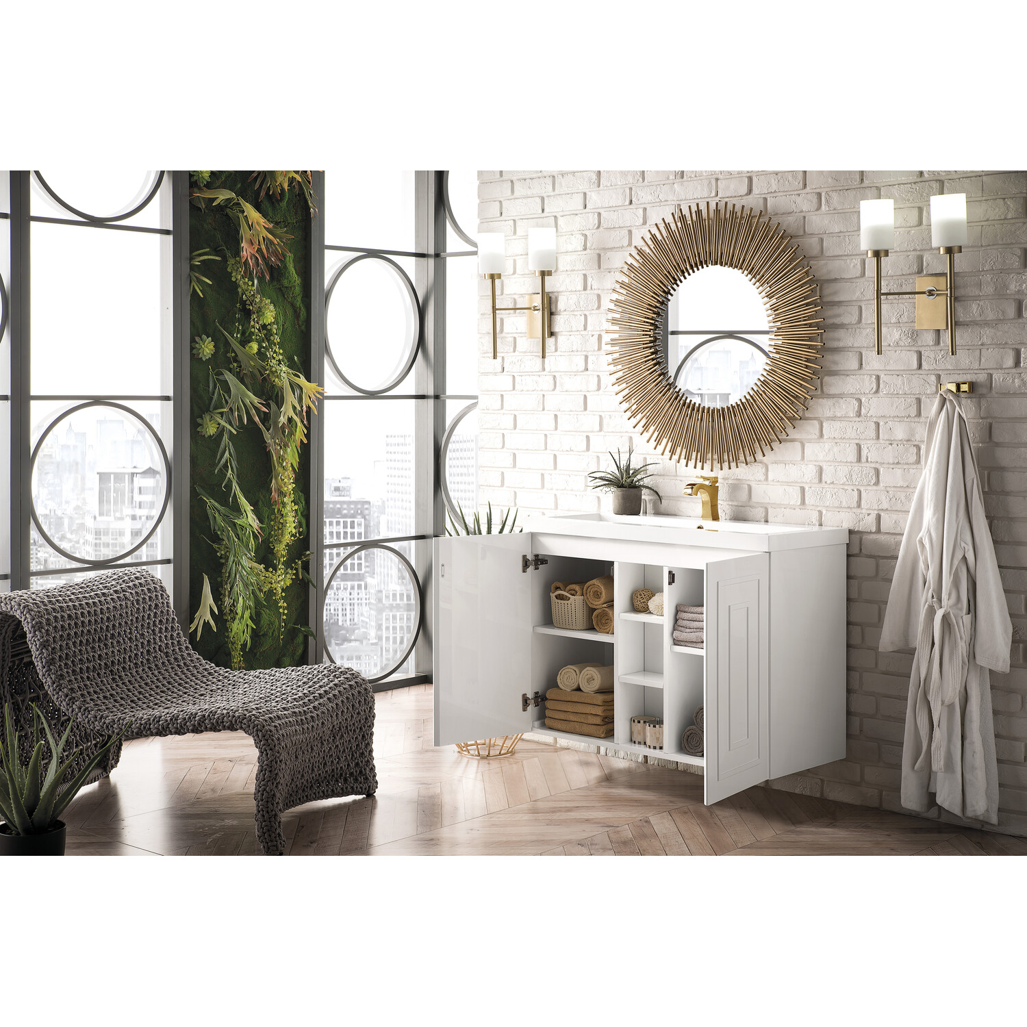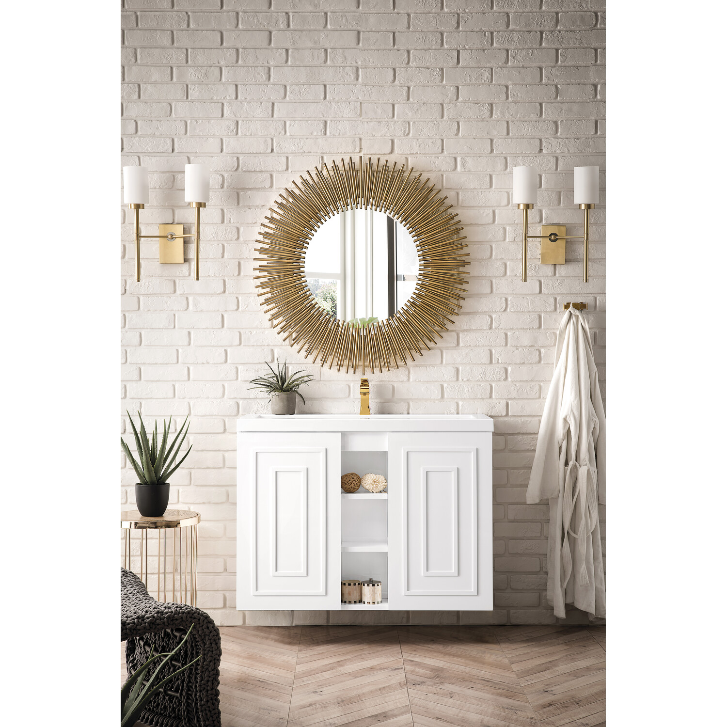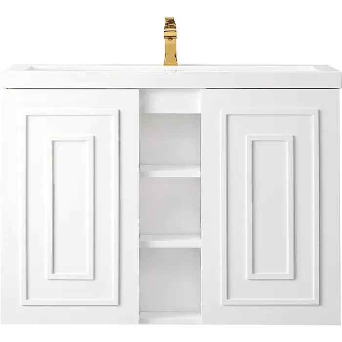 The Alicante 39.5” Glossy White Single Vanity by James Martin Vanities is the perfect choice for any bathroom upgrade. Fine detailing on the frame accents its streamlined appearance, while its wall-hung design gives it an updated modern appeal. Each door front has framed detailing, adding depth and visual interest to the piece. Keep all your toiletries, makeup and more in this elegant vanity. The look is completed with a Glossy White Composite Stone top and integrated sink.Two door Glossy White single vanity with interior and exterior shelf spaceVanity cabinet and Composite Stone integrated top and sink only; hardware not includedSolid kiln-dried Grade A hardwoodCabinet is finished inside and out with a premium undercoat finish for superior moisture and UV resistanceSoft-close door hingesWhite Glossy Composite Stone integrated top and sink includedCountertop is pre-drilled for one single hole faucetFaucet sold separatelyThis cabinet can be wall-hung; mounting hardware includedThe Alicante collection by James Martin Vanities offers big style in a subtle design. Its sleek metal base and raised panel doors create the perfect modern bathroom vanity. Constructed from fine quality solid hardwoods and comes with our top-rated composite countertop making this piece the epitome of luxury bathroom furniture. It’s timeless and versatile design is accentuated by its beautiful metal base and the vanity was built with external cubbies creating added storage for washroom essentials. This piece also gives you the option to float the look by removing the base. This vanity is sure to illuminate any bathroom with it’s opulent looks.1 year warranty against manufacturer's defects. We will repair or replace any defective product, if the product is defective in material or workmanship at our discretion. No warranty is expressed or implied regarding damages resulting from consumer misuse.