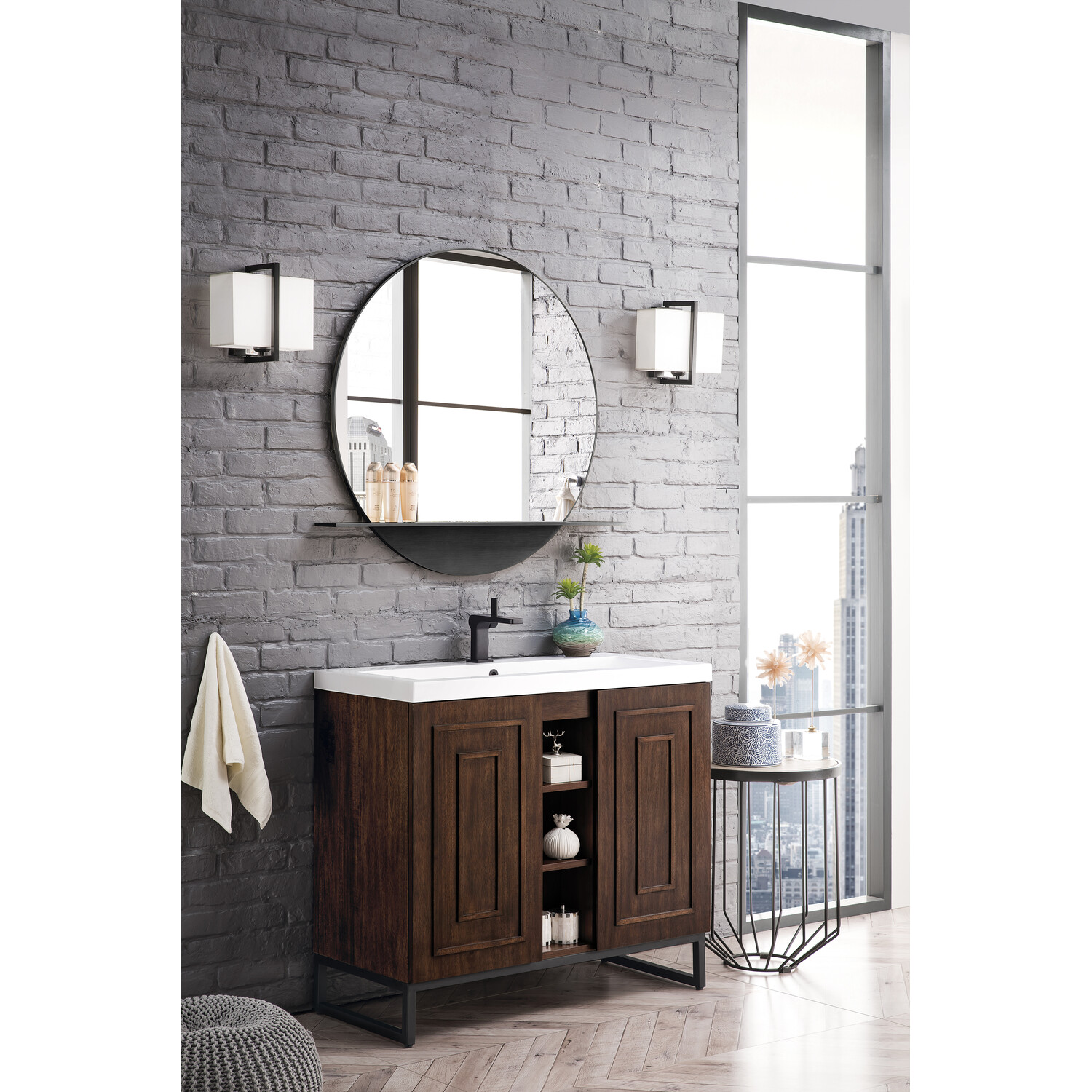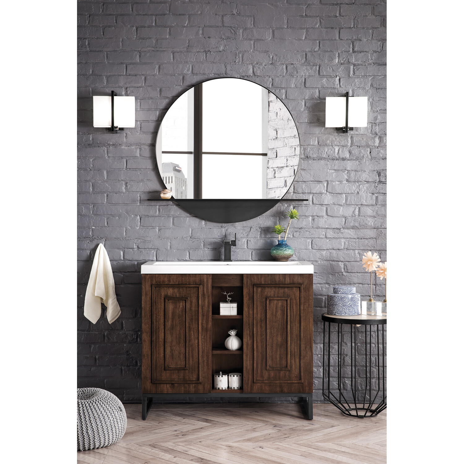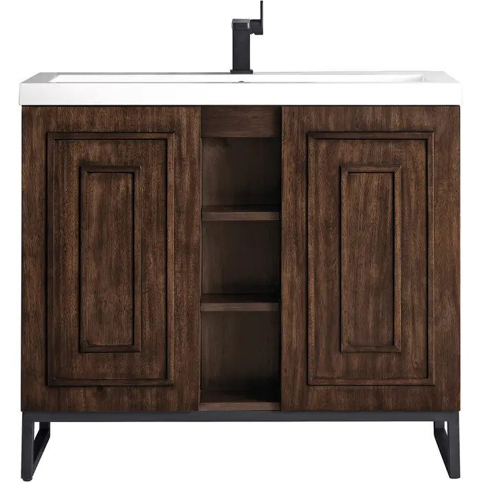 The Alicante 39.5” Mid-Century Acacia Single Vanity by James Martin Vanities is the perfect choice for any bathroom upgrade. Fine detailing on the frame accents its streamlined appearance, while its Matte Black metal base gives it an updated modern appeal. Each door front has framed detailing, adding depth and visual interest to the piece. Keep all your toiletries, makeup and more in this elegant vanity. The look is completed with a Mid-Century Acacia Composite Stone top and integrated sink.Two door Mid-Century Acacia single vanity with interior and exterior shelf spaceHardware/Stand Finish: Matte BlackSolid kiln-dried Grade A hardwoodCabinet is finished inside and out with a premium undercoat finish for superior moisture and UV resistanceSoft-close door hingesWhite Glossy Composite Stone integrated top and sink includedCountertop is pre-drilled for one single hole faucetFaucet sold separatelyThe Alicante collection by James Martin Vanities offers big style in a subtle design. Its sleek metal base and raised panel doors create the perfect modern bathroom vanity. Constructed from fine quality solid hardwoods and comes with our top-rated composite countertop making this piece the epitome of luxury bathroom furniture. It’s timeless and versatile design is accentuated by its beautiful metal base and the vanity was built with external cubbies creating added storage for washroom essentials. This piece also gives you the option to float the look by removing the base. This vanity is sure to illuminate any bathroom with it’s opulent looks.1 year warranty against manufacturer's defects. We will repair or replace any defective product, if the product is defective in material or workmanship at our discretion. No warranty is expressed or implied regarding damages resulting from consumer misuse.