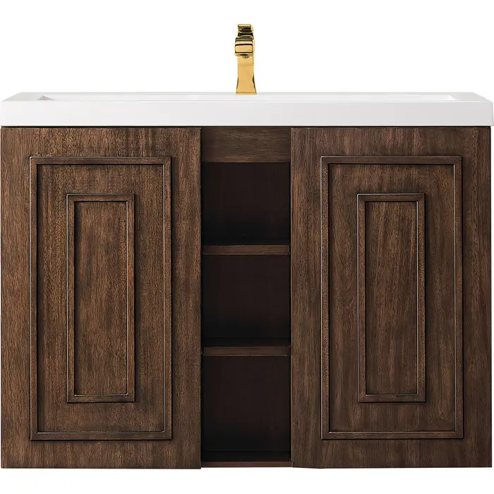 The Alicante 39.5” Mid-Century Acacia Single Vanity by James Martin Vanities is the perfect choice for any bathroom upgrade. Fine detailing on the frame accents its streamlined appearance, while its wall-hung design gives it an updated modern appeal. Each door front has framed detailing, adding depth and visual interest to the piece. Keep all your toiletries, makeup and more in this elegant vanity. The look is completed with a Mid-Century Acacia Composite Stone top and integrated sink.Two door Mid-Century Acacia single vanity with interior and exterior shelf spaceVanity cabinet and Composite Stone integrated top and sink only; hardware not includedSolid kiln-dried Grade A hardwoodCabinet is finished inside and out with a premium undercoat finish for superior moisture and UV resistanceSoft-close door hingesWhite Glossy Composite Stone integrated top and sink includedCountertop is pre-drilled for one single hole faucetFaucet sold separatelyThis cabinet can be wall-hung; mounting hardware includedThe Alicante collection by James Martin Vanities offers big style in a subtle design. Its sleek metal base and raised panel doors create the perfect modern bathroom vanity. Constructed from fine quality solid hardwoods and comes with our top-rated composite countertop making this piece the epitome of luxury bathroom furniture. It’s timeless and versatile design is accentuated by its beautiful metal base and the vanity was built with external cubbies creating added storage for washroom essentials. This piece also gives you the option to float the look by removing the base. This vanity is sure to illuminate any bathroom with it’s opulent looks.1 year warranty against manufacturer's defects. We will repair or replace any defective product, if the product is defective in material or workmanship at our discretion. No warranty is expressed or implied regarding damages resulting from consumer misuse.