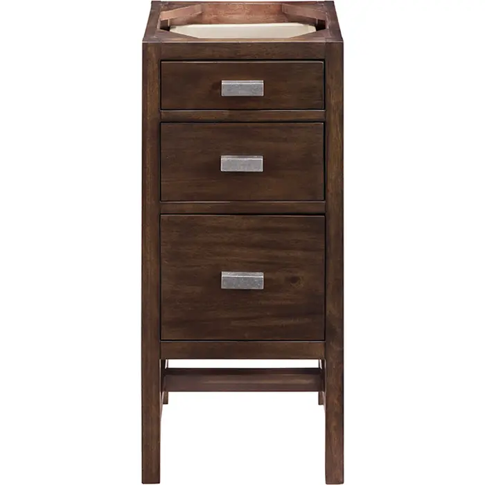 The Addison 15" Mid-Century Acacia Base Cabinet by James Martin Vanities gives you you a fresh take on Shaker-inspired design with a look of luxury. Handcrafted and gender-neutral, it fits effortlessly into modern or transitional rooms.Three drawer Mid-Century Acacia base cabinetHardware Finish: Burnished NickelSolid kiln-dried Grade A hardwoodCabinet is finished inside and out with a premium undercoat finish for superior moisture and UV resistanceSoft-close, full extension undermount drawer glidesOne bamboo drawer organizerBase cabinet only, countertop not includedBring the simplicity of Shaker-inspired design to your bath with the fully modular Addison Collection by James Martin Vanities. Handcrafted of solid parawood with a hand-applied finish. Each piece is finished inside and out for stand-alone application. Addison’s slim, strong lines will offer a substantial look and feel to any room as well as work with a wide variety of different decors. Square legs raise the cabinet to generous toe-kick space. This elegant modular collection comes beautifully hand-finished in two incredible finishes: a rich, warm mid-century acacia color or a crisp, clean glossy white color and is accented with burnished nickel hardware. For the ultimate in versatility, door panels reverse to textural cork in an elegant herringbone pattern giving you two looks in one. The Addison Collection harmoniously blends the best of both contemporary and transitional looks evoking a sense of solace and relaxation1 year warranty against manufacturer's defects. We will repair or replace any defective product, if the product is defective in material or workmanship at our discretion. No warranty is expressed or implied regarding damages resulting from consumer misuse.