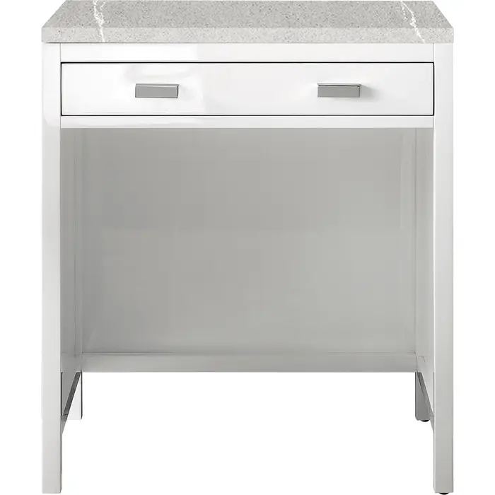 The Addison 30" Glossy White Countertop Unit by James Martin Vanities gives you a fresh take on Shaker-inspired design with a look of luxury. Handcrafted and gender-neutral, it fits effortlessly into modern or transitional rooms. The look is completed with a 3 CM eased edge Eternal Serena Silestone top.One drawer Glossy White countertop unit (makeup counter)Hardware Finish: Polished ChromeSolid kiln-dried Grade A hardwoodCabinet is finished inside and out with a premium undercoat finish for superior moisture and UV resistanceSoft-close undermount drawer glidesOne bamboo drawer organizer3 CM eased edge Eternal Serena Silestone top includedBring the simplicity of Shaker-inspired design to your bath with the fully modular Addison Collection by James Martin Vanities. Handcrafted of solid parawood with a hand-applied finish. Each piece is finished inside and out for stand-alone application. Addison’s slim, strong lines will offer a substantial look and feel to any room as well as work with a wide variety of different decors. Square legs raise the cabinet to generous toe-kick space. This elegant modular collection comes beautifully hand-finished in two incredible finishes: a rich, warm mid-century acacia color or a crisp, clean glossy white color and is accented with polished chrome hardware. For the ultimate in versatility, door panels reverse to textural cork in an elegant herringbone pattern giving you two looks in one. The Addison Collection harmoniously blends the best of both contemporary and transitional looks evoking a sense of solace and relaxation1 year warranty against manufacturer's defects. We will repair or replace any defective product, if the product is defective in material or workmanship at our discretion. No warranty is expressed or implied regarding damages resulting from consumer misuse.