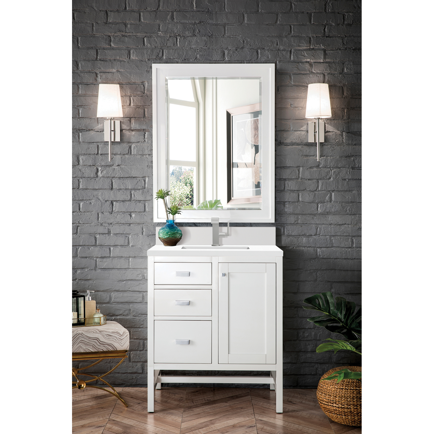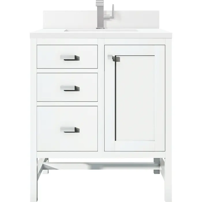 The Addison 30" Single Vanity Cabinet by James Martin Vanities lends a fresh take on Shaker-inspired design with a look of luxury. Handcrafted and gender-neutral, it fits effortlessly into modern or transitional rooms. The Shaker styling comes from the cabinet's distinct sides, drawers, and door. Premium standard features include soft-close, full extension under-mount drawer glides and adjustable door hinges, brushed aluminum laminate drawer bottoms, one 120 Volt UL-rated electrical component with two electrical and two USB outlets, and one bamboo drawer organizer. The timeless, White Zeus Silestone top and backsplash provides a contemporary touch.Vanity set includes a 3cm eased edge White Zeus Silestone top with matching backsplash, a white porcelain rectangular sink and mounting brackets for easy installation. Top is pre-drilled for single hole faucet. Faucet not included.One-door single vanity cabinet with three drawers and interior shelf spaceCrafted from Poplar solids and plywood and is sealed inside and outside with our premium moisture and UV resistant coatingDrawer boxes are constructed using English Dovetail joinery, feature soft-close undermount glides and a Brushed Aluminum laminate drawer bottom.Polished Chrome hardwareIncludes one removable Bamboo drawer organizer trayIncludes a 120 UL-rated electrical component with dual power outlets and USB (Type A) portsMatching White Zeus 3cm Silestone backsplash included.Faucet sold separatelyBring the simplicity of Shaker-inspired design to your bath with the fully modular Addison Collection by James Martin Vanities. Handcrafted with either solid poplar (bright white) or parawood (mid-century acacia) with a hand-applied finish. Each piece is finished inside and out for stand-alone application. Addison’s slim, strong lines will offer a substantial look and feel to any room as well as work with a wide variety of different decors. Square legs elevate the cabinet providing ample toe-kick space. This elegant modular collection comes in two incredible finishes: a rich, warm mid-century acacia accented with burnished nickel or a crisp, clean glossy white which is accented with polished chrome hardware. For the ultimate in versatility, the door panels reverse to textural cork with the mid-century acacia this comes in an elegant herringbone pattern whereas the bright white has a Casablanca cork pattern giving you two looks in one. The Addison Collection harmoniously blends the best of both contemporary and transitional looks evoking a sense of solace and relaxation.1 year warranty against manufacturer's defects. We will repair or replace any defective product, if the product is defective in material or workmanship at our discretion. No warranty is expressed or implied regarding damages resulting from consumer misuse.