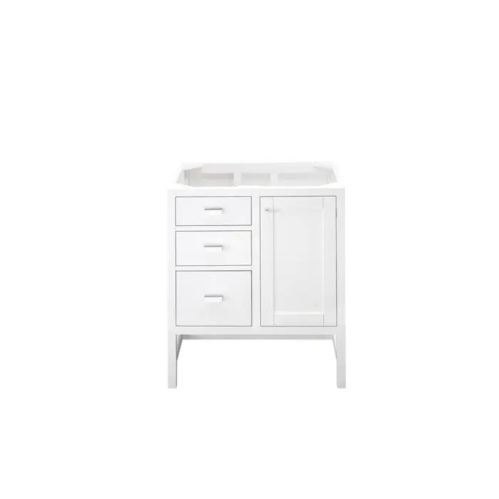The Addison 30" Single Vanity Cabinet by James Martin Vanities gives you a fresh take on Shaker-inspired design with a look of luxury. Handcrafted and gender-neutral, it fits effortlessly into modern or transitional rooms. The Shaker styling comes from the cabinet's distinct sides, drawers, and door. Premium standard features include soft-close, full extension under-mount drawer glides and adjustable door hinges, brushed aluminum laminate drawer bottoms, one 120 Volt UL-rated electrical component with two electrical and two USB outlets, and one bamboo drawer organizer. The body of the cabinet is made of solid hardwood and sturdy panels of MDF.One-door single vanity cabinet with three drawers and interior shelf spaceHardware Finish: Polished ChromeSolid kiln-dried Grade A hardwoodCabinet is finished inside and out with a premium undercoat finish for superior moisture and UV resistancePremium soft-close door hinges and full-extension, soft-close, under-mount drawer slidesDrawer bottoms are lined with our signature brushed aluminum laminate for easy cleaningComes with a 120 UL-rated electrical component with dual power outlets and USB (Type A) portsOne bamboo drawer organizerCabinet only, countertop and sink not includedBring the simplicity of Shaker-inspired design to your bath with the fully modular Addison Collection by James Martin Vanities. Handcrafted with either solid poplar (bright white) or parawood (mid-century acacia) with a hand-applied finish. Each piece is finished inside and out for stand-alone application. Addison’s slim, strong lines will offer a substantial look and feel to any room as well as work with a wide variety of different decors. Square legs elevate the cabinet providing ample toe-kick space. This elegant modular collection comes in two incredible finishes: a rich, warm mid-century acacia accented with burnished nickel or a crisp, clean glossy white which is accented with polished chrome hardware. For the ultimate in versatility, the door panels reverse to textural cork with the mid-century acacia this comes in an elegant herringbone pattern whereas the bright white has a Casablanca cork pattern giving you two looks in one. The Addison Collection harmoniously blends the best of both contemporary and transitional looks evoking a sense of solace and relaxation.1 year warranty against manufacturer's defects. We will repair or replace any defective product, if the product is defective in material or workmanship at our discretion. No warranty is expressed or implied regarding damages resulting from consumer misuse.