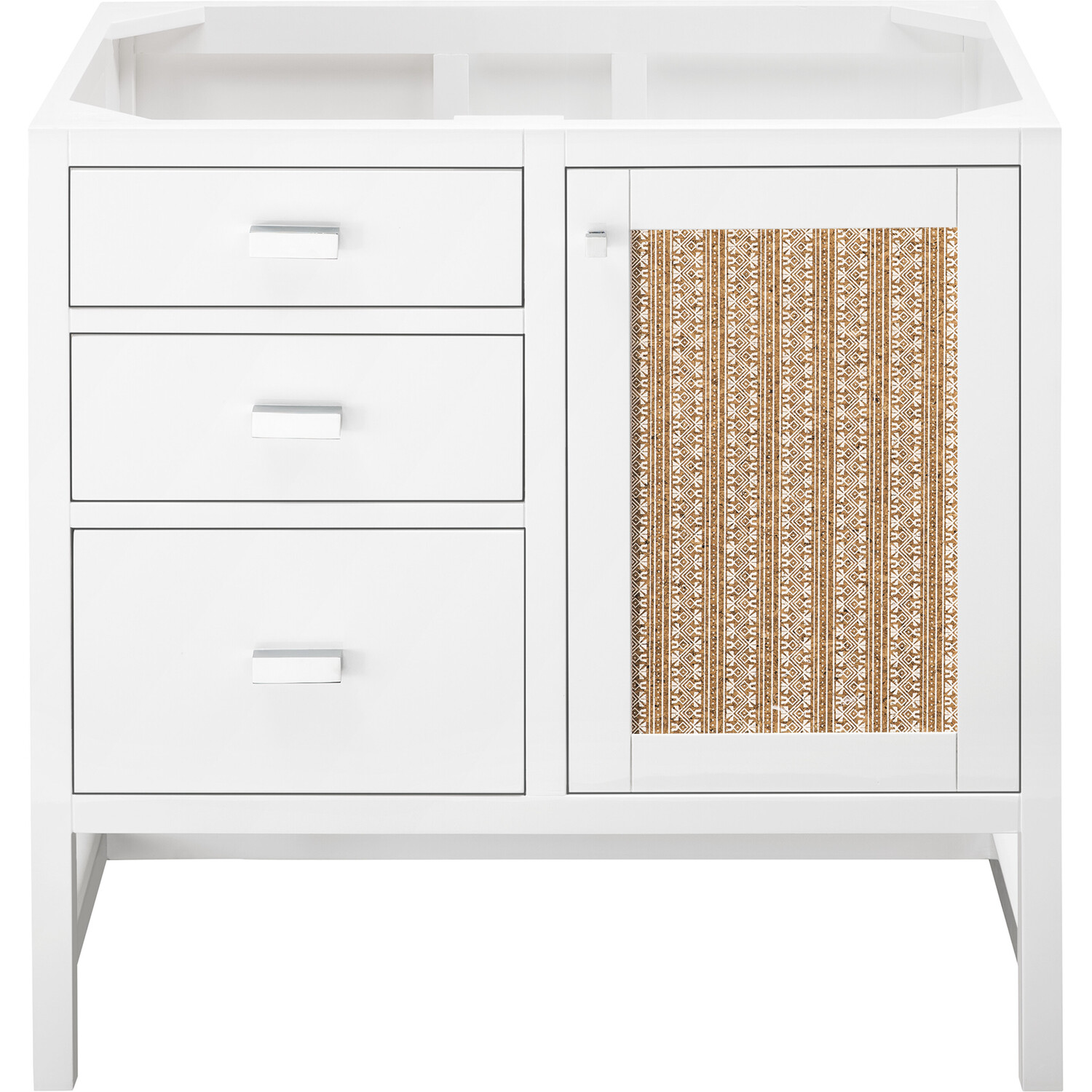 The Addison 36" Single Vanity Cabinet by James Martin Vanities gives you a fresh take on Shaker-inspired design with a look of luxury. Handcrafted and gender-neutral, it fits effortlessly into modern or transitional rooms. The Shaker styling comes from the cabinet's distinct sides, drawers, and door. Premium standard features include soft-close, full extension under-mount drawer glides and adjustable door hinges, brushed aluminum laminate drawer bottoms, one 120 Volt UL-rated electrical component with two electrical and two USB outlets, and one bamboo drawer organizer. The body of the cabinet is made of solid hardwood and sturdy panels of MDF.One-door single vanity cabinet with three drawers and interior shelf spaceHardware Finish: Polished ChromeSolid kiln-dried Grade A hardwoodCabinet is finished inside and out with a premium undercoat finish for superior moisture and UV resistancePremium soft-close door hinges and full-extension, soft-close, under-mount drawer slidesDrawer bottoms are lined with our signature brushed aluminum laminate for easy cleaningComes with a 120 UL-rated electrical component with dual power outlets and USB (Type A) portsOne bamboo drawer organizerCabinet only, countertop and sink not includedBring the simplicity of Shaker-inspired design to your bath with the fully modular Addison Collection by James Martin Vanities. Handcrafted with either solid poplar (bright white) or parawood (mid-century acacia) with a hand-applied finish. Each piece is finished inside and out for stand-alone application. Addison’s slim, strong lines will offer a substantial look and feel to any room as well as work with a wide variety of different decors. Square legs elevate the cabinet providing ample toe-kick space. This elegant modular collection comes in two incredible finishes: a rich, warm mid-century acacia accented with burnished nickel or a crisp, clean glossy white which is accented with polished chrome hardware. For the ultimate in versatility, the door panels reverse to textural cork with the mid-century acacia this comes in an elegant herringbone pattern whereas the bright white has a Casablanca cork pattern giving you two looks in one. The Addison Collection harmoniously blends the best of both contemporary and transitional looks evoking a sense of solace and relaxation.1 year warranty against manufacturer's defects. We will repair or replace any defective product, if the product is defective in material or workmanship at our discretion. No warranty is expressed or implied regarding damages resulting from consumer misuse.