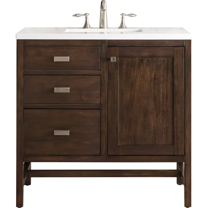 James Martin Addison 36 inch Single Bathroom Vanity, Mid-Century Acacia w/ 3 CM White Zeus Quartz Top E444-V36-MCA-3WZ