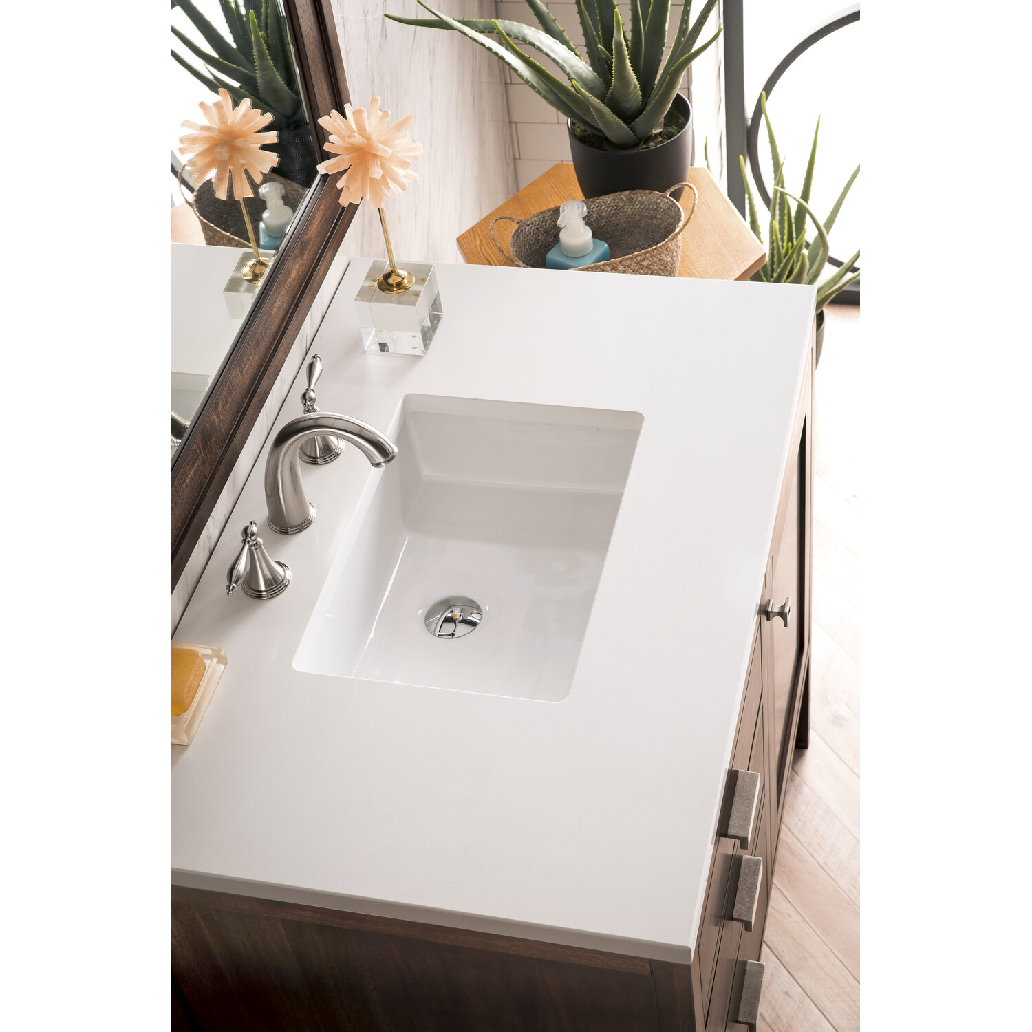 The Addison 36" Single Vanity Cabinet by James Martin Vanities gives you a fresh take on Shaker-inspired design with a look of luxury. Handcrafted and gender-neutral, it fits effortlessly into modern or transitional rooms. The Shaker styling comes from the cabinet's distinct sides, drawers, and door. Premium standard features include soft-close, full extension under-mount drawer glides and adjustable door hinges, brushed aluminum laminate drawer bottoms, one 120 Volt UL-rated electrical component with two electrical and two USB outlets, and one bamboo drawer organizer. The body of the cabinet is made of solid hardwood and sturdy panels of MDF. The look is completed with a 3 cm eased edge Silestone White Zeus Silestone top and one white ceramic rectangular sink.One-door single vanity cabinet with three drawers and interior shelf spaceHardware Finish: Burnished NickelSolid kiln-dried Grade A hardwoodCabinet is finished inside and out with a premium undercoat finish for superior moisture and UV resistancePremium soft-close door hinges and full-extension, soft-close, under-mount drawer slidesDrawer bottoms are lined with our signature brushed aluminum laminate for easy cleaningComes with a 120 UL-rated electrical component with dual power outlets and USB (Type A) portsOne bamboo drawer organizer3 cm eased edge White Zeus Silestone top and one white porcelain rectangular sinkFaucet sold separatelyThe countertop is pre-drilled for one 3-hole 8" widespreadBring the simplicity of Shaker-inspired design to your bath with the fully modular Addison Collection by James Martin Vanities. Handcrafted with either solid poplar (bright white) or parawood (mid-century acacia) with a hand-applied finish. Each piece is finished inside and out for stand-alone application. Addison’s slim, strong lines will offer a substantial look and feel to any room as well as work with a wide variety of different decors. Square legs elevate the cabinet providing ample toe-kick space. This elegant modular collection comes in two incredible finishes: a rich, warm mid-century acacia accented with burnished nickel or a crisp, clean glossy white which is accented with polished chrome hardware. For the ultimate in versatility, the door panels reverse to textural cork with the mid-century acacia this comes in an elegant herringbone pattern whereas the bright white has a Casablanca cork pattern giving you two looks in one. The Addison Collection harmoniously blends the best of both contemporary and transitional looks evoking a sense of solace and relaxation.1 year warranty against manufacturer's defects. We will repair or replace any defective product, if the product is defective in material or workmanship at our discretion. No warranty is expressed or implied regarding damages resulting from consumer misuse.
