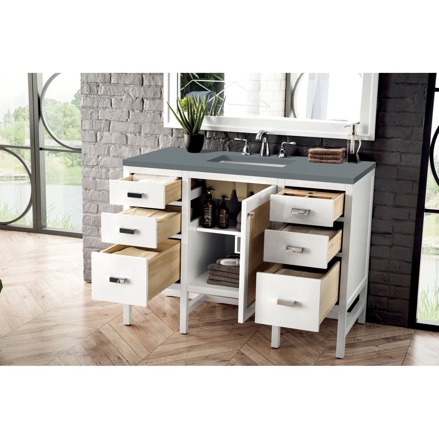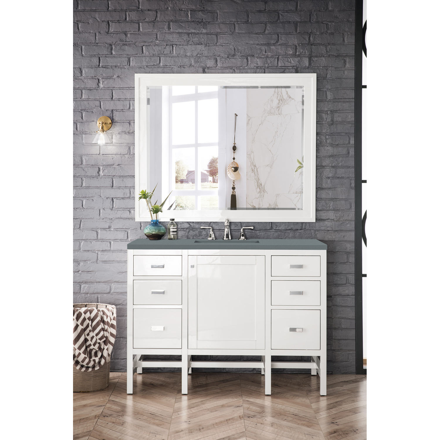 The Addison 48" Glossy White Single Vanity by James Martin Vanities gives you you a fresh take on Shaker-inspired design with a look of luxury. Handcrafted and gender-neutral, it fits effortlessly into modern or transitional rooms. The Shaker touch comes from the cabinet's distinct sides, drawers, and door. Premium standard features include soft-close undermount drawer glides and adjustable door hinges, brushed aluminium laminate drawer bottoms, one 120 Volt UL rated electrical component with two electrical and two USB outlets, and one bamboo drawer organizer. The body of the cabinet is made of solid hardwood and sturdy panels of MDF. The look is completed with a 3 CM eased edge Cala Blue Silestone top and one white ceramic rectangular sink.Two door Glossy White single vanity with three drawers and interior shelf spaceHardware Finish: Polished ChromeSolid kiln-dried Grade A hardwoodCabinet is finished inside and out with a premium undercoat finish for superior moisture and UV resistancePremium soft-close door hinges and full-extension, soft-close, under-mount drawer slidesDrawer bottoms are lined with our signature brushed aluminum laminate for easy cleaningComes with a 120 UL-rated electrical component with dual power outlets and USB (Type A) portsOne bamboo drawer organizer3 cm eased edge Cala Blue Silestone top and one white porcelain rectangular sinkFaucet sold separatelyThe countertop is pre-drilled for one 3-hole 8" widespreadBring the simplicity of Shaker-inspired design to your bath with the fully modular Addison Collection by James Martin Vanities. Handcrafted with either solid poplar (bright white) or parawood (mid-century acacia) with a hand-applied finish. Each piece is finished inside and out for stand-alone application. Addison’s slim, strong lines will offer a substantial look and feel to any room as well as work with a wide variety of different decors. Square legs elevate the cabinet providing ample toe-kick space. This elegant modular collection comes in two incredible finishes: a rich, warm mid-century acacia accented with burnished nickel or a crisp, clean glossy white which is accented with polished chrome hardware. For the ultimate in versatility, the door panels reverse to textural cork with the mid-century acacia this comes in an elegant herringbone pattern whereas the bright white has a Casablanca cork pattern giving you two looks in one. The Addison Collection harmoniously blends the best of both contemporary and transitional looks evoking a sense of solace and relaxation.1 year warranty against manufacturer's defects. We will repair or replace any defective product, if the product is defective in material or workmanship at our discretion. No warranty is expressed or implied regarding damages resulting from consumer misuse.