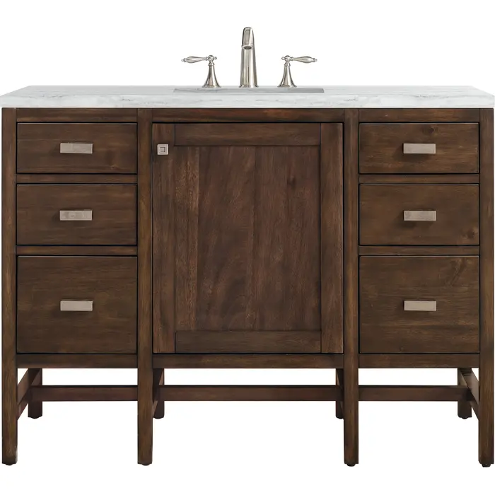 The Addison 48" Mid-Century Acacia Single Vanity by James Martin Vanities gives you you a fresh take on Shaker-inspired design with a look of luxury. Handcrafted and gender-neutral, it fits effortlessly into modern or transitional rooms. The Shaker touch comes from the cabinet's distinct sides, drawers, and door. Premium standard features include soft-close undermount drawer glides and adjustable door hinges, brushed aluminium laminate drawer bottoms, one 120 Volt UL rated electrical component with two electrical and two USB outlets, and one bamboo drawer organizer. The body of the cabinet is made of solid hardwood and sturdy panels of MDF. The look is completed with a 3 CM eased edge Arctic Fall Solid Surface top and one white ceramic rectangular sink.Two door Mid-Century Acacia single vanity with three drawers and interior shelf spaceHardware Finish: Burnished NickelSolid kiln-dried Grade A hardwoodCabinet is finished inside and out with a premium undercoat finish for superior moisture and UV resistancePremium soft-close door hinges and full-extension, soft-close, under-mount drawer slidesDrawer bottoms are lined with our signature brushed aluminum laminate for easy cleaningComes with a 120 UL-rated electrical component with dual power outlets and USB (Type A) portsOne bamboo drawer organizer3 cm eased edge Arctic Fall solid surface top and one white porcelain rectangular sinkFaucet sold separatelyThe countertop is pre-drilled for one 3-hole 8" widespreadBring the simplicity of Shaker-inspired design to your bath with the fully modular Addison Collection by James Martin Vanities. Handcrafted with either solid poplar (bright white) or parawood (mid-century acacia) with a hand-applied finish. Each piece is finished inside and out for stand-alone application. Addison’s slim, strong lines will offer a substantial look and feel to any room as well as work with a wide variety of different decors. Square legs elevate the cabinet providing ample toe-kick space. This elegant modular collection comes in two incredible finishes: a rich, warm mid-century acacia accented with burnished nickel or a crisp, clean glossy white which is accented with polished chrome hardware. For the ultimate in versatility, the door panels reverse to textural cork with the mid-century acacia this comes in an elegant herringbone pattern whereas the bright white has a Casablanca cork pattern giving you two looks in one. The Addison Collection harmoniously blends the best of both contemporary and transitional looks evoking a sense of solace and relaxation.1 year warranty against manufacturer's defects. We will repair or replace any defective product, if the product is defective in material or workmanship at our discretion. No warranty is expressed or implied regarding damages resulting from consumer misuse.