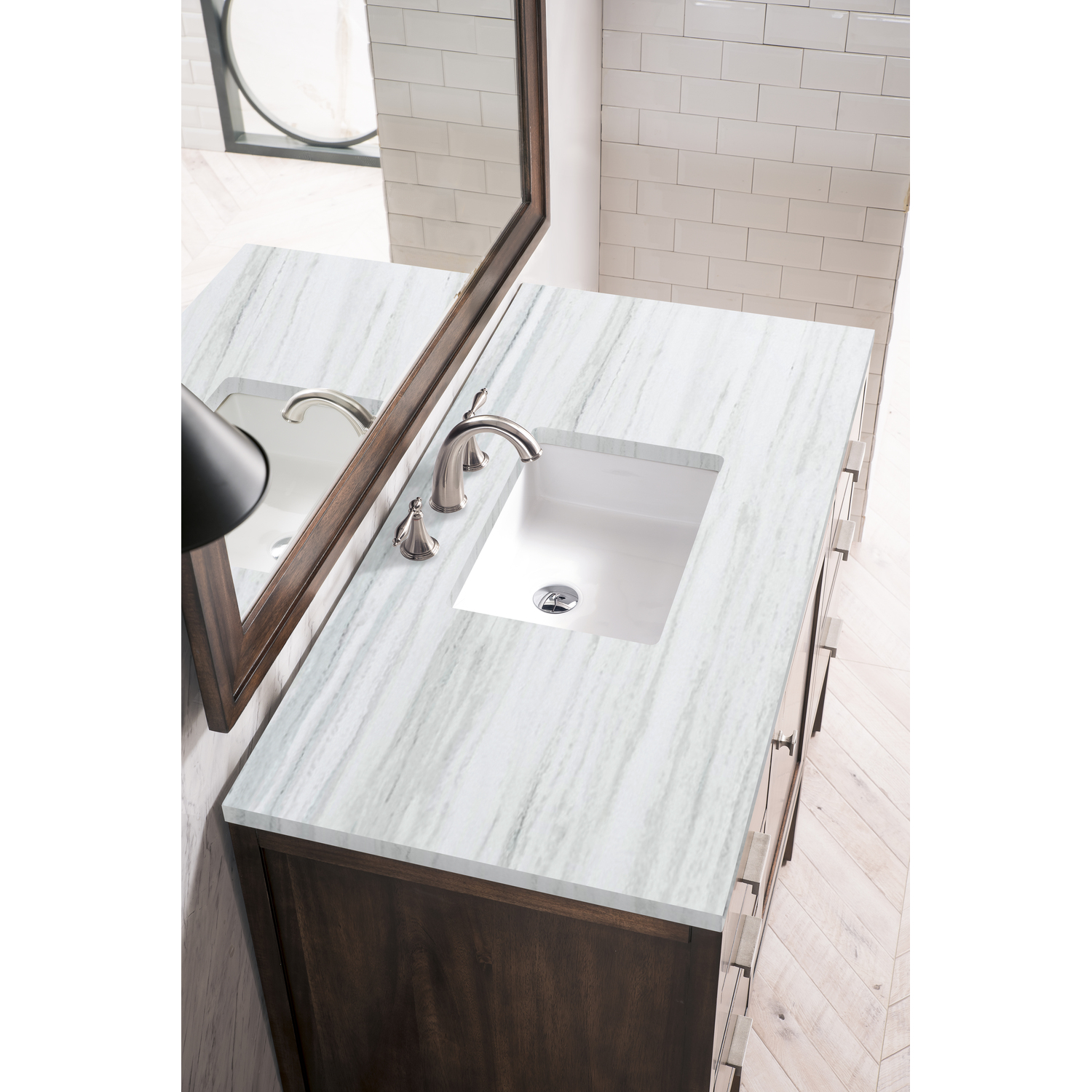 - Bring the simplicity of Shaker-inspired design to your bath with the fully modular Addison Collection by James Martin Vanities. Handcrafted of solid parawood with a hand-applied finish. Each piece is finished inside and out for stand-alone application. Addison’s slim, strong lines will offer a substantial look and feel to any room as well as work with a wide variety of different decors. Square legs raise the cabinet to generous toe-kick space. This elegant modular collection comes beautifully hand-finished in two incredible finishes: a rich, warm mid-century acacia color or a crisp, clean glossy white color and is accented with burnished nickel hardware. For the ultimate in versatility, door panels reverse to textural cork in an elegant herringbone pattern giving you two looks in one. The Addison Collection harmoniously blends the best of both contemporary and transitional looks evoking a sense of solace and relaxation