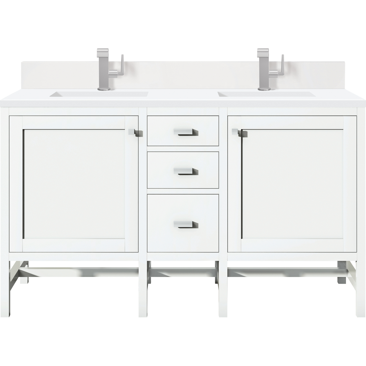 The Addison 60" Glossy White Double Vanity by James Martin Vanities lends a fresh take on Shaker-inspired design with a look of luxury. Handcrafted and gender-neutral, it fits effortlessly into modern or transitional rooms. The Shaker touch comes from the cabinet's distinct sides, drawers, and doors. Premium standard features include soft-close undermount drawer glides and adjustable door hinges, brushed aluminum laminate drawer bottoms, one 120 Volt UL rated electrical component with two electrical and two USB outlets, and one bamboo drawer organizer. The timeless, White Zeus Silestone top and backsplash provides a contemporary touch.Vanity set includes a 3cm eased edge White Zeus Silestone top with matching backsplash, two white porcelain rectangular sinks and mounting brackets for easy installation. Top is pre-drilled for two single hole faucets. Faucets not included.Two-door single vanity cabinet with three drawers and interior shelf spaceCrafted from Poplar solids and plywood and is sealed inside and outside with our premium moisture and UV resistant coatingDrawer boxes are constructed using English Dovetail joinery, feature soft-close undermount glides and a Brushed Aluminum laminate drawer bottom.Polished Chrome hardwareIncludes one removable Bamboo drawer organizer trayIncludes a 120 UL-rated electrical component with dual power outlets and USB (Type A) portsMatching White Zeus 3cm Silestone backsplash included.Faucets sold separatelyBring the simplicity of Shaker-inspired design to your bath with the fully modular Addison Collection by James Martin Vanities. Handcrafted with either solid poplar (bright white) or parawood (mid-century acacia) with a hand-applied finish. Each piece is finished inside and out for stand-alone application. Addison’s slim, strong lines will offer a substantial look and feel to any room as well as work with a wide variety of different decors. Square legs elevate the cabinet providing ample toe-kick space. This elegant modular collection comes in two incredible finishes: a rich, warm mid-century acacia accented with burnished nickel or a crisp, clean glossy white which is accented with polished chrome hardware. For the ultimate in versatility, the door panels reverse to textural cork with the mid-century acacia this comes in an elegant herringbone pattern whereas the bright white has a Casablanca cork pattern giving you two looks in one. The Addison Collection harmoniously blends the best of both contemporary and transitional looks evoking a sense of solace and relaxation.1 year warranty against manufacturer's defects. We will repair or replace any defective product, if the product is defective in material or workmanship at our discretion. No warranty is expressed or implied regarding damages resulting from consumer misuse.