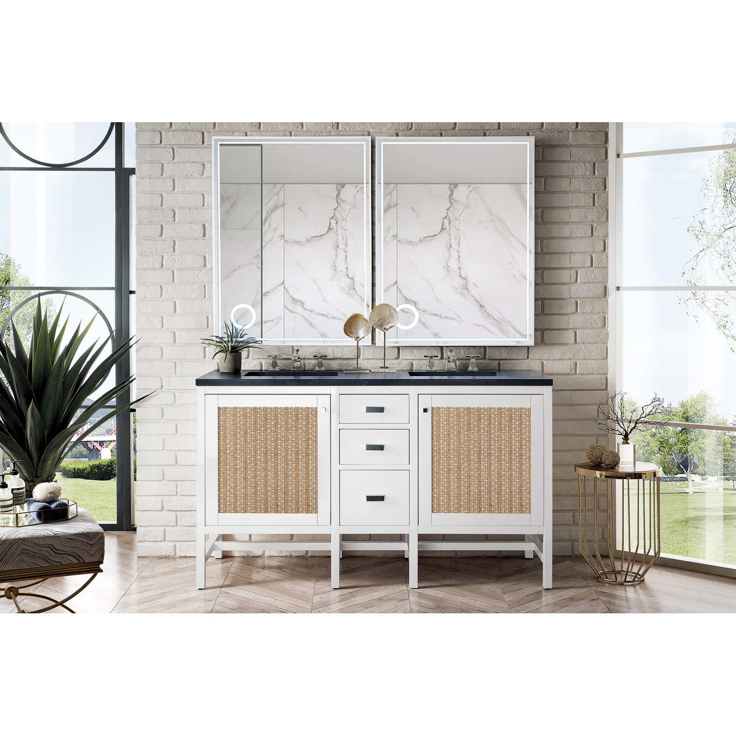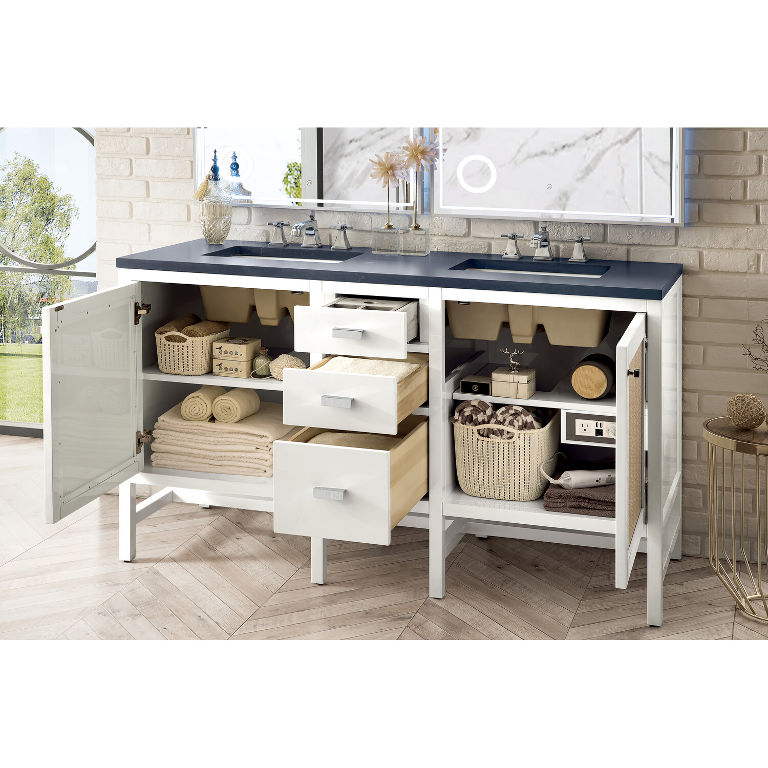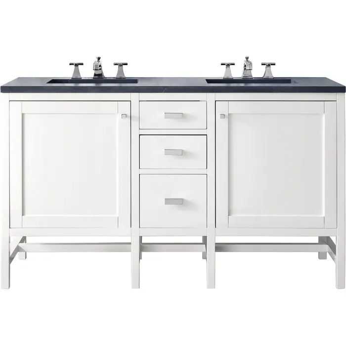 The Addison 60" Glossy White Double Vanity by James Martin Vanities gives you you a fresh take on Shaker-inspired design with a look of luxury. Handcrafted and gender-neutral, it fits effortlessly into modern or transitional rooms. The Shaker touch comes from the cabinet's distinct sides, drawers, and doors. Premium standard features include soft-close undermount drawer glides and adjustable door hinges, brushed aluminium laminate drawer bottoms, one 120 Volt UL rated electrical component with two electrical and two USB outlets, and one bamboo drawer organizer. The body of the cabinet is made of solid hardwood and sturdy panels of MDF. The look is completed with a 3 CM eased edge Charcoal Soapstone Silestone top and two white ceramic rectangular sinks.Two door Glossy White single vanity with three drawers and interior shelf spaceHardware Finish: Polished ChromeSolid kiln-dried Grade A hardwoodCabinet is finished inside and out with a premium undercoat finish for superior moisture and UV resistancePremium soft-close door hinges and full-extension, soft-close, under-mount drawer slidesDrawer bottoms are lined with our signature brushed aluminum laminate for easy cleaningComes with a 120 UL-rated electrical component with dual power outlets and USB (Type A) portsOne bamboo drawer organizer3 cm eased edge Charcoal Soapstone Silestone top and one white porcelain rectangular sinkFaucets sold separatelyThe countertop is pre-drilled for one 3-hole 8" widespreadBring the simplicity of Shaker-inspired design to your bath with the fully modular Addison Collection by James Martin Vanities. Handcrafted with either solid poplar (bright white) or parawood (mid-century acacia) with a hand-applied finish. Each piece is finished inside and out for stand-alone application. Addison’s slim, strong lines will offer a substantial look and feel to any room as well as work with a wide variety of different decors. Square legs elevate the cabinet providing ample toe-kick space. This elegant modular collection comes in two incredible finishes: a rich, warm mid-century acacia accented with burnished nickel or a crisp, clean glossy white which is accented with polished chrome hardware. For the ultimate in versatility, the door panels reverse to textural cork with the mid-century acacia this comes in an elegant herringbone pattern whereas the bright white has a Casablanca cork pattern giving you two looks in one. The Addison Collection harmoniously blends the best of both contemporary and transitional looks evoking a sense of solace and relaxation.1 year warranty against manufacturer's defects. We will repair or replace any defective product, if the product is defective in material or workmanship at our discretion. No warranty is expressed or implied regarding damages resulting from consumer misuse.