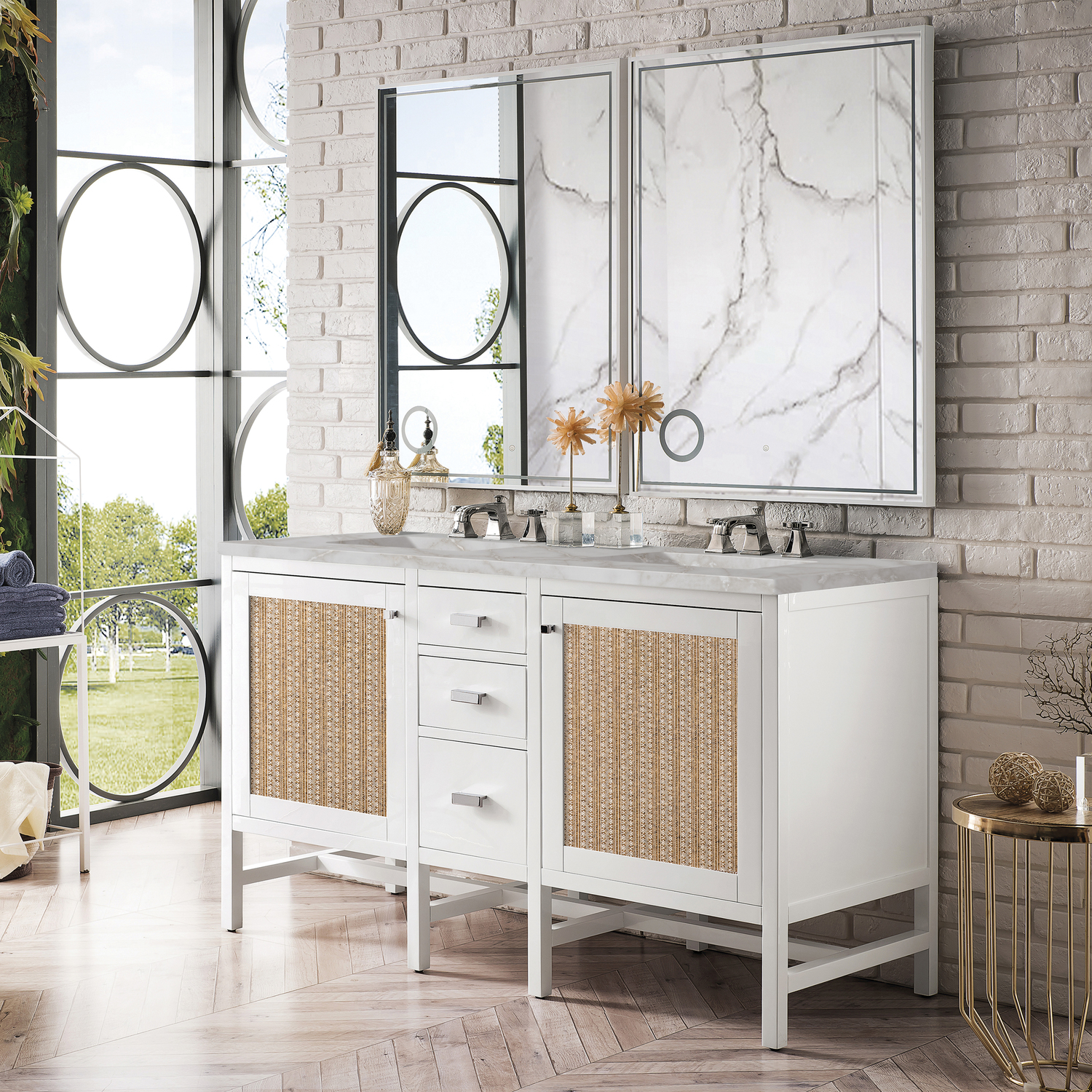 The Addison 60" Glossy White Double Vanity by James Martin Vanities lends a fresh take on Shaker-inspired design with a look of luxury. Handcrafted and gender-neutral, it fits effortlessly into modern or transitional rooms. The Shaker touch comes from the cabinet's distinct sides, drawers, and doors. Premium standard features include soft-close undermount drawer glides and adjustable door hinges, brushed aluminum laminate drawer bottoms, one 120 Volt UL rated electrical component with two electrical and two USB outlets, and one bamboo drawer organizer. The Bright White finish is accented by the neutral background of the Victorian Silver Silestone top, boasting champagne metallic accents which seamlessly complement wood tones.Vanity set includes a 3cm eased edge Victorian Silver Silestone top, two white porcelain rectangular sinks and mounting brackets for easy installation. Top is pre-drilled for two 8" widespread faucets. Faucets not included.Two-door single vanity cabinet with three drawers and interior shelf spaceCrafted from Poplar solids and plywood and is sealed inside and outside with our premium moisture and UV resistant coatingDrawer boxes are constructed using English Dovetail joinery, feature soft-close undermount glides and a Brushed Aluminum laminate drawer bottom.Polished Chrome hardwareIncludes one removable Bamboo drawer organizer trayIncludes a 120 UL-rated electrical component with dual power outlets and USB (Type A) portsFaucets sold separatelyCountertop is pre-drilled for one 3-hole 8" widespreadBring the simplicity of Shaker-inspired design to your bath with the fully modular Addison Collection by James Martin Vanities. Handcrafted with either solid poplar (bright white) or parawood (mid-century acacia) with a hand-applied finish. Each piece is finished inside and out for stand-alone application. Addison’s slim, strong lines will offer a substantial look and feel to any room as well as work with a wide variety of different decors. Square legs elevate the cabinet providing ample toe-kick space. This elegant modular collection comes in two incredible finishes: a rich, warm mid-century acacia accented with burnished nickel or a crisp, clean glossy white which is accented with polished chrome hardware. For the ultimate in versatility, the door panels reverse to textural cork with the mid-century acacia this comes in an elegant herringbone pattern whereas the bright white has a Casablanca cork pattern giving you two looks in one. The Addison Collection harmoniously blends the best of both contemporary and transitional looks evoking a sense of solace and relaxation.1 year warranty against manufacturer's defects. We will repair or replace any defective product, if the product is defective in material or workmanship at our discretion. No warranty is expressed or implied regarding damages resulting from consumer misuse.