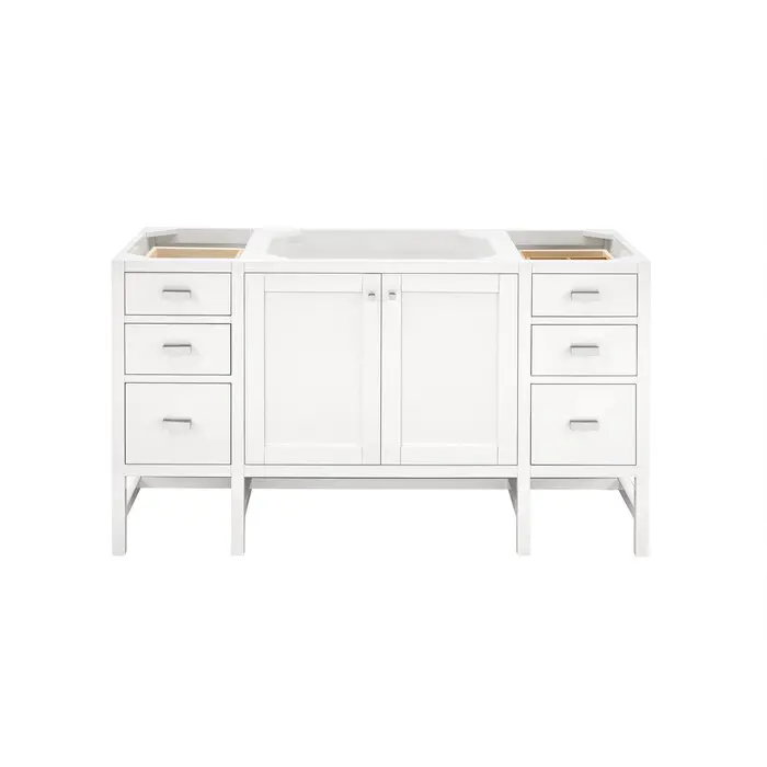 The Addison 60" Glossy White Single Vanity Cabinet by James Martin Vanities gives you you a fresh take on Shaker-inspired design with a look of luxury. Handcrafted and gender-neutral, it fits effortlessly into modern or transitional rooms. The Shaker touch comes from the cabinet's distinct sides, drawers, and doors. Premium standard features include soft-close undermount drawer glides and adjustable door hinges, brushed aluminium laminate drawer bottoms, one 120 Volt UL rated electrical component with two electrical and two USB outlets, and one bamboo drawer organizer. The body of the cabinet is made of solid hardwood and sturdy panels of MDF.Two door Glossy White single vanity cabinet with six drawers and interior shelf spaceHardware Finish: Polished ChromeSolid kiln-dried Grade A hardwoodCabinet is finished inside and out with a premium undercoat finish for superior moisture and UV resistancePremium soft-close door hinges and full-extension, soft-close, under-mount drawer slidesDrawer bottoms are lined with our signature brushed aluminum laminate for easy cleaningComes with a 120 UL-rated electrical component with dual power outlets and USB (Type A) portsOne bamboo drawer organizerCabinet only, countertop and sink not includedBring the simplicity of Shaker-inspired design to your bath with the fully modular Addison Collection by James Martin Vanities. Handcrafted with either solid poplar (bright white) or parawood (mid-century acacia) with a hand-applied finish. Each piece is finished inside and out for stand-alone application. Addison’s slim, strong lines will offer a substantial look and feel to any room as well as work with a wide variety of different decors. Square legs elevate the cabinet providing ample toe-kick space. This elegant modular collection comes in two incredible finishes: a rich, warm mid-century acacia accented with burnished nickel or a crisp, clean glossy white which is accented with polished chrome hardware. For the ultimate in versatility, the door panels reverse to textural cork with the mid-century acacia this comes in an elegant herringbone pattern whereas the bright white has a Casablanca cork pattern giving you two looks in one. The Addison Collection harmoniously blends the best of both contemporary and transitional looks evoking a sense of solace and relaxation.1 year warranty against manufacturer's defects. We will repair or replace any defective product, if the product is defective in material or workmanship at our discretion. No warranty is expressed or implied regarding damages resulting from consumer misuse.