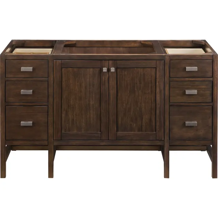 The Addison 60" Mid-Century Acacia Single Vanity Cabinet by James Martin Vanities gives you you a fresh take on Shaker-inspired design with a look of luxury. Handcrafted and gender-neutral, it fits effortlessly into modern or transitional rooms. The Shaker touch comes from the cabinet's distinct sides, drawers, and doors. Premium standard features include soft-close undermount drawer glides and adjustable door hinges, brushed aluminium laminate drawer bottoms, one 120 Volt UL rated electrical component with two electrical and two USB outlets, and one bamboo drawer organizer. The body of the cabinet is made of solid hardwood and sturdy panels of MDF.Two door Mid-Century Acacia single vanity cabinet with six drawers and interior shelf spaceHardware Finish: Burnished NickelSolid kiln-dried Grade A hardwoodCabinet is finished inside and out with a premium undercoat finish for superior moisture and UV resistancePremium soft-close door hinges and full-extension, soft-close, under-mount drawer slidesDrawer bottoms are lined with our signature brushed aluminum laminate for easy cleaningComes with a 120 UL-rated electrical component with dual power outlets and USB (Type A) portsOne bamboo drawer organizerCabinet only, countertop and sink not includedBring the simplicity of Shaker-inspired design to your bath with the fully modular Addison Collection by James Martin Vanities. Handcrafted with either solid poplar (bright white) or parawood (mid-century acacia) with a hand-applied finish. Each piece is finished inside and out for stand-alone application. Addison’s slim, strong lines will offer a substantial look and feel to any room as well as work with a wide variety of different decors. Square legs elevate the cabinet providing ample toe-kick space. This elegant modular collection comes in two incredible finishes: a rich, warm mid-century acacia accented with burnished nickel or a crisp, clean glossy white which is accented with polished chrome hardware. For the ultimate in versatility, the door panels reverse to textural cork with the mid-century acacia this comes in an elegant herringbone pattern whereas the bright white has a Casablanca cork pattern giving you two looks in one. The Addison Collection harmoniously blends the best of both contemporary and transitional looks evoking a sense of solace and relaxation.1 year warranty against manufacturer's defects. We will repair or replace any defective product, if the product is defective in material or workmanship at our discretion. No warranty is expressed or implied regarding damages resulting from consumer misuse.