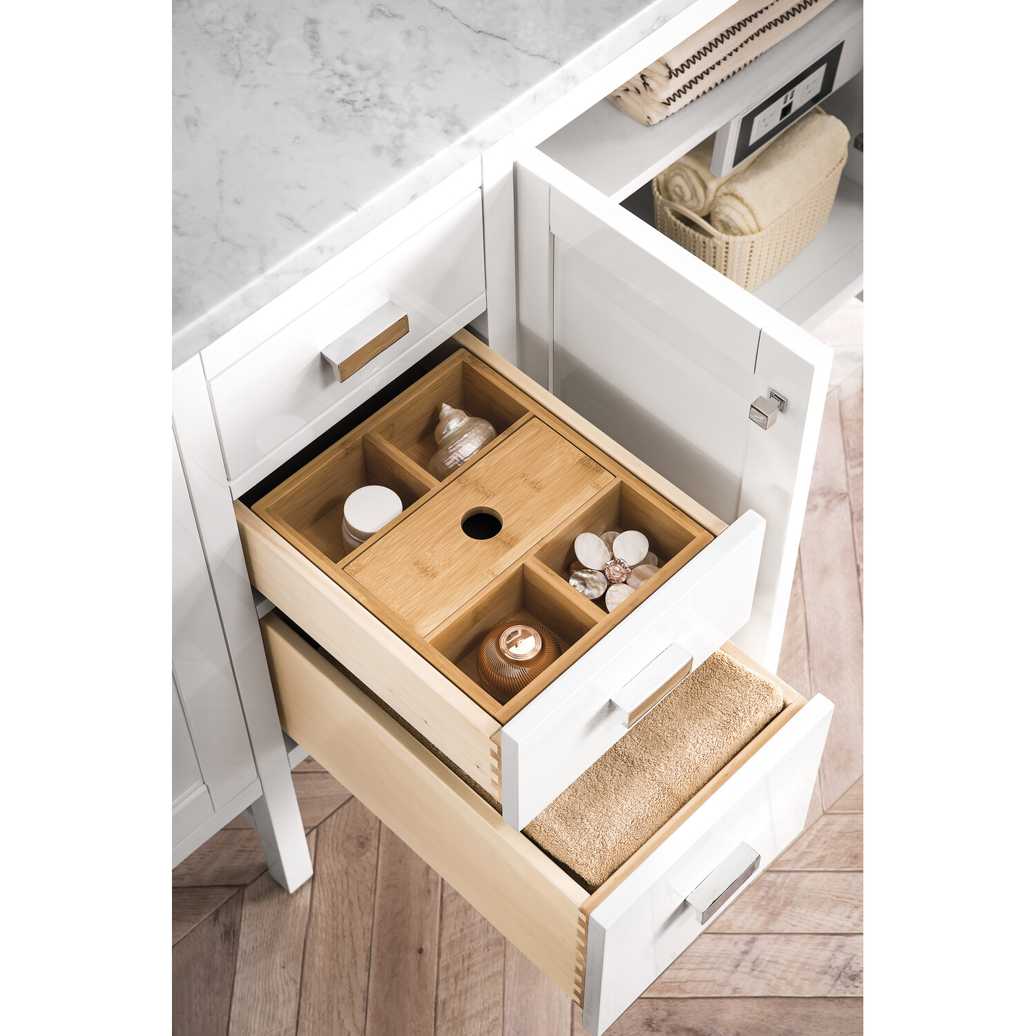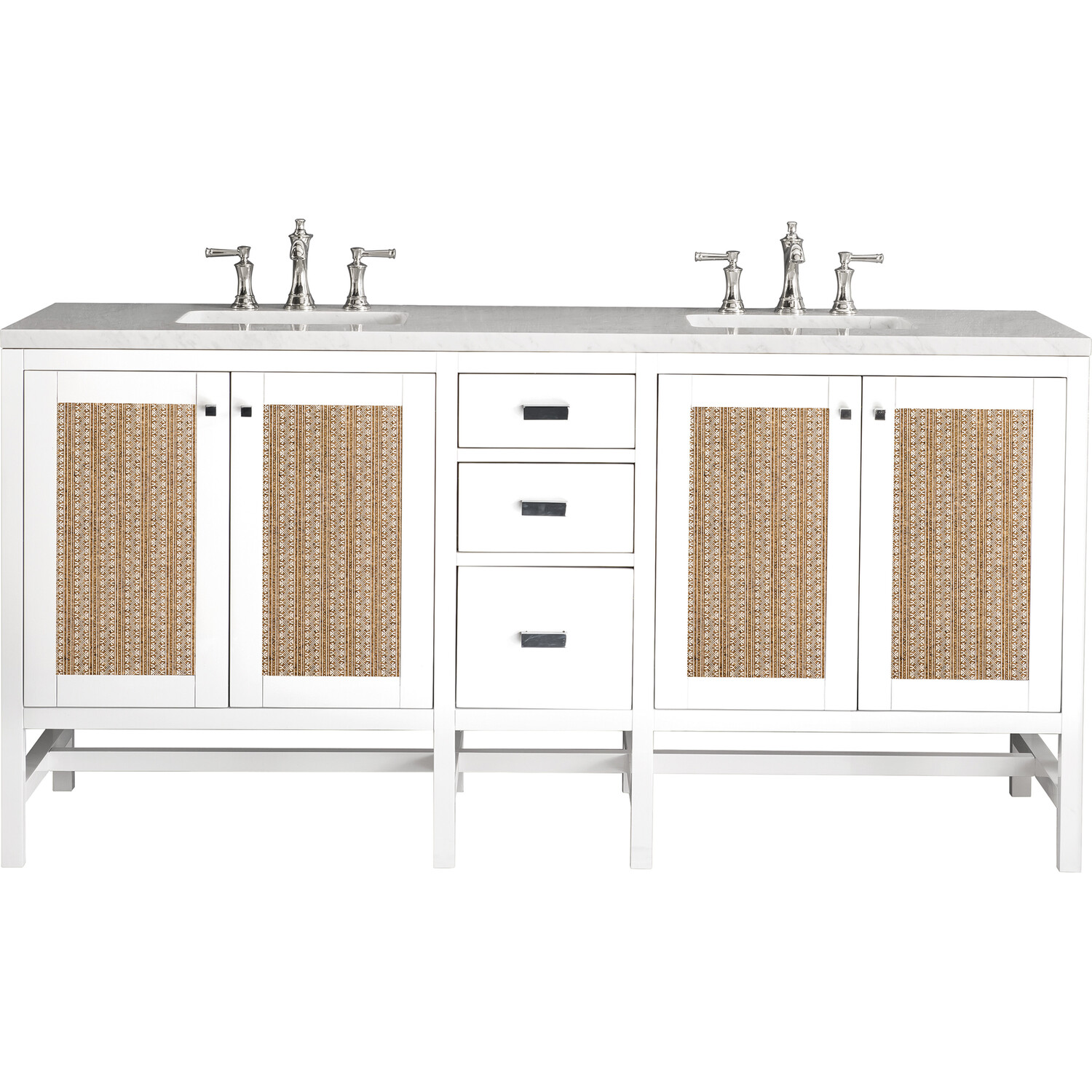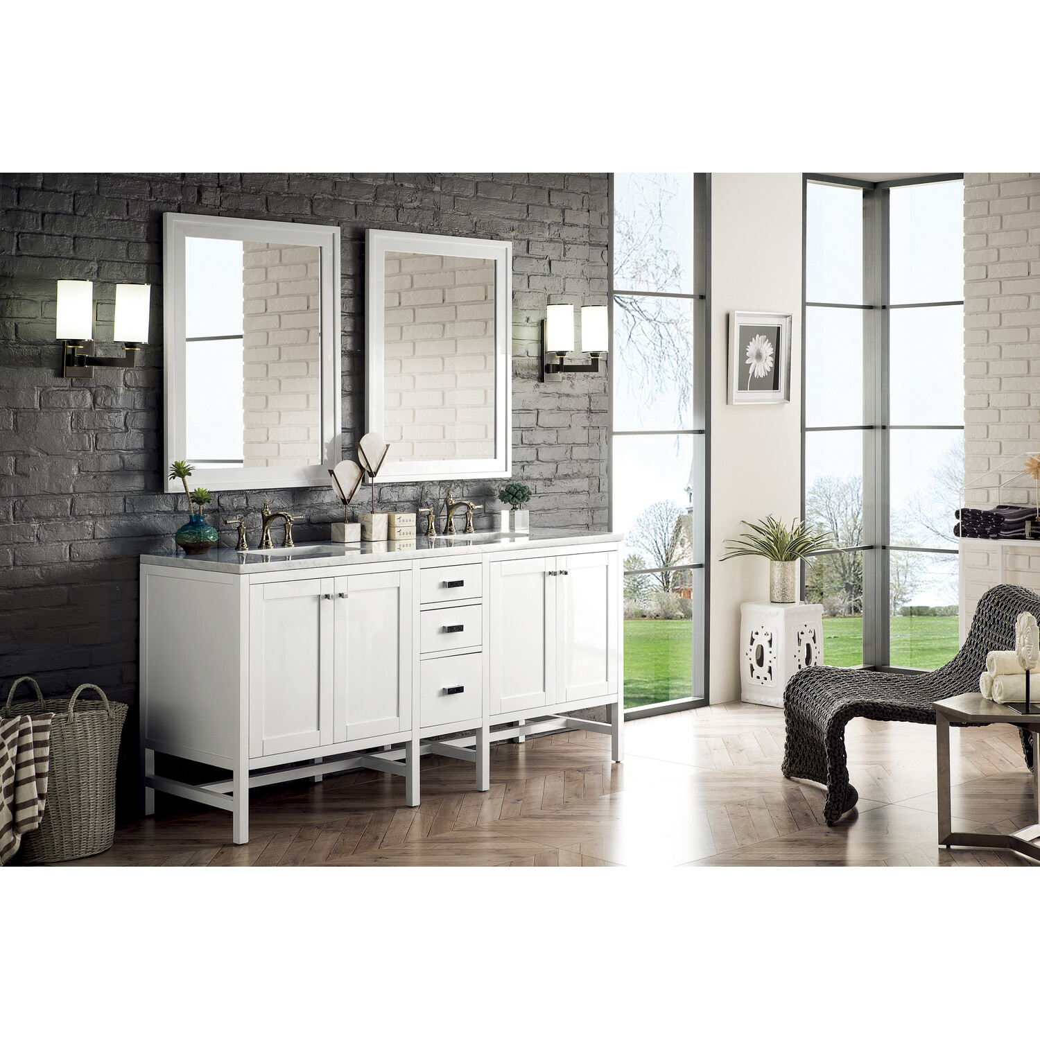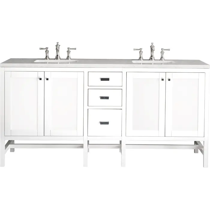 The Addison 72" Glossy White Double Vanity by James Martin Vanities gives you you a fresh take on Shaker-inspired design with a look of luxury. Handcrafted and gender-neutral, it fits effortlessly into modern or transitional rooms. The Shaker touch comes from the cabinet's distinct sides, drawers, and doors. Premium standard features include soft-close undermount drawer glides and adjustable door hinges, brushed aluminium laminate drawer bottoms, one 120 Volt UL rated electrical component with two electrical and two USB outlets, and one bamboo drawer organizer. The body of the cabinet is made of solid hardwood and sturdy panels of MDF. The look is completed with a 3 CM eased edge Arctic Fall Solid Surface top and two white ceramic rectangular sinks.Four door Glossy White single vanity with three drawers and interior shelf spaceHardware Finish: Polished ChromeSolid kiln-dried Grade A hardwoodCabinet is finished inside and out with a premium undercoat finish for superior moisture and UV resistancePremium soft-close door hinges and full-extension, soft-close, under-mount drawer slidesDrawer bottoms are lined with our signature brushed aluminum laminate for easy cleaningComes with a 120 UL-rated electrical component with dual power outlets and USB (Type A) portsOne bamboo drawer organizer3 cm eased edge Arctic Fall solid surface top and one white porcelain rectangular sinkFaucets sold separatelyThe countertop is pre-drilled for one 3-hole 8" widespreadBring the simplicity of Shaker-inspired design to your bath with the fully modular Addison Collection by James Martin Vanities. Handcrafted with either solid poplar (bright white) or parawood (mid-century acacia) with a hand-applied finish. Each piece is finished inside and out for stand-alone application. Addison’s slim, strong lines will offer a substantial look and feel to any room as well as work with a wide variety of different decors. Square legs elevate the cabinet providing ample toe-kick space. This elegant modular collection comes in two incredible finishes: a rich, warm mid-century acacia accented with burnished nickel or a crisp, clean glossy white which is accented with polished chrome hardware. For the ultimate in versatility, the door panels reverse to textural cork with the mid-century acacia this comes in an elegant herringbone pattern whereas the bright white has a Casablanca cork pattern giving you two looks in one. The Addison Collection harmoniously blends the best of both contemporary and transitional looks evoking a sense of solace and relaxation.1 year warranty against manufacturer's defects. We will repair or replace any defective product, if the product is defective in material or workmanship at our discretion. No warranty is expressed or implied regarding damages resulting from consumer misuse.