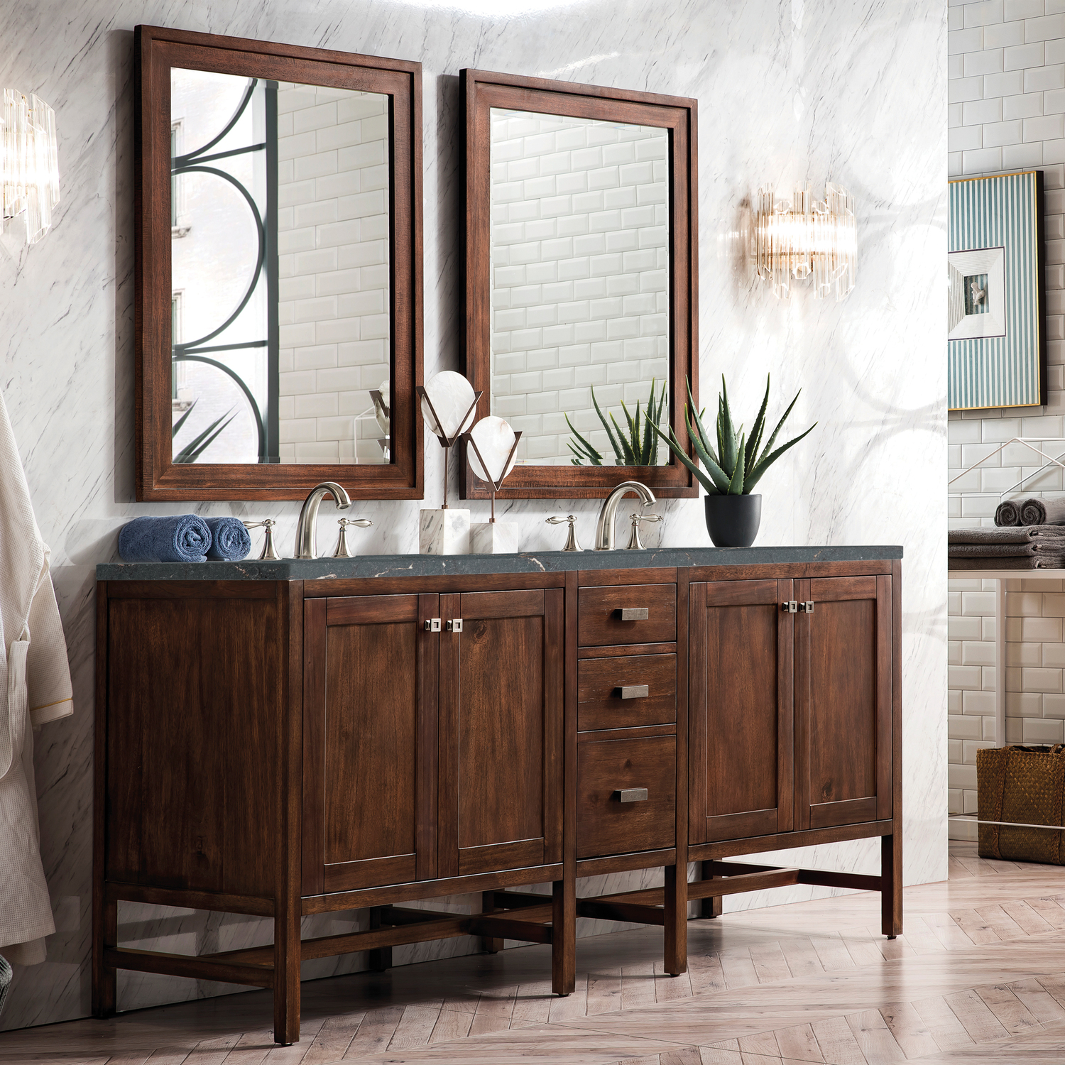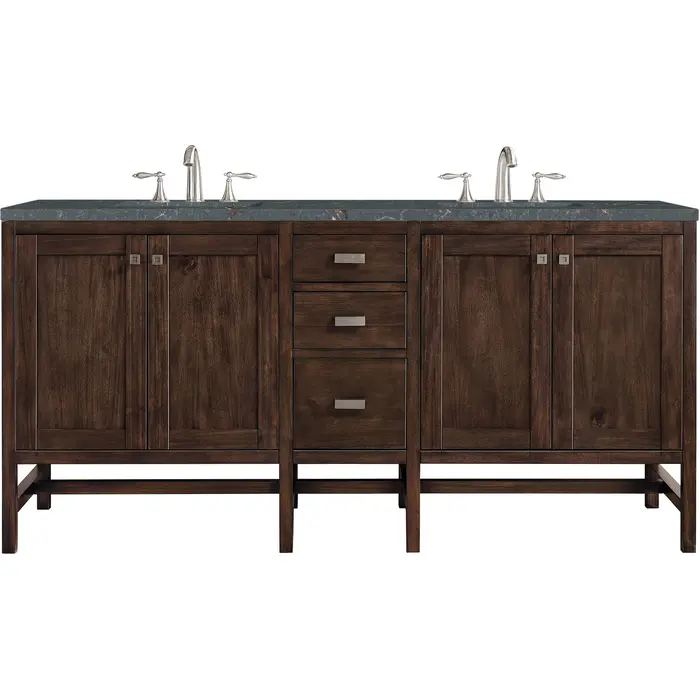 James Martin Addison 72 inch Double Vanity, Mid-Century Acacia w/ 3 CM Parisien Bleu Quartz Top, 840108968624, E444-V72-MCA-3PBL