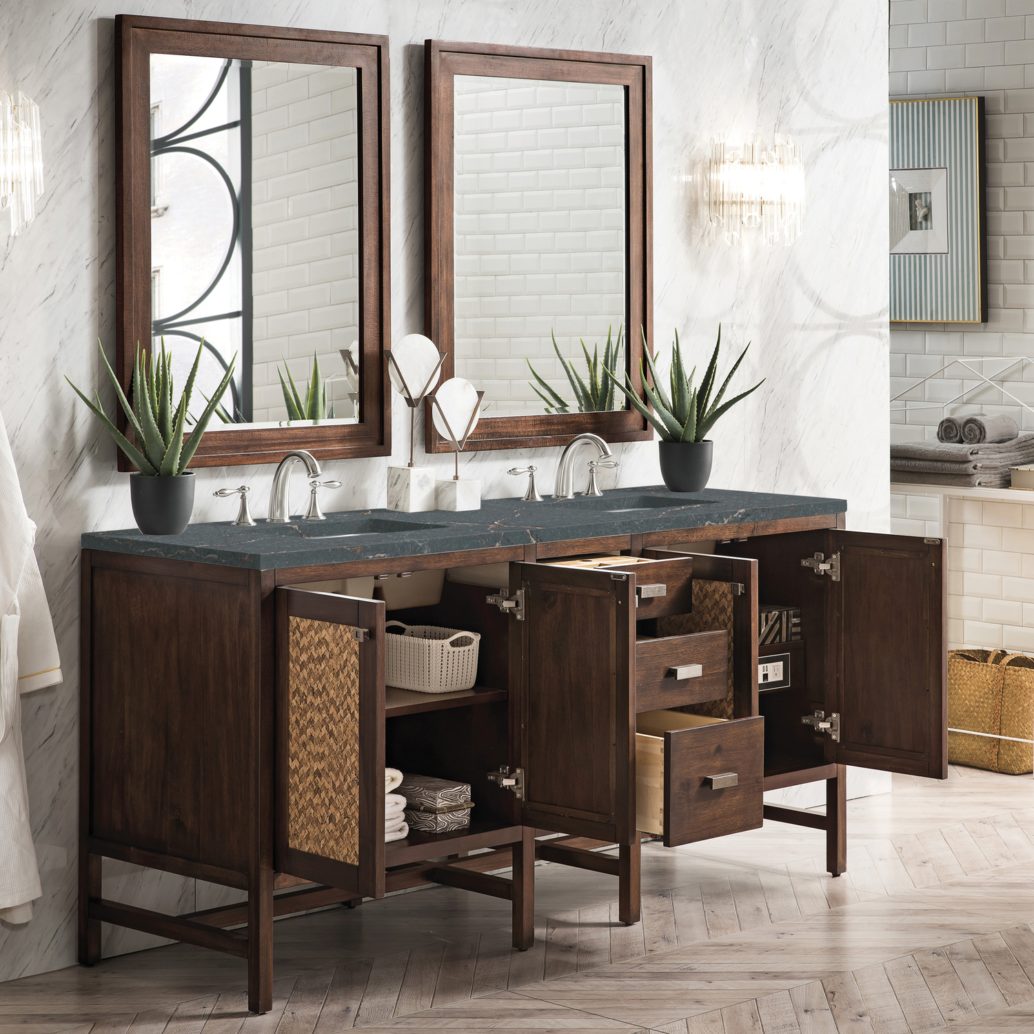 The Addison 72" Mid-Century Acacia Double Vanity by James Martin Vanities lends a fresh take on Shaker-inspired design with a look of luxury. Handcrafted and gender-neutral, it fits effortlessly into modern or transitional rooms. The Shaker touch comes from the cabinet's distinct sides, drawers, and doors. Premium standard features include soft-close undermount drawer glides and adjustable door hinges, brushed aluminum laminate drawer bottoms, one 120 Volt UL rated electrical component with two electrical and two USB outlets, and one bamboo drawer organizer. The wood finish is enhanced by the Parisien Bleu Silestone top, offering a deep bluish hue with broad and intricate neutral veins highlighted by fine coppery accents.Vanity set includes a 3cm eased edge Parisien Bleu Silestone top, which includes two white porcelain rectangular undermount sinks that ship separately, as well as mounting brackets for easy installation. The top is pre-drilled for two 8" widespread faucetFour-door single vanity cabinet with three drawers and interior shelf spaceConstructed of a Para wood and Yellow Poplar solid frame with Plywood and MDF panels covered with solid Mango wood veneers.Drawer boxes are constructed using English Dovetail joinery, feature soft-close undermount glides and a Brushed Aluminum laminate drawer bottom.Burnished Nickel hardwareIncludes one removable Bamboo drawer organizer trayIncludes a 120 UL-rated electrical component with dual power outlets and USB (Type A) portsFaucets sold separatelyCountertop is pre-drilled for one 3-hole 8" widespreadBring the simplicity of Shaker-inspired design to your bath with the fully modular Addison Collection by James Martin Vanities. Handcrafted with either solid poplar (bright white) or parawood (mid-century acacia) with a hand-applied finish. Each piece is finished inside and out for stand-alone application. Addison’s slim, strong lines will offer a substantial look and feel to any room as well as work with a wide variety of different decors. Square legs elevate the cabinet providing ample toe-kick space. This elegant modular collection comes in two incredible finishes: a rich, warm mid-century acacia accented with burnished nickel or a crisp, clean glossy white which is accented with polished chrome hardware. For the ultimate in versatility, the door panels reverse to textural cork with the mid-century acacia this comes in an elegant herringbone pattern whereas the bright white has a Casablanca cork pattern giving you two looks in one. The Addison Collection harmoniously blends the best of both contemporary and transitional looks evoking a sense of solace and relaxation.1 year warranty against manufacturer's defects. We will repair or replace any defective product, if the product is defective in material or workmanship at our discretion. No warranty is expressed or implied regarding damages resulting from consumer misuse.