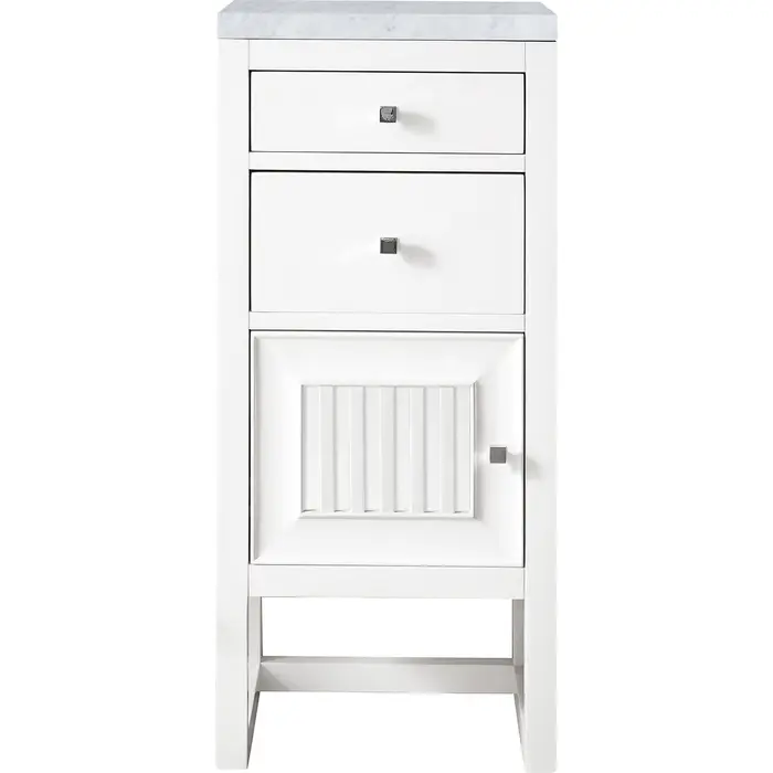 Bring a bit of the Greek Island home with the Athens 15” Glossy White Base Cabinet by James Martin Vanities. Part of the larger Athens modular collection, this incredible base cabinet boasts an impressive amount of storage space and combines traditional charm with modern functionality. Premium standard features include soft-close undermount drawer glides and adjustable door hinges, and brushed aluminium laminate drawer bottoms. This cabinet's door is left-facing, a right-facing option is available as well. The look is completed with a 3 CM eased edge Carrara Marble top.The Athens 15" base cabinet is available in two stunning finishes - glossy white and mid-century acacia, featuring two drawers and one cabinet for versatile storage.The glossy white vanity is adorned with sophisticated polished chrome hardware, while the mid-century acacia vanity is complemented with a vintage burnished bronze finish.Solid kiln-dried Grade A hardwoodCabinet is finished inside and out with a premium undercoat finish for superior moisture and UV resistanceSoft-close undermount drawer glides and soft-close door hingesDrawer bottoms are lined with our signature brushed aluminum laminate3 CM eased edge Carrara Marble top includedMake an elegant focal point in your bathroom with the Athens Collection by James Martin Vanities. This durably crafted solid wood collection features tons of roomy storage options behind its sleek modern design. Constructed by expert craftsmen, this collection incorporates a wide variety of different pieces to address your every need. Its beautiful raised panel doors come with vertical grooved opening that allows you to either have it’s normal elegant acacia paneling showing through or if you want reverse it and show off the unique cork look in between those grooves giving you a more transitional look. This unique modular vanity collection is comprised of several different size vanities, mirrors, drawer units, tables and cabinets constructed from solid poplar hardwood and completed in either a mid-century acacia or glossy white finish. These pieces can be topped by any one of our eight custom tops giving that perfect look you been looking for. Soft closing doors and drawers provide smooth and quiet operations, while burnished bronzed finished metal hardware provides the perfect finishing touch. Other fine details include white Ceramic sinks with overflow, dovetail joint drawer construction, predrilled holes to accommodate 8 in. widespread faucets, and multi-layer finish on the cabinets provide beauty and durability for years to come.1 year warranty against manufacturer's defects. We will repair or replace any defective product, if the product is defective in material or workmanship at our discretion. No warranty is expressed or implied regarding damages resulting from consumer misuse.