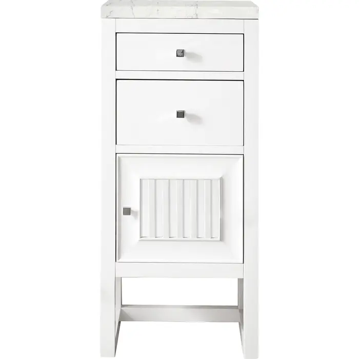 Bring a bit of the Greek Island home with the Athens 15” Glossy White Base Cabinet by James Martin Vanities. Part of the larger Athens modular collection, this incredible base cabinet boasts an impressive amount of storage space and combines traditional charm with modern functionality. Premium standard features include soft-close undermount drawer glides and adjustable door hinges, and brushed aluminium laminate drawer bottoms. This cabinet's door is right-facing, a left-facing option is available as well. The look is completed with a 3 CM eased edge Eternal Jasmine Pearl Silestone top.The Athens 15" base cabinet is available in two stunning finishes - glossy white and mid-century acacia, featuring two drawers and one cabinet for versatile storage.The glossy white vanity is adorned with sophisticated polished chrome hardware, while the mid-century acacia vanity is complemented with a vintage burnished bronze finish.Solid kiln-dried Grade A hardwoodCabinet is finished inside and out with a premium undercoat finish for superior moisture and UV resistanceSoft-close undermount drawer glides and soft-close door hingesDrawer bottoms are lined with our signature brushed aluminum laminate3 CM eased edge Eternal Jasmine Pearl Silestone top includedMake an elegant focal point in your bathroom with the Athens Collection by James Martin Vanities. This durably crafted solid wood collection features tons of roomy storage options behind its sleek modern design. Constructed by expert craftsmen, this collection incorporates a wide variety of different pieces to address your every need. Its beautiful raised panel doors come with vertical grooved opening that allows you to either have it’s normal elegant acacia paneling showing through or if you want reverse it and show off the unique cork look in between those grooves giving you a more transitional look. This unique modular vanity collection is comprised of several different size vanities, mirrors, drawer units, tables and cabinets constructed from solid poplar hardwood and completed in either a mid-century acacia or glossy white finish. These pieces can be topped by any one of our eight custom tops giving that perfect look you been looking for. Soft closing doors and drawers provide smooth and quiet operations, while burnished bronzed finished metal hardware provides the perfect finishing touch. Other fine details include white Ceramic sinks with overflow, dovetail joint drawer construction, predrilled holes to accommodate 8 in. widespread faucets, and multi-layer finish on the cabinets provide beauty and durability for years to come.1 year warranty against manufacturer's defects. We will repair or replace any defective product, if the product is defective in material or workmanship at our discretion. No warranty is expressed or implied regarding damages resulting from consumer misuse.