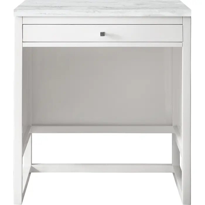 Bring a bit of the Greek Island home with the Athens 30” Glossy White Base Cabinet by James Martin Vanities. Part of the larger Athens modular collection, this incredible countertop unit boasts an impressive amount of storage space and combines traditional charm with modern functionality. Premium standard features include soft-close undermount drawer glides and a brushed aluminium laminate drawer bottom. The look is completed with a 3 CM eased edge Arctic Fall Solid Surface top.One drawer Glossy White countertop unit (makeup counter)Hardware Finish: Polished ChromeSolid kiln-dried Grade A hardwoodCabinet is finished inside and out with a premium undercoat finish for superior moisture and UV resistanceSoft-close undermount drawer glides3 CM eased edge Arctic Fall Solid Surface top includedMake an elegant focal point in your bathroom with the Athens Collection by James Martin Vanities. This durably crafted solid wood collection features tons of roomy storage options behind its sleek modern design. Constructed by expert craftsmen, this collection incorporates a wide variety of different pieces to address your every need. Its beautiful raised panel doors come with vertical grooved opening that allows you to either have it’s normal elegant acacia paneling showing through or if you want reverse it and show off the unique cork look in between those grooves giving you a more transitional look. This unique modular vanity collection is comprised of several different size vanities, mirrors, drawer units, tables and cabinets constructed from solid poplar hardwood and completed in either a mid-century acacia or glossy white finish. These pieces can be topped by any one of our eight custom tops giving that perfect look you been looking for. Soft closing doors and drawers provide smooth and quiet operations, while burnished bronzed finished metal hardware provides the perfect finishing touch. Other fine details include white Ceramic sinks with overflow, dovetail joint drawer construction, predrilled holes to accommodate 8 in. widespread faucets, and multi-layer finish on the cabinets provide beauty and durability for years to come.1 year warranty against manufacturer's defects. We will repair or replace any defective product, if the product is defective in material or workmanship at our discretion. No warranty is expressed or implied regarding damages resulting from consumer misuse.