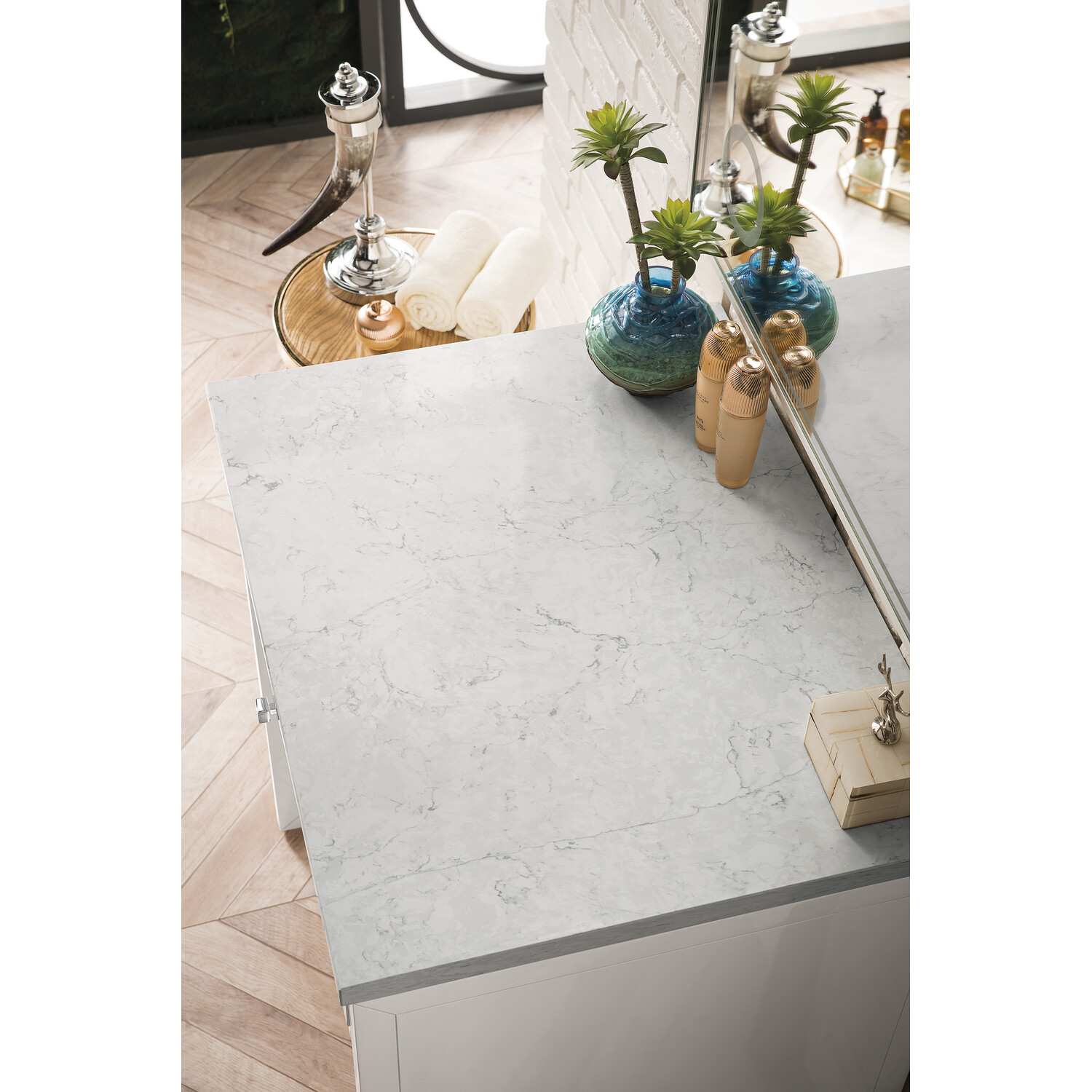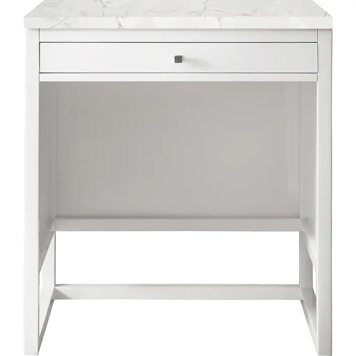 Bring a bit of the Greek Island home with the Athens 30” Glossy White Base Cabinet by James Martin Vanities. Part of the larger Athens modular collection, this incredible countertop unit boasts an impressive amount of storage space and combines traditional charm with modern functionality. Premium standard features include soft-close undermount drawer glides and a brushed aluminium laminate drawer bottom. The look is completed with a 3 CM eased edge Eternal Jasmine Pearl Silestone top.One drawer Glossy White countertop unit (makeup counter)Hardware Finish: Polished ChromeSolid kiln-dried Grade A hardwoodCabinet is finished inside and out with a premium undercoat finish for superior moisture and UV resistanceSoft-close undermount drawer glides3 CM eased edge Eternal Jasmine Pearl Silestone top includedMake an elegant focal point in your bathroom with the Athens Collection by James Martin Vanities. This durably crafted solid wood collection features tons of roomy storage options behind its sleek modern design. Constructed by expert craftsmen, this collection incorporates a wide variety of different pieces to address your every need. Its beautiful raised panel doors come with vertical grooved opening that allows you to either have it’s normal elegant acacia paneling showing through or if you want reverse it and show off the unique cork look in between those grooves giving you a more transitional look. This unique modular vanity collection is comprised of several different size vanities, mirrors, drawer units, tables and cabinets constructed from solid poplar hardwood and completed in either a mid-century acacia or glossy white finish. These pieces can be topped by any one of our eight custom tops giving that perfect look you been looking for. Soft closing doors and drawers provide smooth and quiet operations, while burnished bronzed finished metal hardware provides the perfect finishing touch. Other fine details include white Ceramic sinks with overflow, dovetail joint drawer construction, predrilled holes to accommodate 8 in. widespread faucets, and multi-layer finish on the cabinets provide beauty and durability for years to come.1 year warranty against manufacturer's defects. We will repair or replace any defective product, if the product is defective in material or workmanship at our discretion. No warranty is expressed or implied regarding damages resulting from consumer misuse.