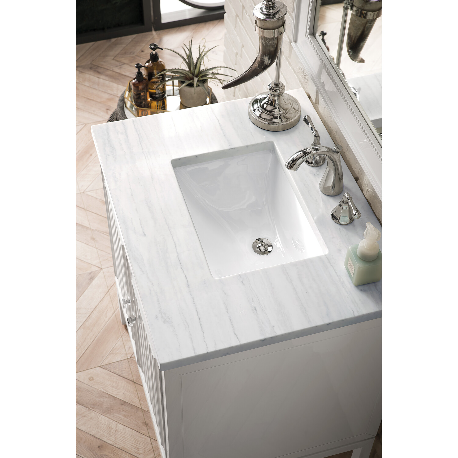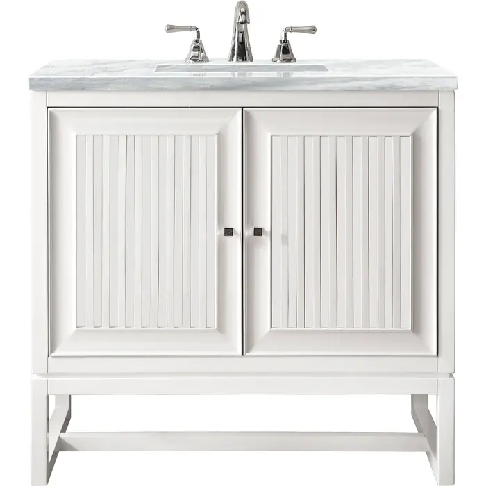 - Make an elegant focal point in your bathroom with the Athens Collection by James Martin Vanities. This durably crafted solid wood collection features tons of roomy storage options behind its sleek modern design. Constructed by expert craftsmen, this collection incorporates a wide variety of different pieces to address your every need. Its beautiful raised panel doors come with vertical grooved opening that allows you to either have it’s normal elegant acacia paneling showing through or if you want reverse it and show off the unique cork look in between those grooves giving you a more transitional look. This unique modular vanity collection is comprised of several different size vanities, mirrors, drawer units, tables and cabinets constructed from solid poplar hardwood and completed in either a mid-century acacia or glossy white finish. These pieces can be topped by any one of our eight custom tops giving that perfect look you been looking for. Soft closing doors and drawers provide smooth and quiet operations, while burnished bronzed finished metal hardware provides the perfect finishing touch. Other fine details include white Ceramic sinks with overflow, dovetail joint drawer construction, predrilled holes to accommodate 8 in. widespread faucets, and multi-layer finish on the cabinets provide beauty and durability for years to come.