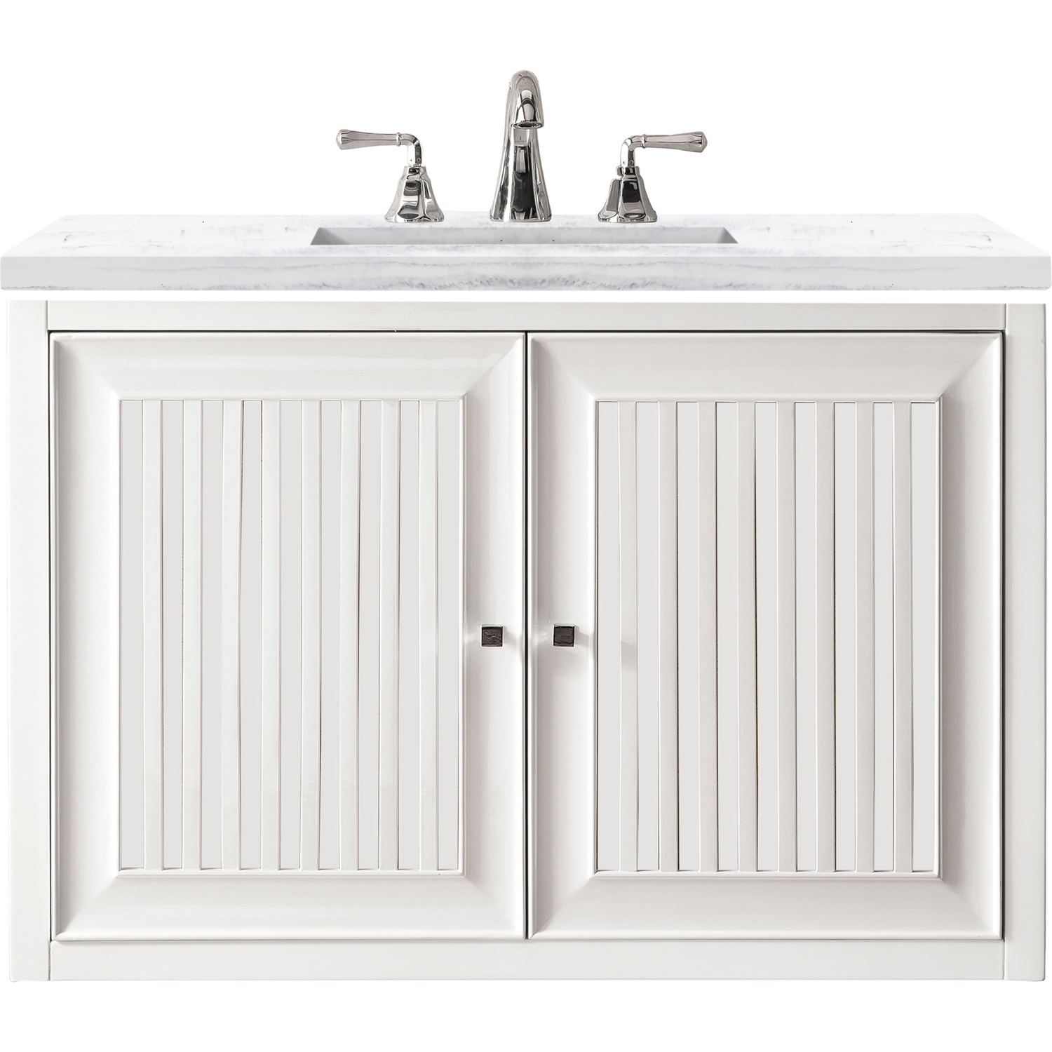 Bring a bit of the Greek Island home with the Athens 30” Glossy White Single Vanity by James Martin Vanities. Part of the larger Athens modular collection, this incredible Vanity boasts an impressive amount of storage space and combines traditional charm with modern functionality. Premium standard features include soft-close undermount drawer glides and adjustable door hinges, a brushed aluminium laminate drawer bottom, and one bamboo drawer organizer. The look is completed with a 3 CM eased edge Arctic Fall Solid Surface top and one white ceramic rectangular sink.One door Glossy White single vanity with two interior drawers and shelf spaceHardware Finish: Polished ChromeSolid kiln-dried Grade A hardwoodCabinet is finished inside and out with a premium undercoat finish for superior moisture and UV resistanceSoft-close undermount drawer glides and soft-close door hingesDrawer bottoms are lined with our signature brushed aluminum laminateOne 120 Volt UL rated electrical component with two electrical and two USB (2.0) outlets3 CM eased edge Arctic Fall Solid Surface top and one white porcelain rectangular sinkCountertop is pre-drilled for one 3-hole 8" spreadThis cabinet can be wall-hung, legs are removable; mounting hardware includedFaucet sold separatelyMake an elegant focal point in your bathroom with the Athens Collection by James Martin Vanities. This durably crafted solid wood collection features tons of roomy storage options behind its sleek modern design. Constructed by expert craftsmen, this collection incorporates a wide variety of different pieces to address your every need. Its beautiful raised panel doors come with vertical grooved opening that allows you to either have it’s normal elegant acacia paneling showing through or if you want reverse it and show off the unique cork look in between those grooves giving you a more transitional look. This unique modular vanity collection is comprised of several different size vanities, mirrors, drawer units, tables and cabinets constructed from solid poplar hardwood and completed in either a mid-century acacia or glossy white finish. These pieces can be topped by any one of our eight custom tops giving that perfect look you been looking for. Soft closing doors and drawers provide smooth and quiet operations, while burnished bronzed finished metal hardware provides the perfect finishing touch. Other fine details include white Ceramic sinks with overflow, dovetail joint drawer construction, predrilled holes to accommodate 8 in. widespread faucets, and multi-layer finish on the cabinets provide beauty and durability for years to come.1 year warranty against manufacturer's defects. We will repair or replace any defective product, if the product is defective in material or workmanship at our discretion. No warranty is expressed or implied regarding damages resulting from consumer misuse.