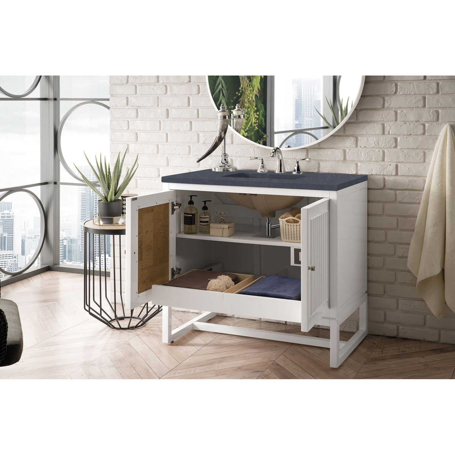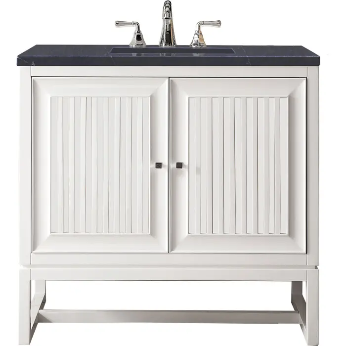 Bring a bit of the Greek Island home with the Athens 36” Glossy White Single Vanity by James Martin Vanities. Part of the larger Athens modular collection, this incredible Vanity boasts an impressive amount of storage space and combines traditional charm with modern functionality. Premium standard features include soft-close undermount drawer glides and adjustable door hinges, brushed aluminium laminate drawer bottoms, and one bamboo drawer organizer. The look is completed with a 3 CM eased edge Charcoal Soapstone Silestone top and one white ceramic rectangular sink.One door Glossy White single vanity with two interior drawers and shelf spaceHardware Finish: Polished ChromeSolid kiln-dried Grade A hardwoodCabinet is finished inside and out with a premium undercoat finish for superior moisture and UV resistanceSoft-close undermount drawer glides and soft-close door hingesDrawer bottoms are lined with our signature brushed aluminum laminateOne 120 Volt UL rated electrical component with two electrical and two USB (2.0) outlets3 CM eased edge Charcoal Soapstone Silestone top and one white porcelain rectangular sinkCountertop is pre-drilled for one 3-hole 8" spreadThis cabinet can be wall-hung, legs are removable; mounting hardware includedFaucet sold separatelyMake an elegant focal point in your bathroom with the Athens Collection by James Martin Vanities. This durably crafted solid wood collection features tons of roomy storage options behind its sleek modern design. Constructed by expert craftsmen, this collection incorporates a wide variety of different pieces to address your every need. Its beautiful raised panel doors come with vertical grooved opening that allows you to either have it’s normal elegant acacia paneling showing through or if you want reverse it and show off the unique cork look in between those grooves giving you a more transitional look. This unique modular vanity collection is comprised of several different size vanities, mirrors, drawer units, tables and cabinets constructed from solid poplar hardwood and completed in either a mid-century acacia or glossy white finish. These pieces can be topped by any one of our eight custom tops giving that perfect look you been looking for. Soft closing doors and drawers provide smooth and quiet operations, while burnished bronzed finished metal hardware provides the perfect finishing touch. Other fine details include white Ceramic sinks with overflow, dovetail joint drawer construction, predrilled holes to accommodate 8 in. widespread faucets, and multi-layer finish on the cabinets provide beauty and durability for years to come.1 year warranty against manufacturer's defects. We will repair or replace any defective product, if the product is defective in material or workmanship at our discretion. No warranty is expressed or implied regarding damages resulting from consumer misuse.